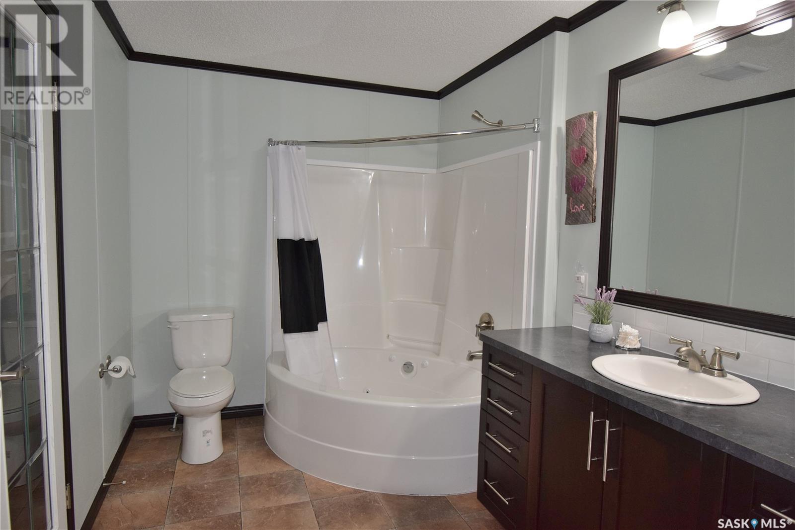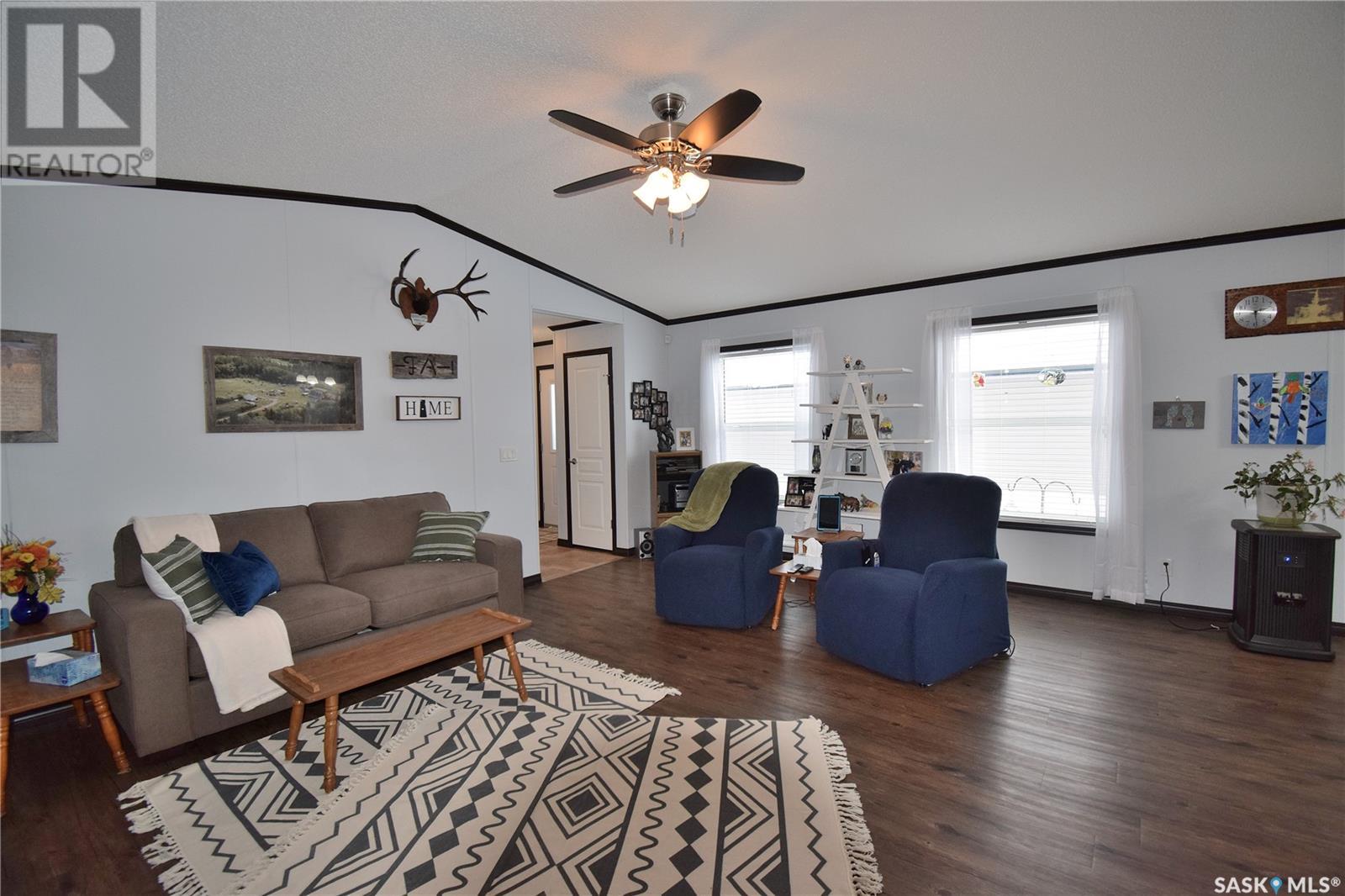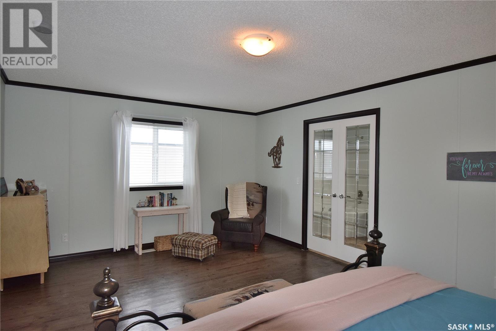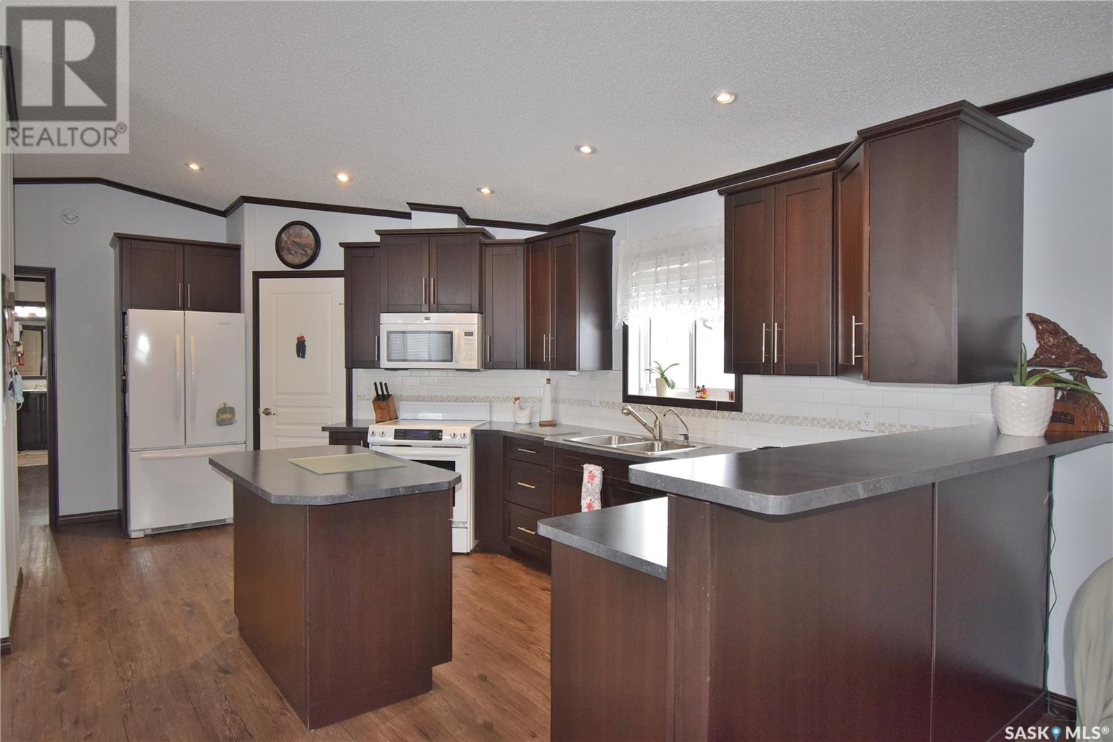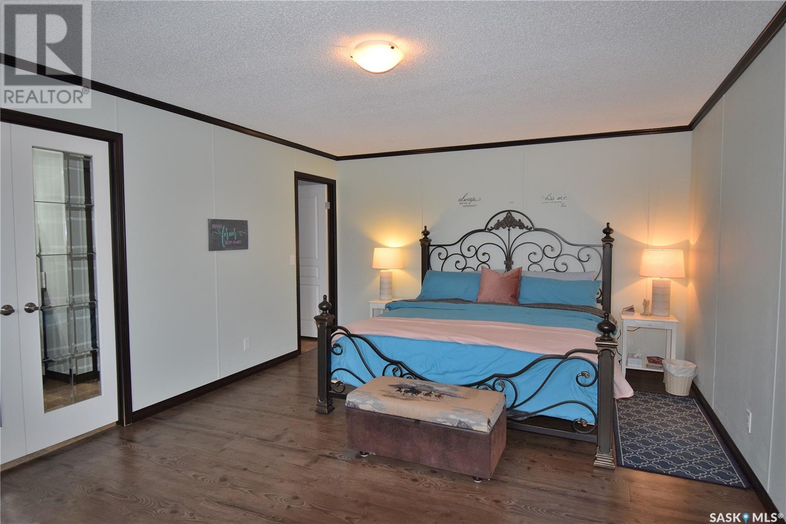 Meticulously kept home in the thriving community of Shellbrook! Ideally located on a 0.21 acre lot on the edge of town. This 1520 square foot home was built in 2014 and is in like new condition. Open concept living room, kitchen and dining area. The kitchen provides an island, breakfast bar and pantry. Huge master bedroom with walk-in closet and French doors opening to an ensuite with jacuzzi tub. Two additional bedrooms and full bath. Vinyl plank flooring throughout most of the house. Central air, alarm system, reverse osmosis system and water softener. Heated 24’ x 26’ detached garage with drive through door was built in 2021. There is a spacious deck with ramp, storage shed & raised garden beds. (id:22211)