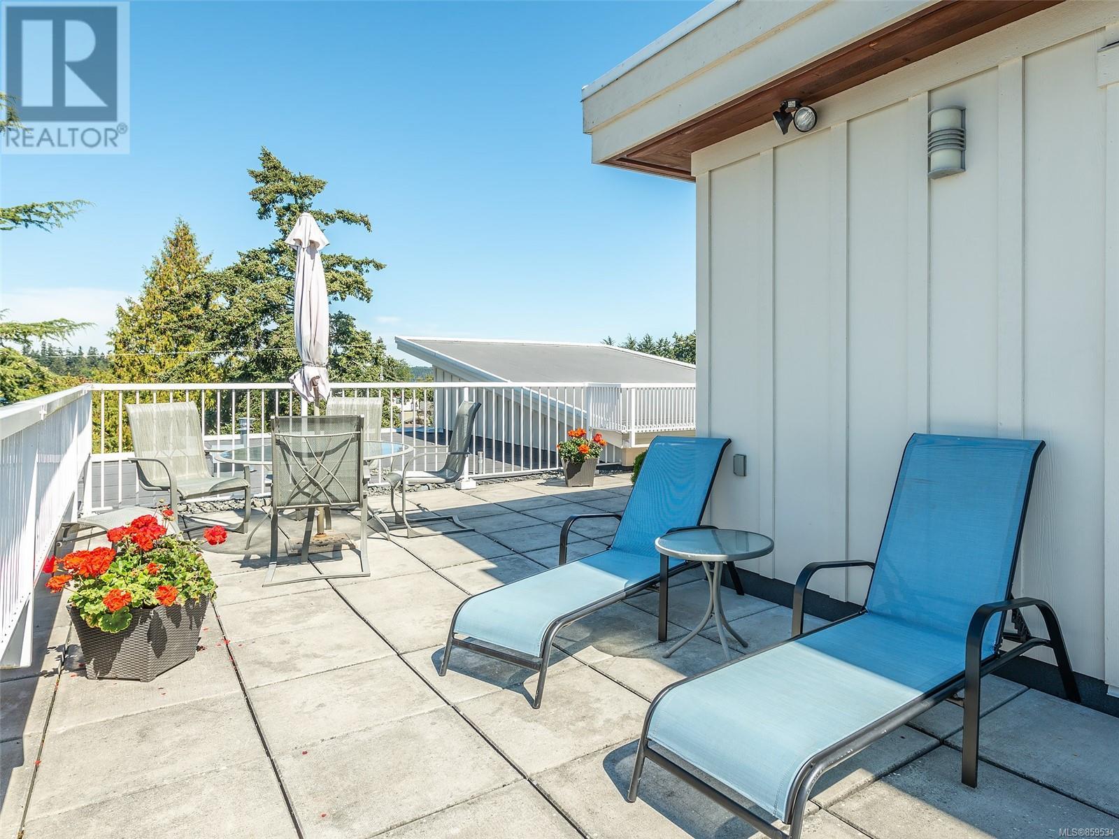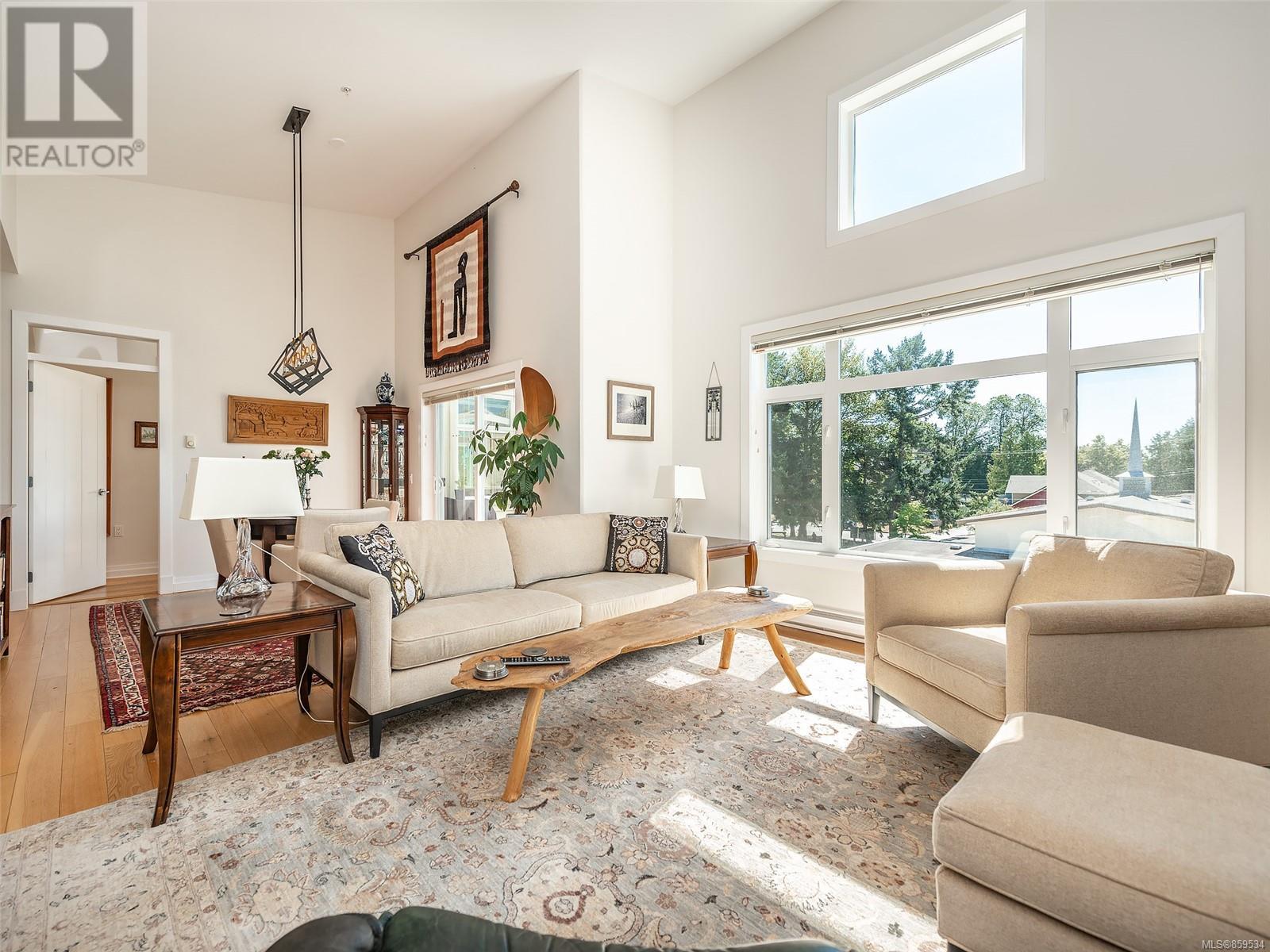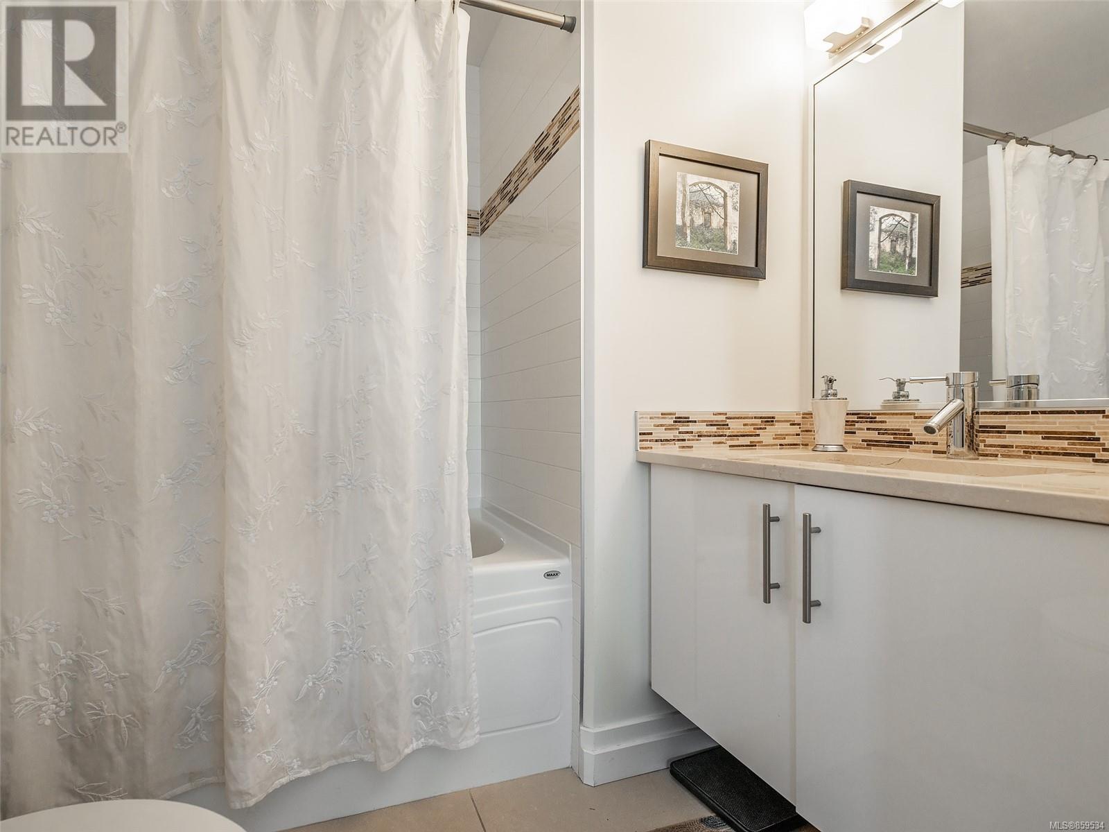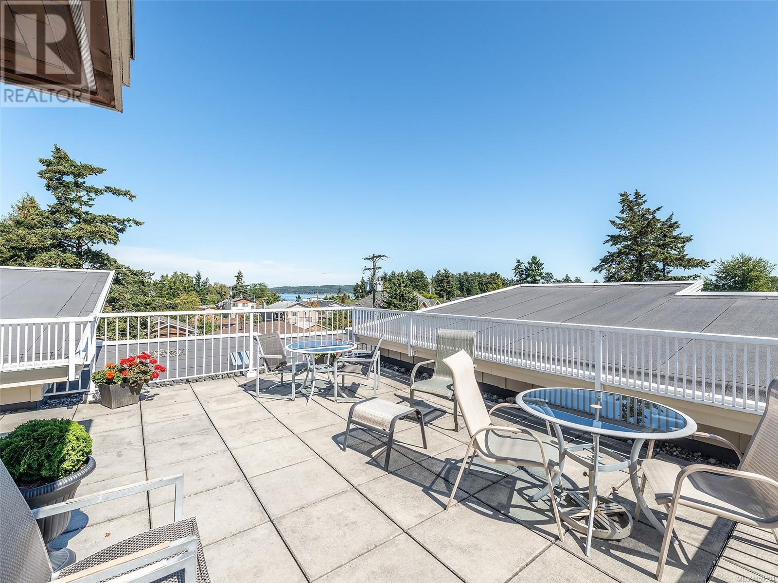 Incredibly bright & spacious, this top floor 2 bed, 2 bath home nearly 1200sqft of finished living space is modern and immaculate, boasting 14ft ceilings in its main living space. South-West facing with massive windows and mountain views, each room is sun-soaked, includ. the 2 balconies featured in this unit. Step in to find the laundry room/den on the right hand side - a perfect spot for extra storage or work from home. Appreciate privacy with the split-bedroom layout. Each bedroom is generous-sized, with the master's ensuite including a separate tub and shower design. The main living space in between uses open-concept, combining the kitchen to the living & dining areas. The 14ft ceilings are the highlight of this space, while the fireplace creates a cozy feel. This building features a rooftop patio with spectacular ocean views & surrounding area. Best of all, this unit is within walking distance of Downtown Sidney and the seaside! Bike storage & a covered parking spot included! (id:22211)