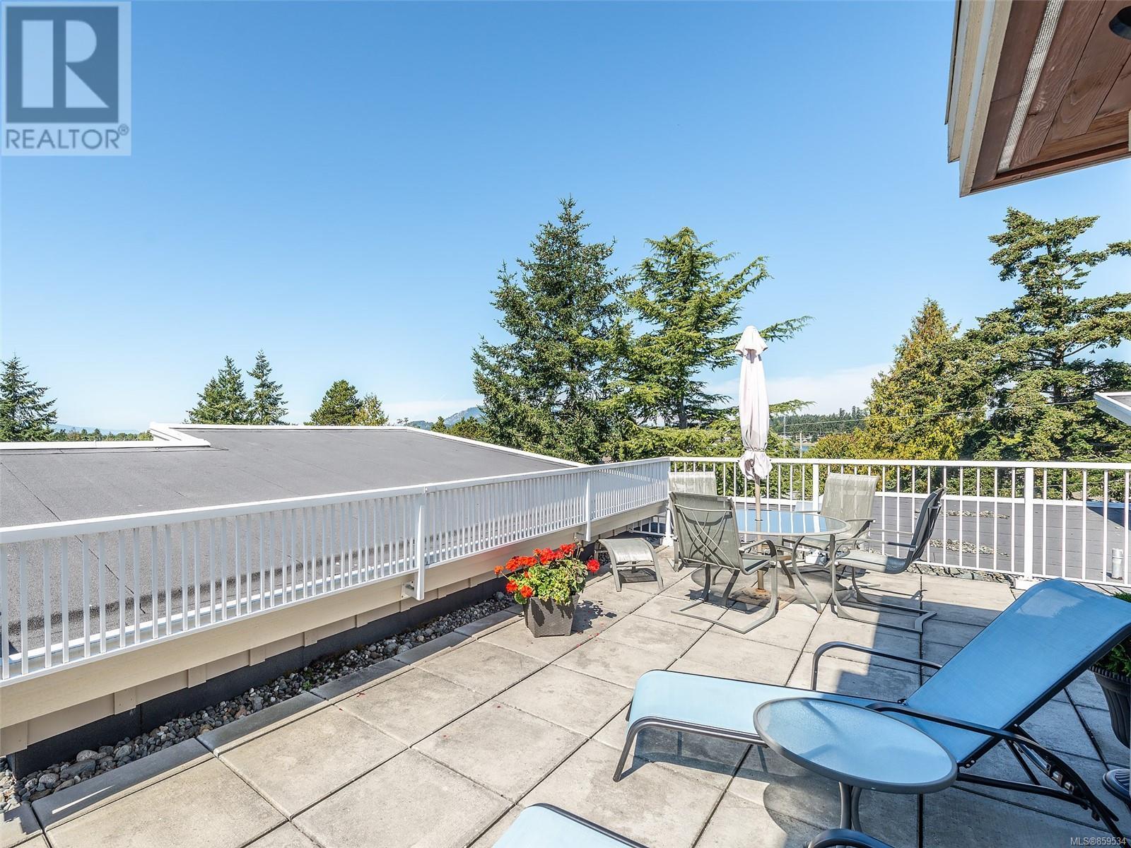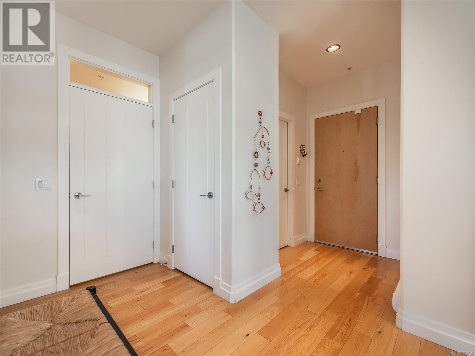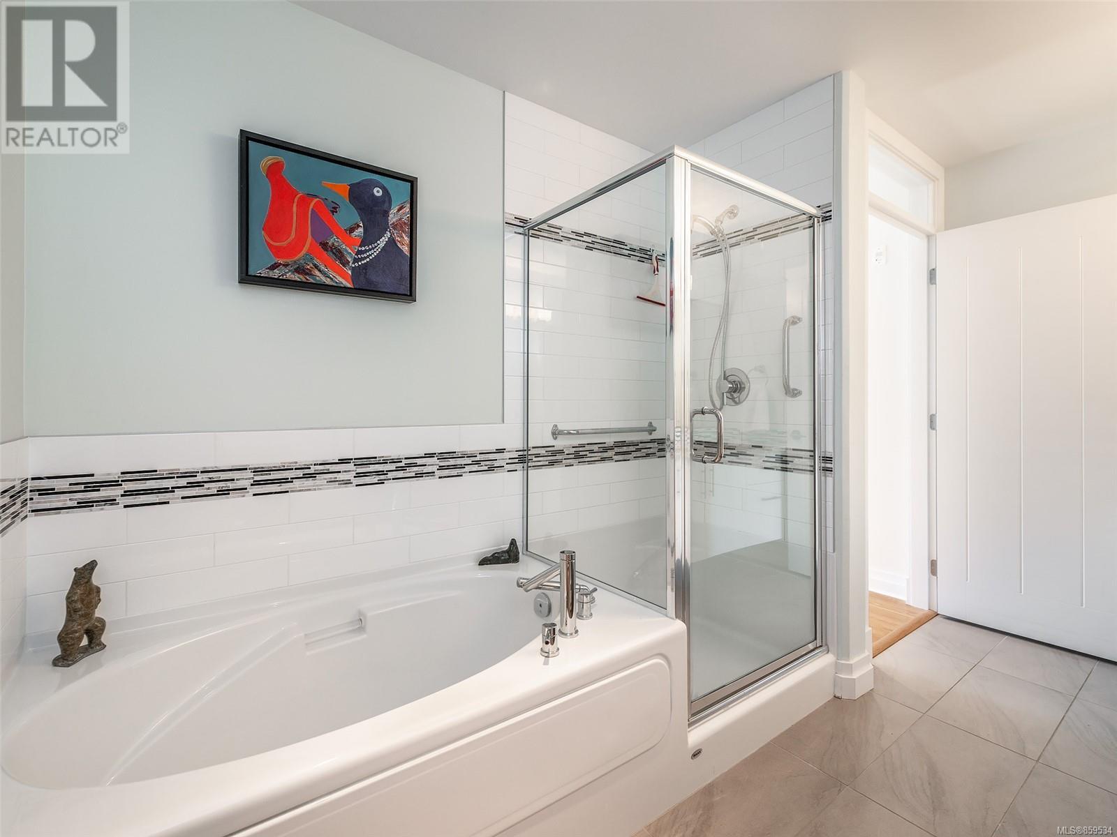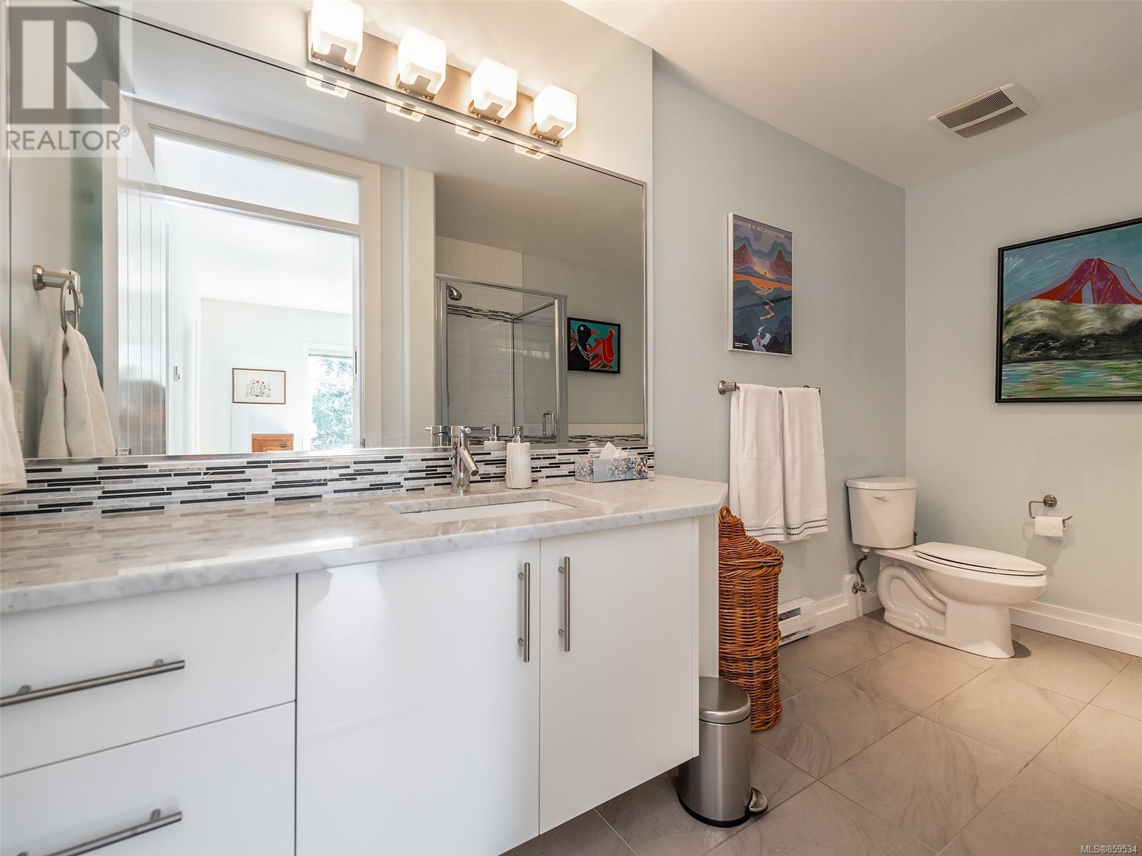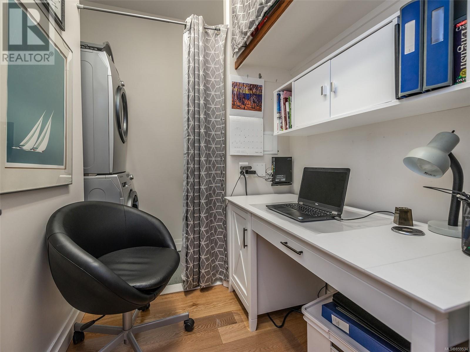 Incredibly bright & spacious, this top floor 2 bed, 2 bath home nearly 1200sqft of finished living space is modern and immaculate, boasting 14ft ceilings in its main living space. South-West facing with massive windows and mountain views, each room is sun-soaked, includ. the 2 balconies featured in this unit. Step in to find the laundry room/den on the right hand side - a perfect spot for extra storage or work from home. Appreciate privacy with the split-bedroom layout. Each bedroom is generous-sized, with the master's ensuite including a separate tub and shower design. The main living space in between uses open-concept, combining the kitchen to the living & dining areas. The 14ft ceilings are the highlight of this space, while the fireplace creates a cozy feel. This building features a rooftop patio with spectacular ocean views & surrounding area. Best of all, this unit is within walking distance of Downtown Sidney and the seaside! Bike storage & a covered parking spot included! (id:22211)