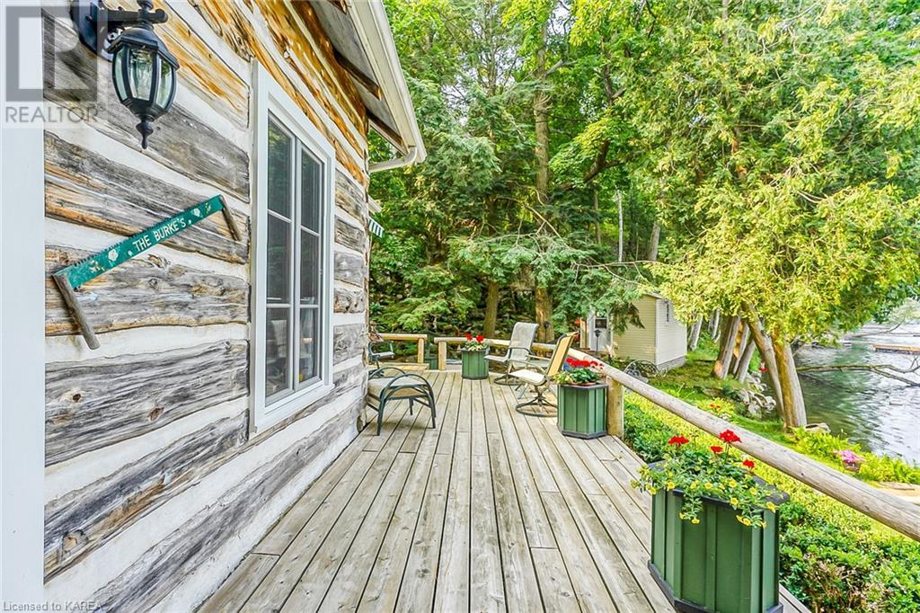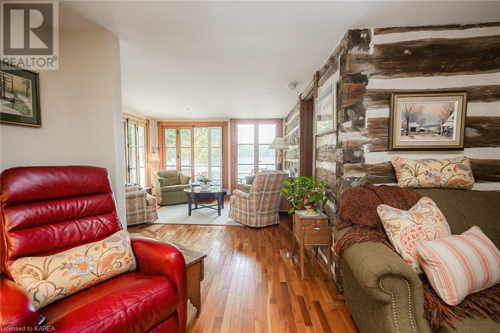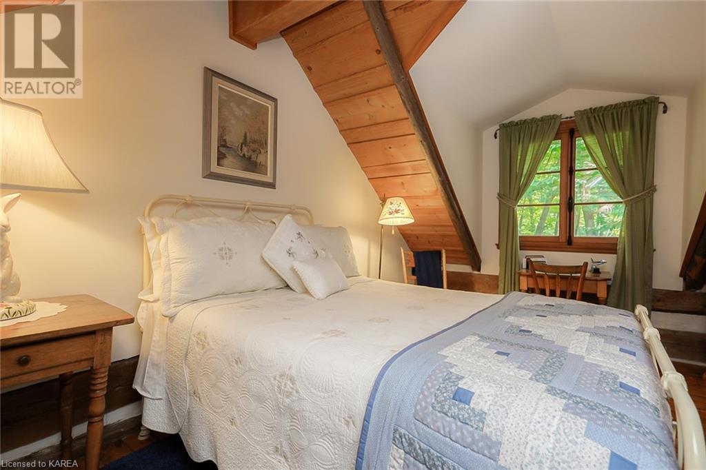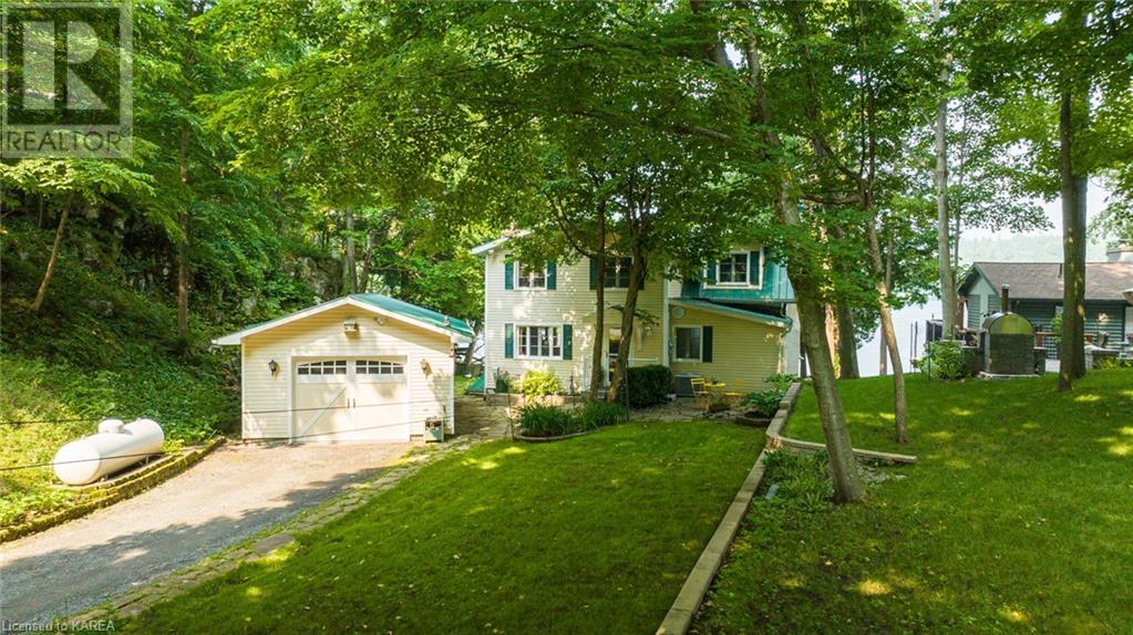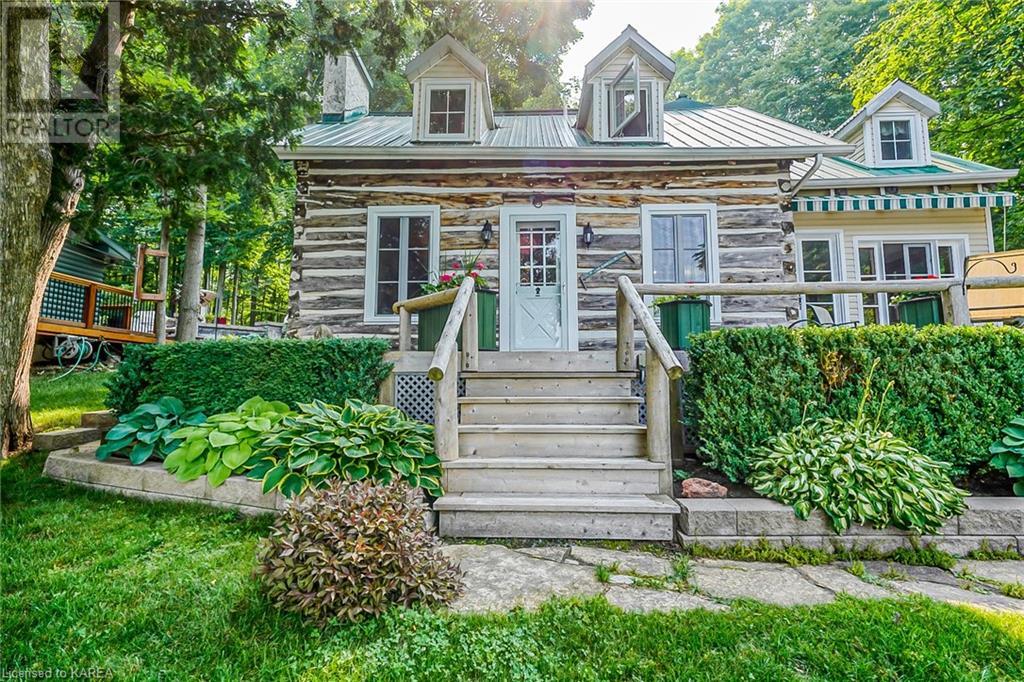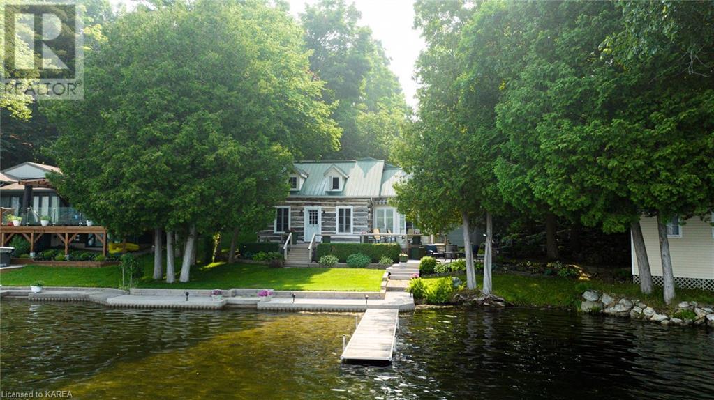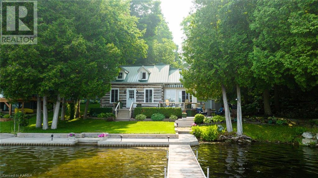 Welcome to your dream lakeside home on Buck Lake! This meticulously restored and renovated mid-1800s log cabin with a tasteful addition, offers the perfect blend of rustic charm and modern comforts (a new A/C only last year) and is situated only steps from the stunning waterfront. This 3-bedroom, 1-bathroom home is an absolute gem. The property is the perfect place to escape the city, located so close to both Kingston (30 mins) and Westport (15 mins). A single car, drive-through garage provides convenient parking for your vehicle and additional space for the garden and water toys, as does the sizable detached shed. The 100' of waterfront is so lovely, with a concrete retaining wall and a spot to moor the boat, right at the dock. Inside you'll be greeted by a warm and inviting ambience. Abundant natural light floods the interior, highlighting the beauty of the cherry wood hardwood floors and the beautifully restored windows by MQ Windows. The main floor provides plenty of space, offering a front living room, a rear sunroom overlooking the picture perfect waterfront, and the family room where you can cozy up by the fire on chilly nights. The kitchen is neat and sweet and opens to the dining area. The updated bath and laundry area round out the main floor. Upstairs are three sizable bedrooms, each offering impressive views; whether it's a garden view or a lake view, you won’t be disappointed! The basement was smartly dug deeper, providing ample height and an incredible storage area with a small workshop to tinker away. It's just steps to the water from the multi decks, where you will find the incredibly peaceful space to entertain or to just enjoy the tranquility of nature. The perennial gardens and attention to landscaping is simply amazing, and this restored log cabin and its surroundings provide the best of both worlds- the charm of a past era while boasting the comforts of modern living. It is pristine and a one of a kind property that should not be missed! (id:22211)