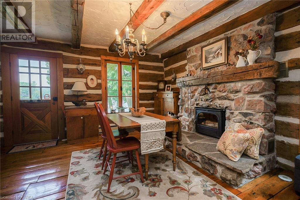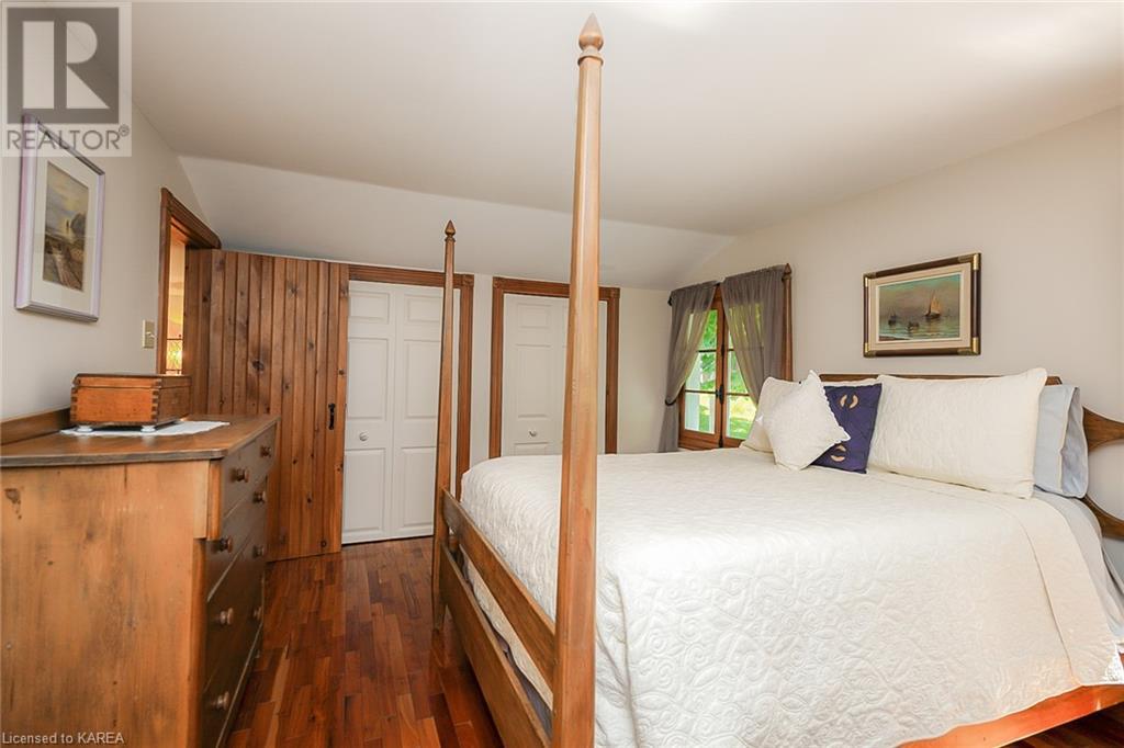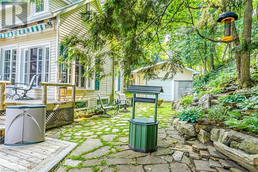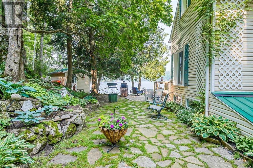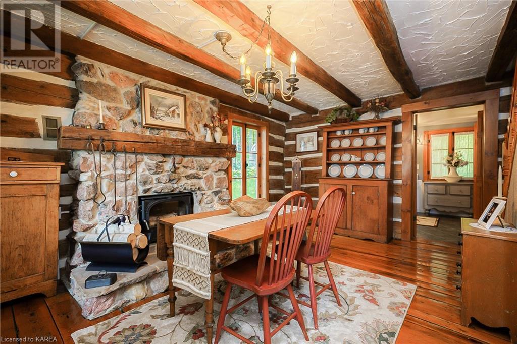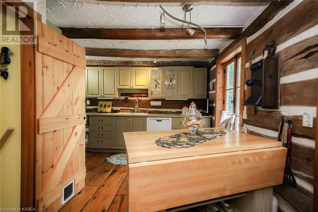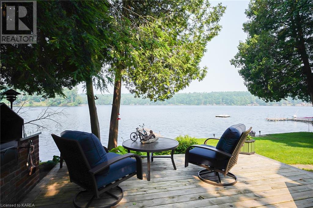 Welcome to your dream lakeside home on Buck Lake! This meticulously restored and renovated mid-1800s log cabin with a tasteful addition, offers the perfect blend of rustic charm and modern comforts (a new A/C only last year) and is situated only steps from the stunning waterfront. This 3-bedroom, 1-bathroom home is an absolute gem. The property is the perfect place to escape the city, located so close to both Kingston (30 mins) and Westport (15 mins). A single car, drive-through garage provides convenient parking for your vehicle and additional space for the garden and water toys, as does the sizable detached shed. The 100' of waterfront is so lovely, with a concrete retaining wall and a spot to moor the boat, right at the dock. Inside you'll be greeted by a warm and inviting ambience. Abundant natural light floods the interior, highlighting the beauty of the cherry wood hardwood floors and the beautifully restored windows by MQ Windows. The main floor provides plenty of space, offering a front living room, a rear sunroom overlooking the picture perfect waterfront, and the family room where you can cozy up by the fire on chilly nights. The kitchen is neat and sweet and opens to the dining area. The updated bath and laundry area round out the main floor. Upstairs are three sizable bedrooms, each offering impressive views; whether it's a garden view or a lake view, you won’t be disappointed! The basement was smartly dug deeper, providing ample height and an incredible storage area with a small workshop to tinker away. It's just steps to the water from the multi decks, where you will find the incredibly peaceful space to entertain or to just enjoy the tranquility of nature. The perennial gardens and attention to landscaping is simply amazing, and this restored log cabin and its surroundings provide the best of both worlds- the charm of a past era while boasting the comforts of modern living. It is pristine and a one of a kind property that should not be missed! (id:22211)