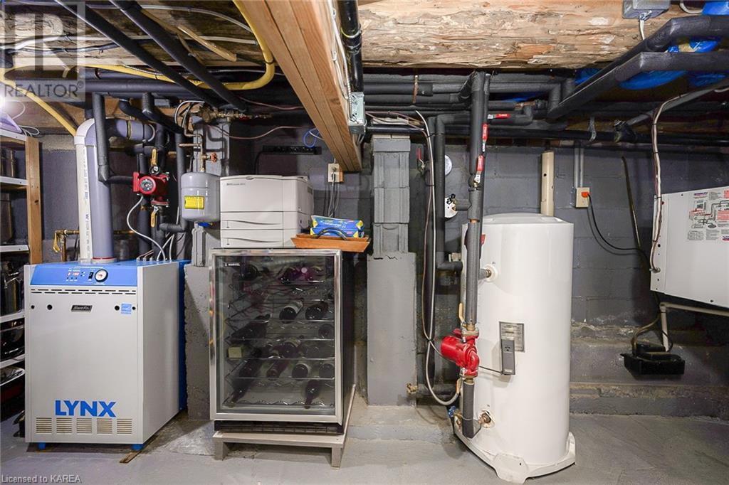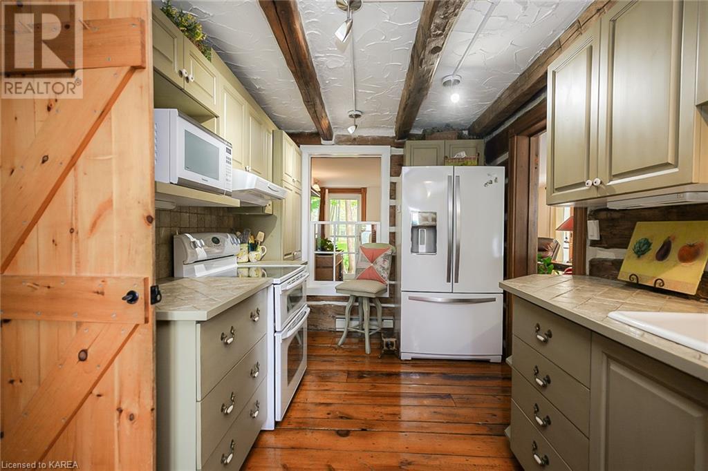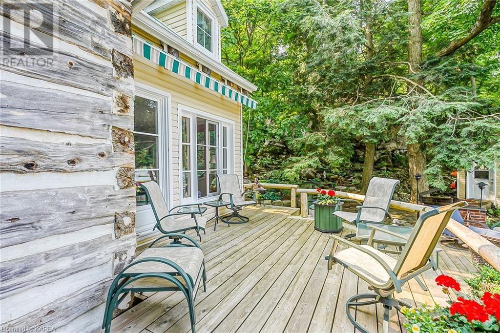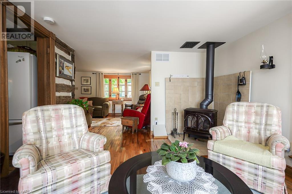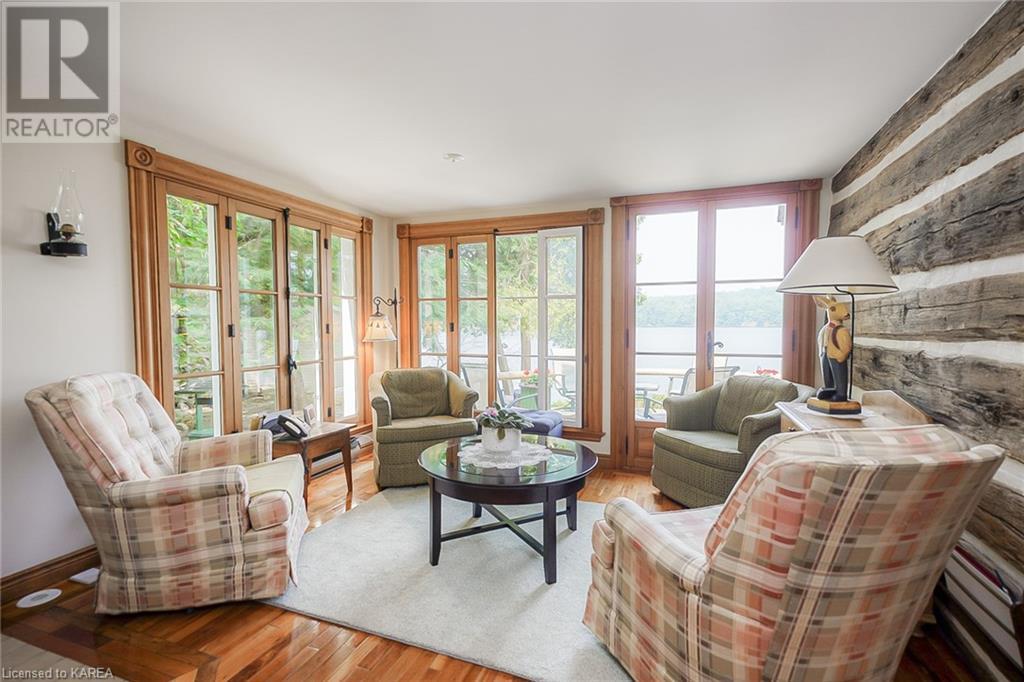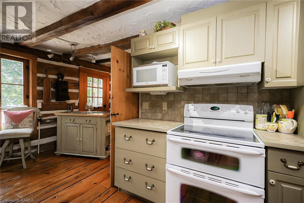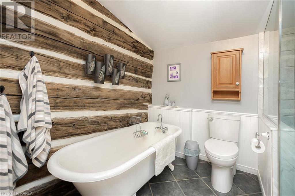 Welcome to your dream lakeside home on Buck Lake! This meticulously restored and renovated mid-1800s log cabin with a tasteful addition, offers the perfect blend of rustic charm and modern comforts (a new A/C only last year) and is situated only steps from the stunning waterfront. This 3-bedroom, 1-bathroom home is an absolute gem. The property is the perfect place to escape the city, located so close to both Kingston (30 mins) and Westport (15 mins). A single car, drive-through garage provides convenient parking for your vehicle and additional space for the garden and water toys, as does the sizable detached shed. The 100' of waterfront is so lovely, with a concrete retaining wall and a spot to moor the boat, right at the dock. Inside you'll be greeted by a warm and inviting ambience. Abundant natural light floods the interior, highlighting the beauty of the cherry wood hardwood floors and the beautifully restored windows by MQ Windows. The main floor provides plenty of space, offering a front living room, a rear sunroom overlooking the picture perfect waterfront, and the family room where you can cozy up by the fire on chilly nights. The kitchen is neat and sweet and opens to the dining area. The updated bath and laundry area round out the main floor. Upstairs are three sizable bedrooms, each offering impressive views; whether it's a garden view or a lake view, you won’t be disappointed! The basement was smartly dug deeper, providing ample height and an incredible storage area with a small workshop to tinker away. It's just steps to the water from the multi decks, where you will find the incredibly peaceful space to entertain or to just enjoy the tranquility of nature. The perennial gardens and attention to landscaping is simply amazing, and this restored log cabin and its surroundings provide the best of both worlds- the charm of a past era while boasting the comforts of modern living. It is pristine and a one of a kind property that should not be missed! (id:22211)