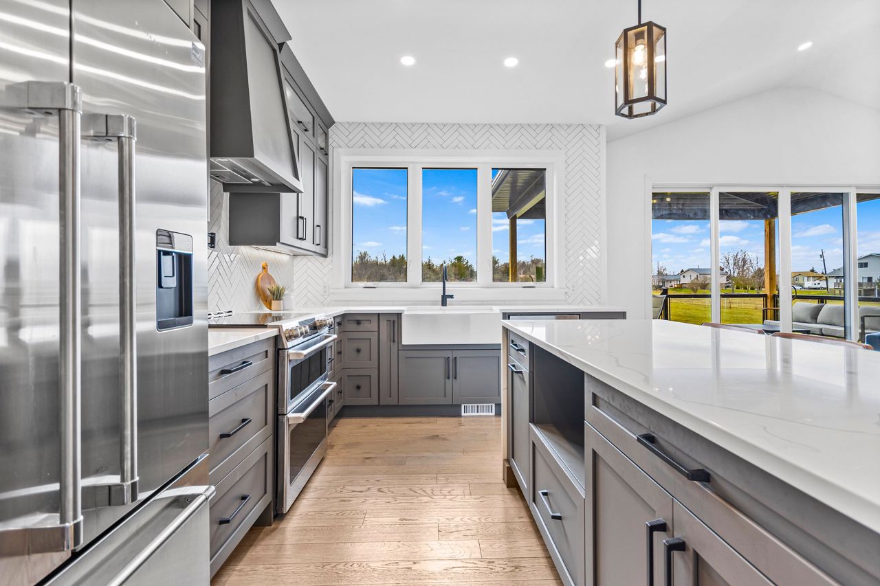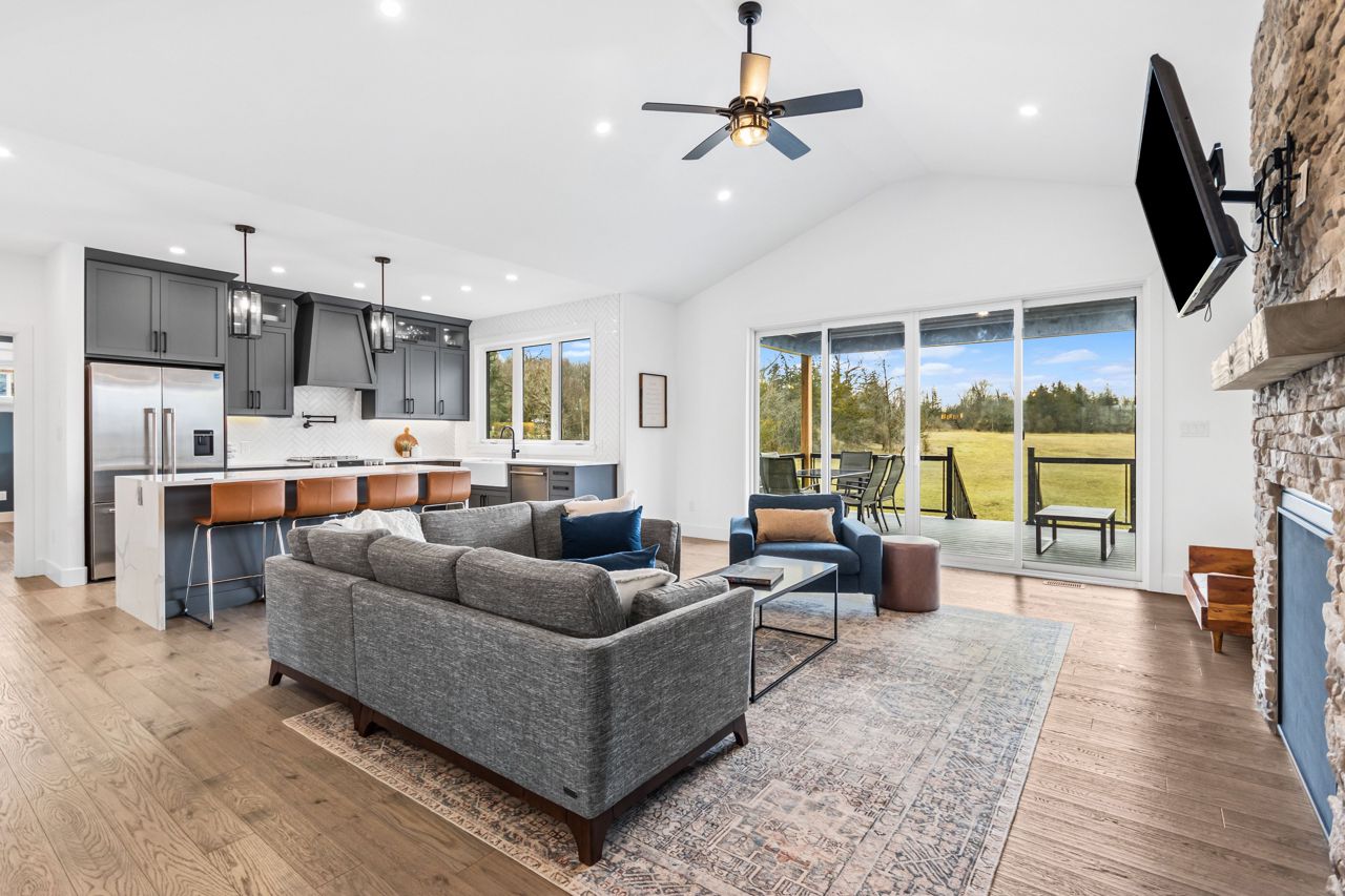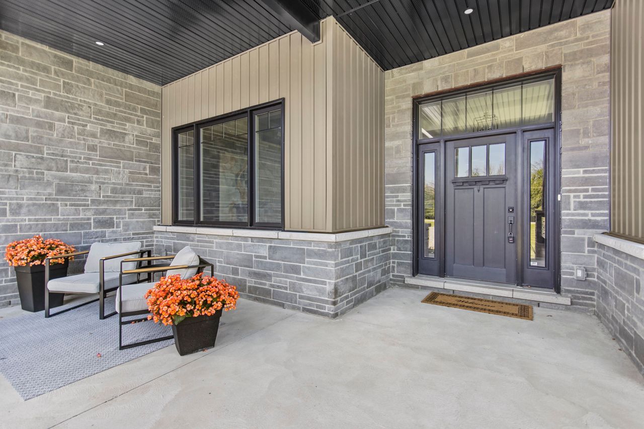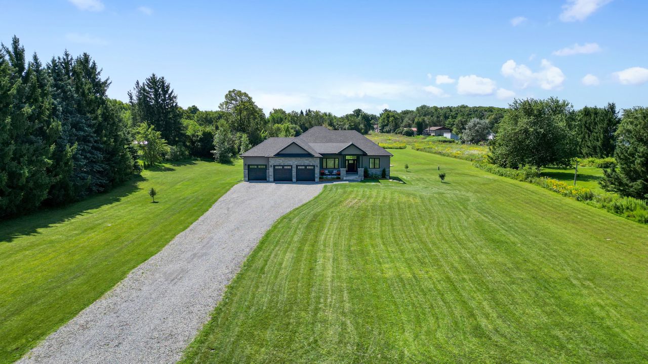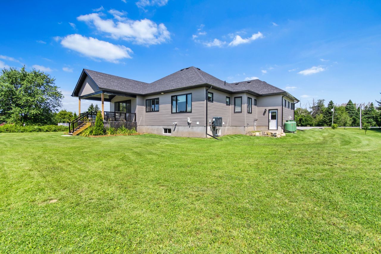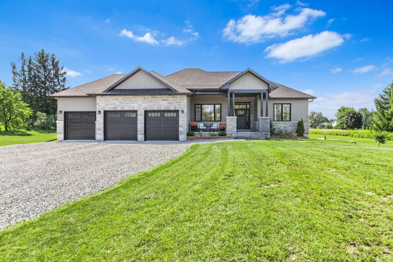 Beautifully built in 2020, custom bungalow with attached three car garage, sits on just over five acres and only 11 minutes from the 401. Through the front door, you will be greeted by the open concept layout and 12' cathedral ceilings in the living room. Large dining room, with coffered ceilings. Large kitchen has quartz waterfall island, built-in appliances and a pot filler. Plenty of cupboard space and a large pantry. An abundance of natural light fills the home from its many windows. Patio door leading out to the stunning glass railing covered deck with unobstructed views of the property. Main floor laundry room with garage entry, primary bedroom with 9' coffered ceilings, large walk-in closet with built ins, stunning 5pc ensuite with glass shower and soaker tub. Two additional bedrooms and 4 pc bath. Finished LL, modern and cozy living room with electric fireplace, ample storage room space, a second entrance into the garage, a bright bedroom, office space, gym, den and 4pc bath**Interboard Listing: Kingston & Area Real Estate Association**