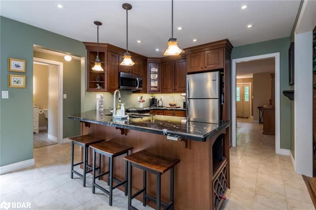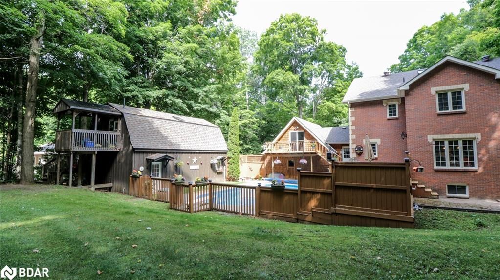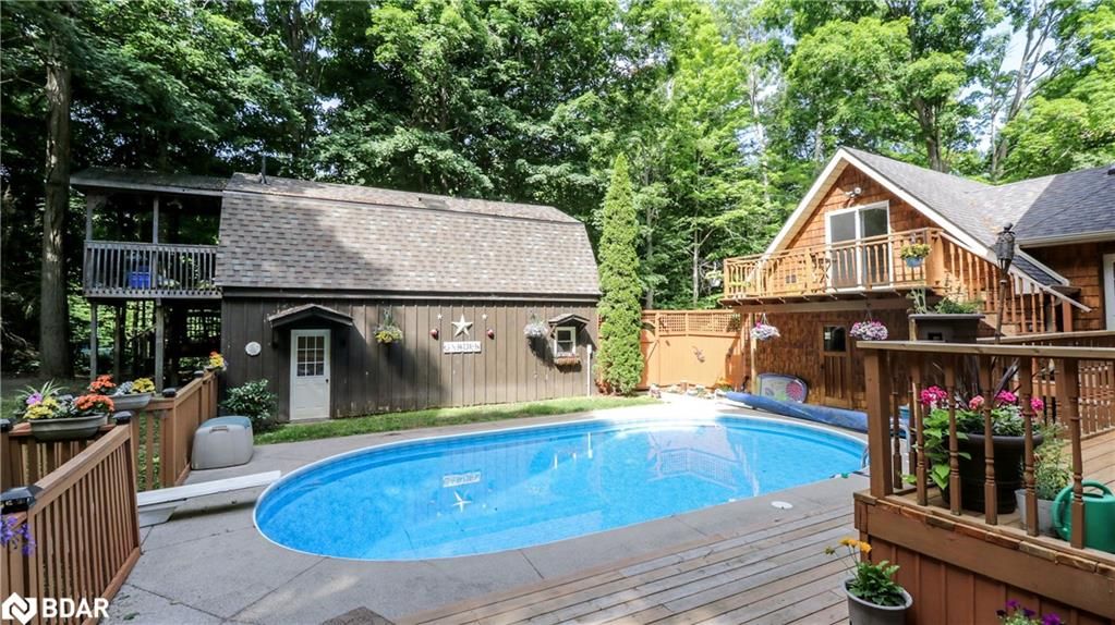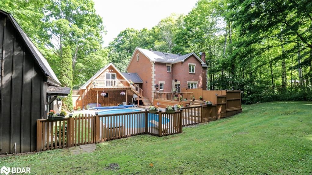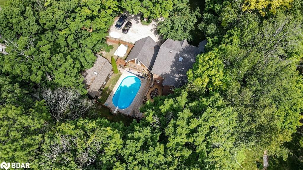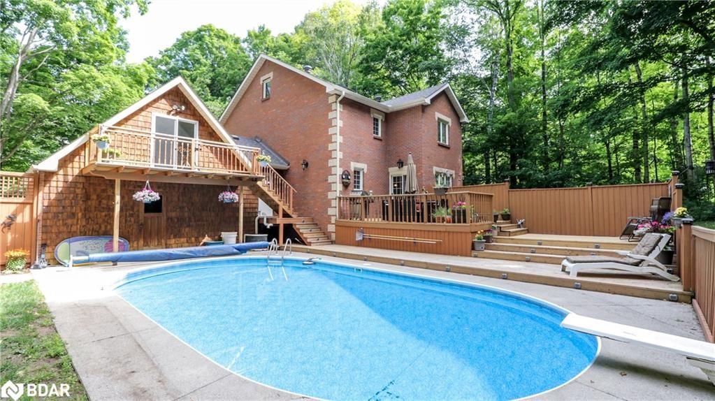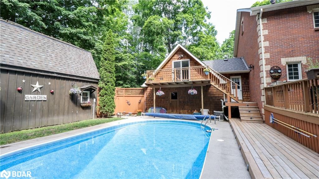 "Rare Find-close to Barrie". This home offers 4618 sq ft finished. Features: 2 x 2 Garages/Workshop, heated in-ground pool, apartment above garage, 1 Acre Lot, backs onto trees, Simcoe County Forest trails just a few doors down! Most updates have been done but there is still some tweaking opportunity to gain sweat equity! Priced well below average per sq ft price in Springwater! A must see for multi gen, contractors and outdoor enthusiasts. Total of 7 bedrooms, 4 bathrooms. Newer kitchen, bathrooms (3), flooring, furnace & AC, decking.