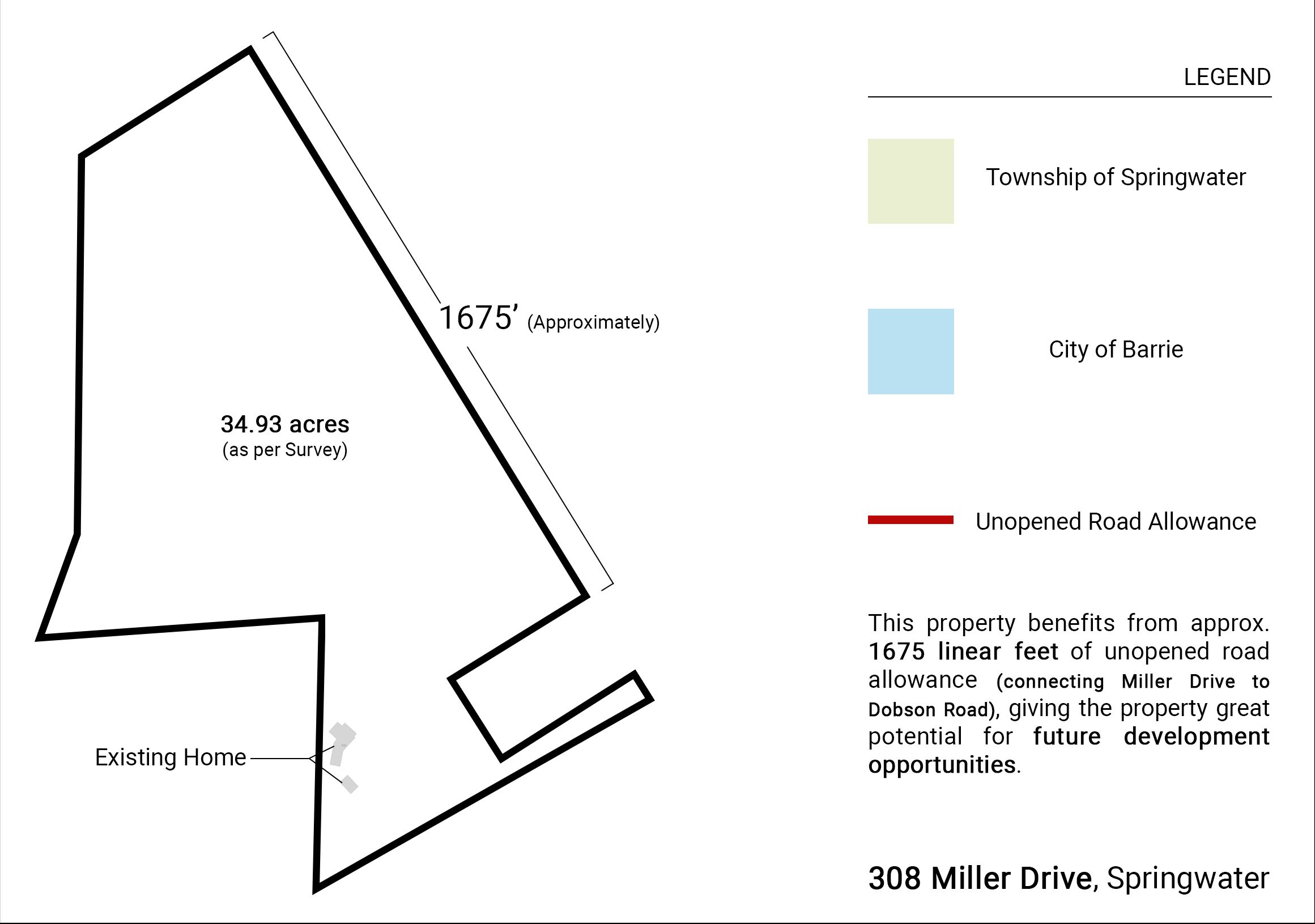 Discover 308 Miller Drive, a 34+ acre gem in Springwater, right at Barrie's edge. This property offers potential for future development with over 1675' of frontage on a yet-to-be-opened road allowance that connects Barrie to Springwater. Natural Gas heating sets it apart from most rural estates, offering an economical advantage. The estate caters to sustainable living with a large fenced garden, chicken coop, and a separate heated shop with a 1-bedroom apartment above (not registered)—perfect for additional income. Part of the Managed Forest Program, the land promotes eco-friendly practices and offers various outdoor activities like hiking and ATV trails. 308 Miller Drive isn't just a home, but a lifestyle investment. Perfect for discerning buyers looking for rural serenity, urban convenience, and future growth potential.The property features a workshop with a self contained 1 bedroom apartment above (not registered).