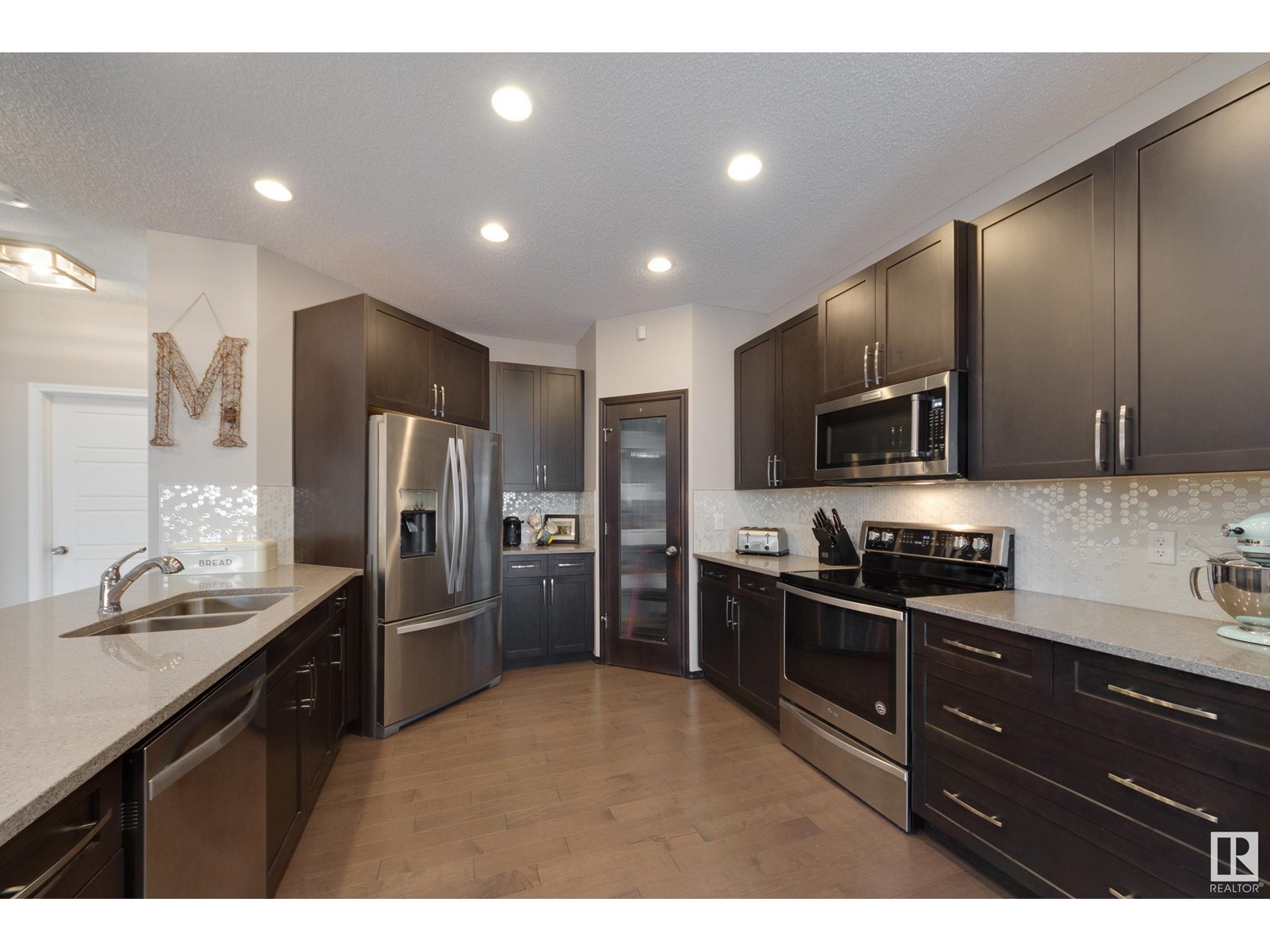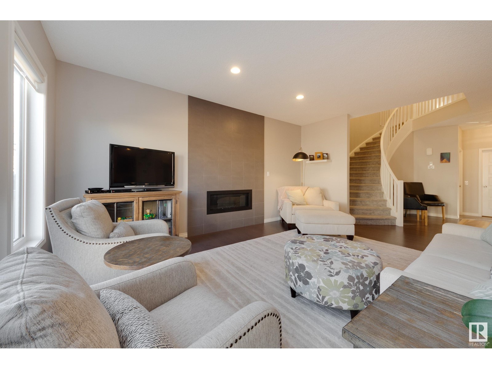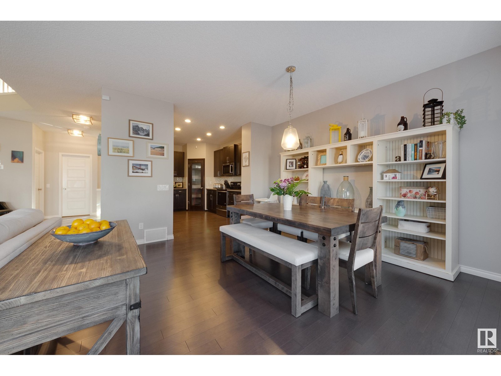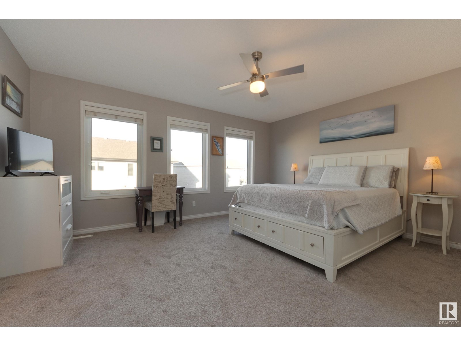 Nestled on a quiet street in the heart of St Albert, this stunning, move-in ready 2367 sq ft 3 bed, 3 bath family home w/central AC & fully fenced & landscaped yard awaits! Youll find 9ft ceilings, wide plank hardwood & upgraded lighting in the gorgeous open concept great room featuring a spacious living w/huge windows & natural gas fireplace & large dining room w/ double patio doors to access the two tier deck & gas BBQ hook up. The massive kitchen features s/steel appliances, ample cabinetry & corner pantry. Upgraded quartz countertops are found throughout the kitchen & baths. The elegant curved staircase leads you to the spacious & bright bonus room, oversized laundry room, 3 generously sized bedrooms, each with walk-in closets & a luxurious 5pce ensuite w/dual sinks. Walking distance to nature trails, the farmers market, parks & playgrounds, its central location makes it a 7 min drive from all amenities, major roads & Edmonton. Act today to own this impressive home in a family friendly & safe area! (id:22211)