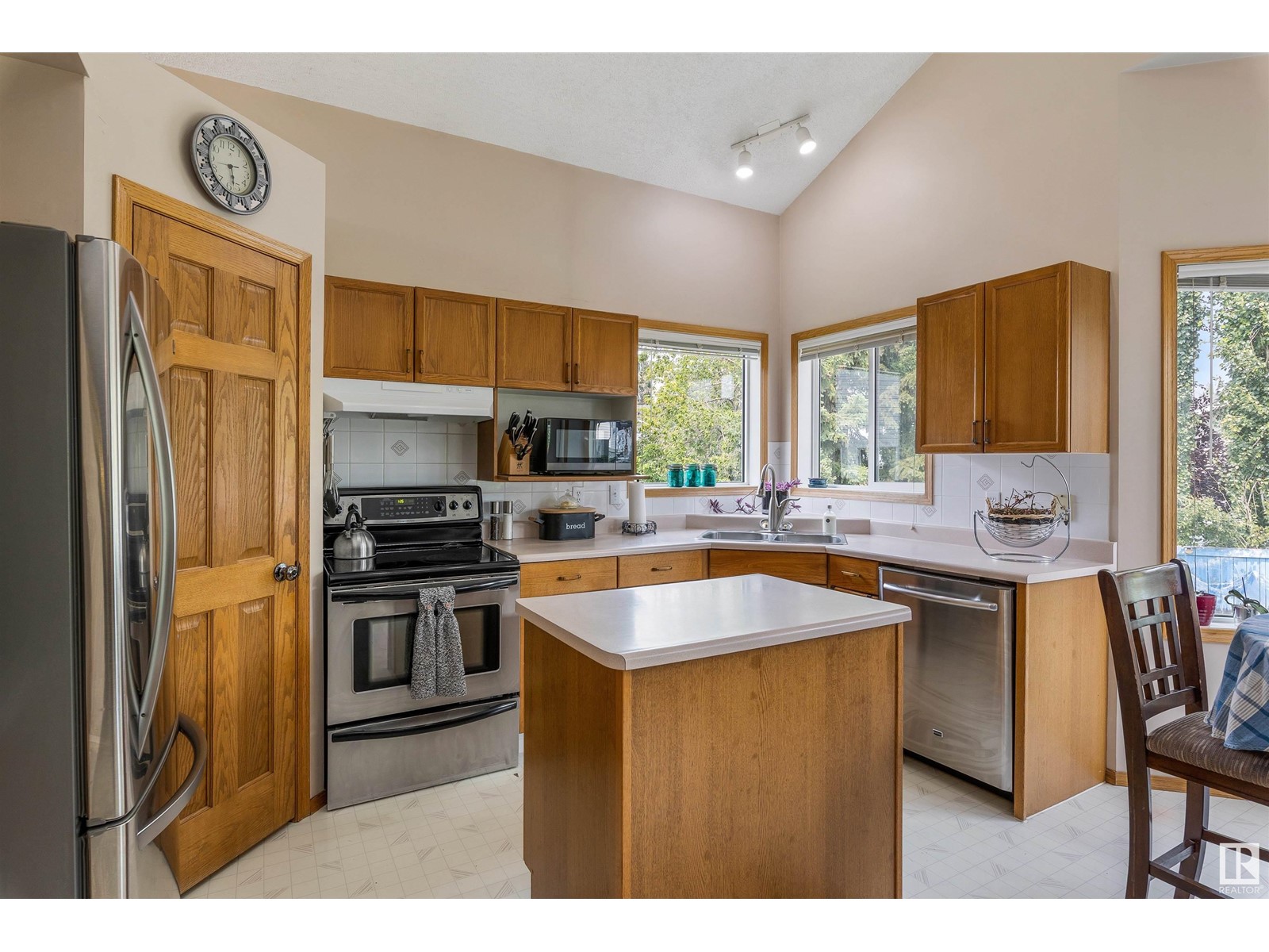 Situated in a QUIET CUL DE SAC on a large pie lot you will find this 1935sqft two storey. The main floor features a bright and open front living room and dining room with VAULTED CEILINGS, kitchen with corner pantry, ISLAND and breakfast nook area, large family room with GAS FIREPLACE, main floor bedroom/den, main floor laundry and an updated half bathroom. Upstairs there are three bedrooms and a RENOVATED 4pce main bathroom. The primary bedroom has double closets and a 4pce ENSUITE. The basement is fully finished with a rec room, TWO additional dens (both have WINDOWS and closets but require a larger window to meet egress) and a large storage room. Recent upgrades include: Flooring in the living/dining and family rooms, FURNACE (2021), AIR CONDITIONING (2021) & SHINGLES (about 7 years old with lifetime warranty). There is a FULLY FINISHED AND HEATED double attached garage with extra storage. The backyard is a private oasis and features a fire pit, deck and is fully fenced. This home offers amazing value! (id:22211)