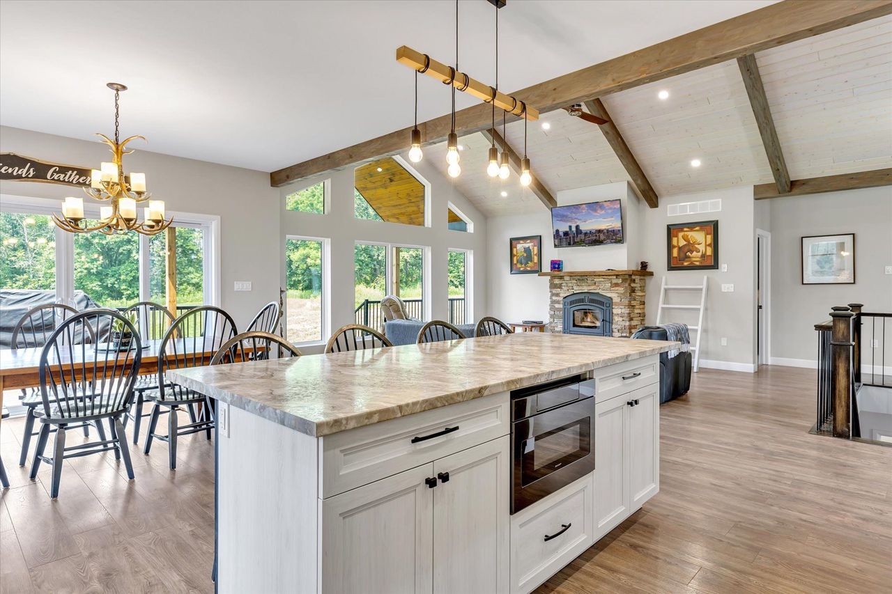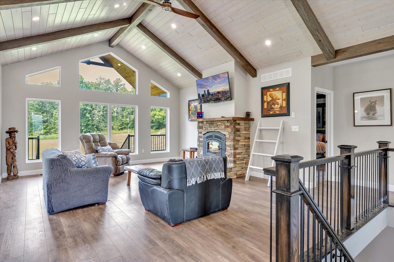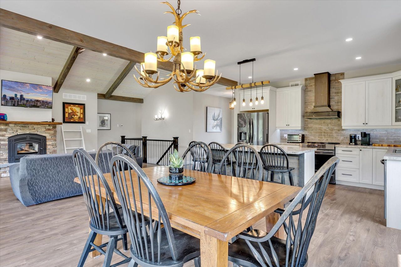 house. Open concept floor plan has vaulted ceilings & beams with a stunning kitchen & center island plus a walkout to the deck to private back yard and is truly a homeowners dream. Primary Bdrm has a coffered ceiling and accent wall with patio doors leading to the back yard & deck and gives you a welcoming bedroom to unwind in. The large walk through