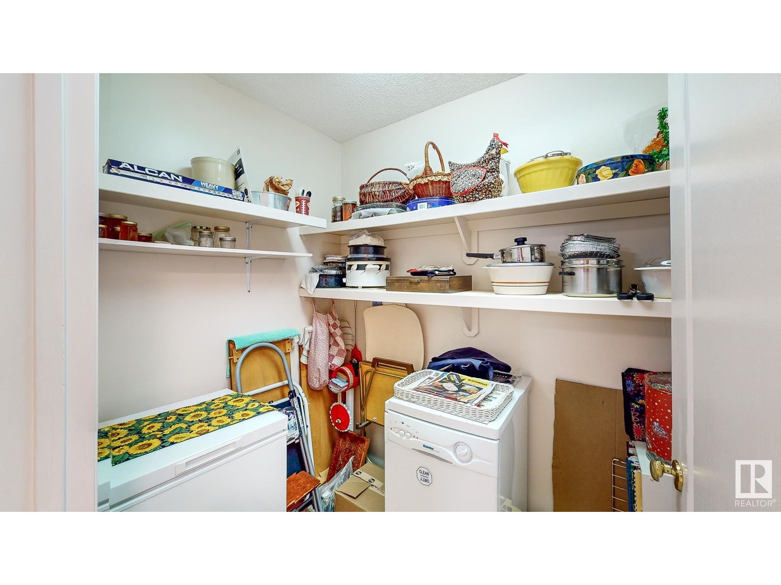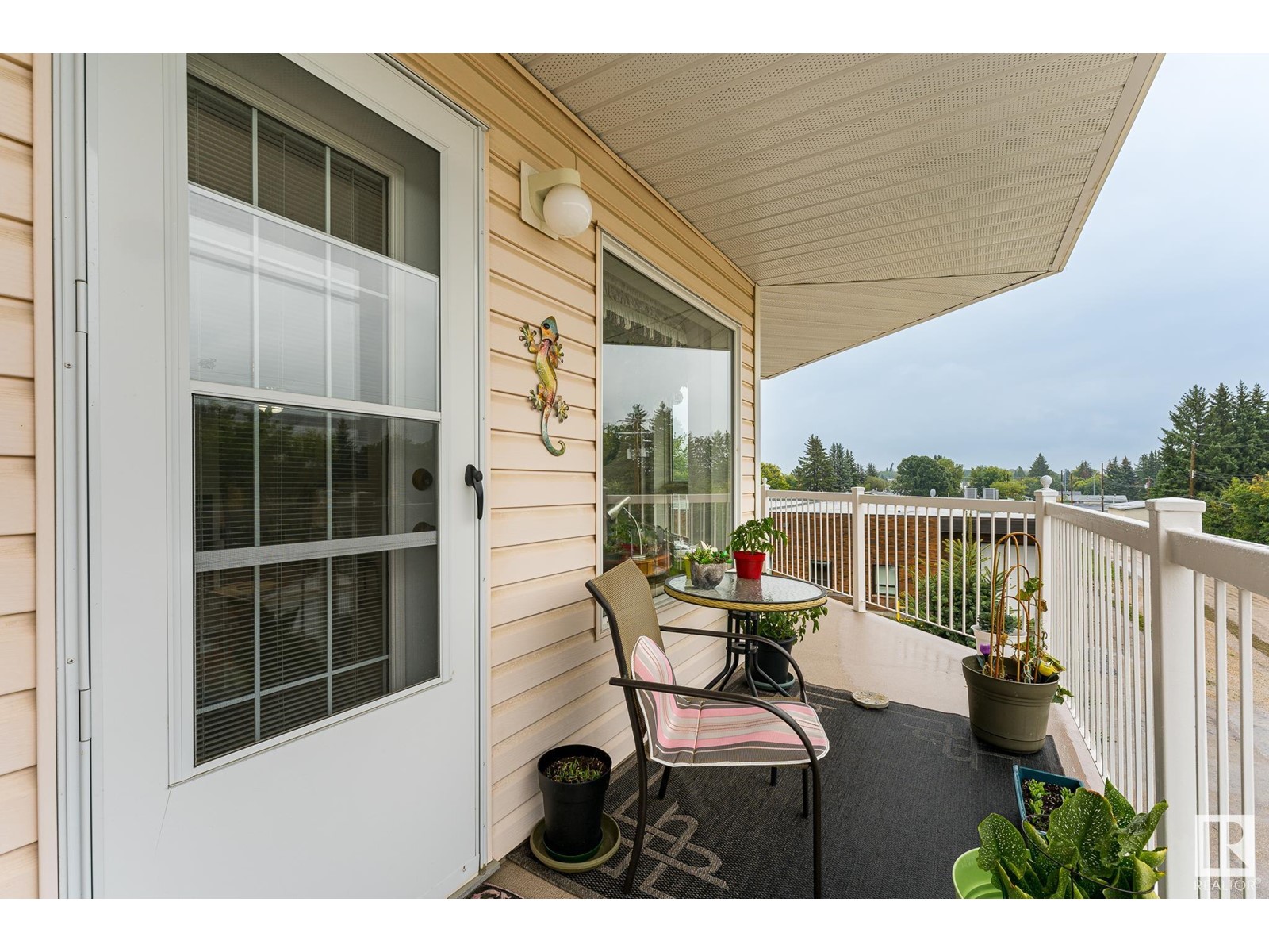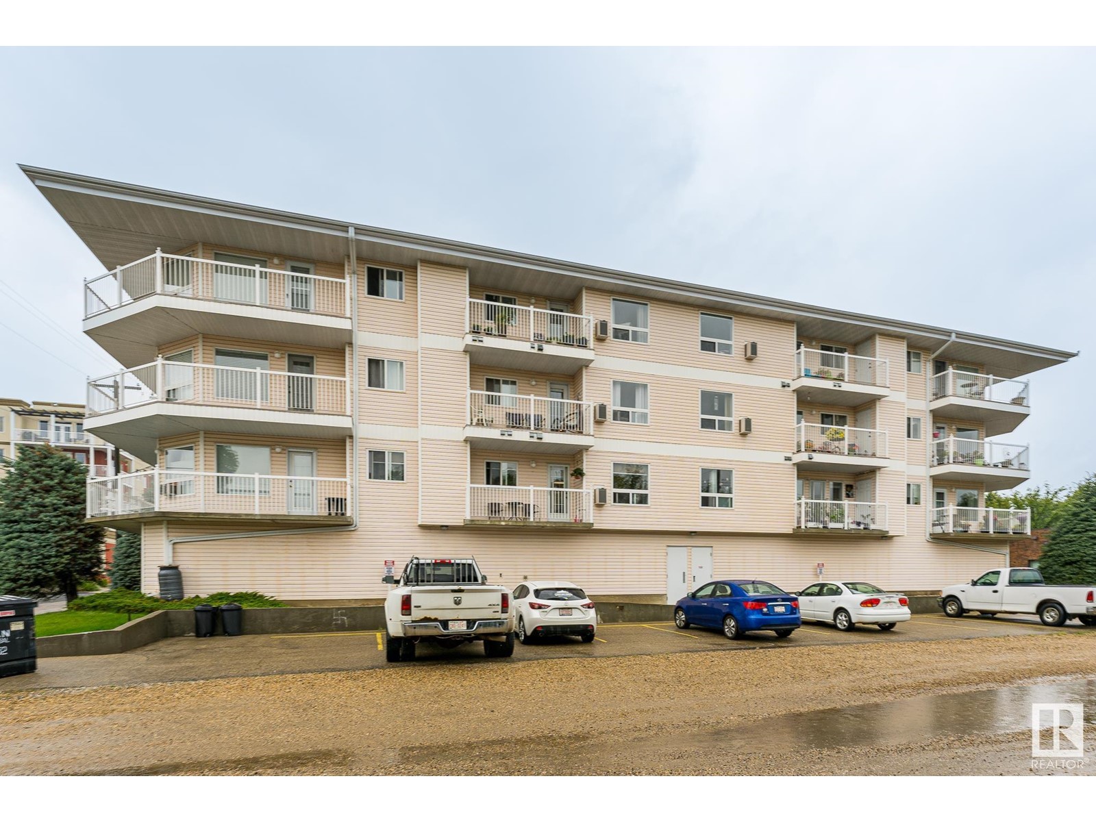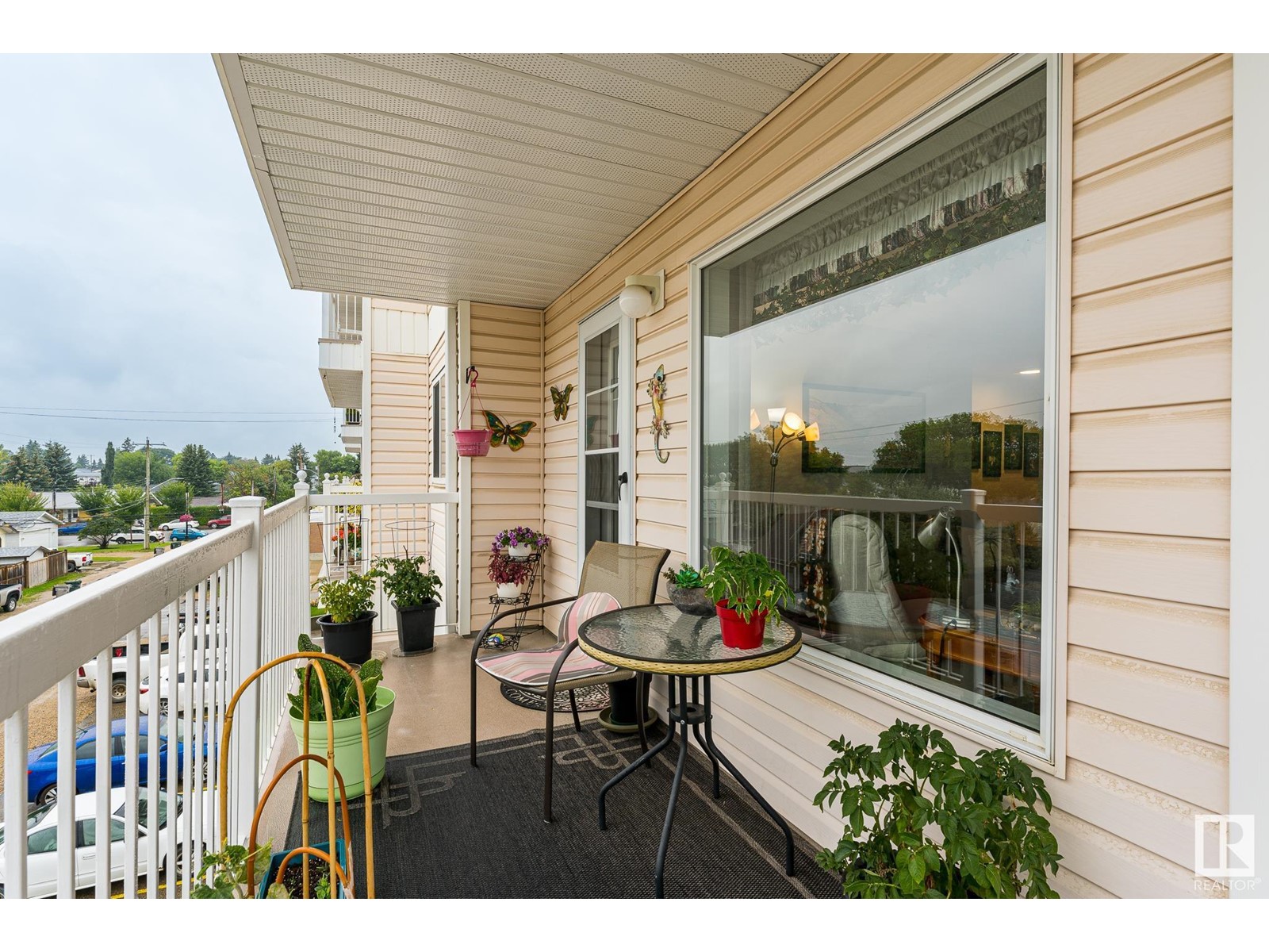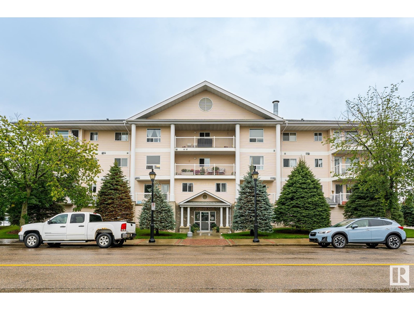 Located in Downtown Stony Plain, this lovely 2 bedroom, 2 bathroom corner unit w/ AC is move in ready. Elevator access to the unit. Over 1080 sq ft, corner unit with a South Exposure. Open kitchen with ample cupboards and counter space overlooks the dining area. Plenty of room for a full dining table. Patio Doors lead to the wrap around deck. Roomy living room with tons of natural light streaming in. Second garden door entry to the other side of the deck. Master Bedroom has walk through closet and 2 piece powder room. 2nd bedroom doubles as a den. In-suite laundry and portable dishwasher. Full Four piece bathroom. This extremely clean unit has neutral tones and laminate flooring in the main living space. Storage unit is located on the balcony. 1 Underground Heated Parking stall. Walk to all services from this prime location. Condo Fees are $430 and include: water/sewer/reserve fund/parking/insurance. Fairhaven Place is a well established, safe, 55+ condominium that has a great communit (id:22211)