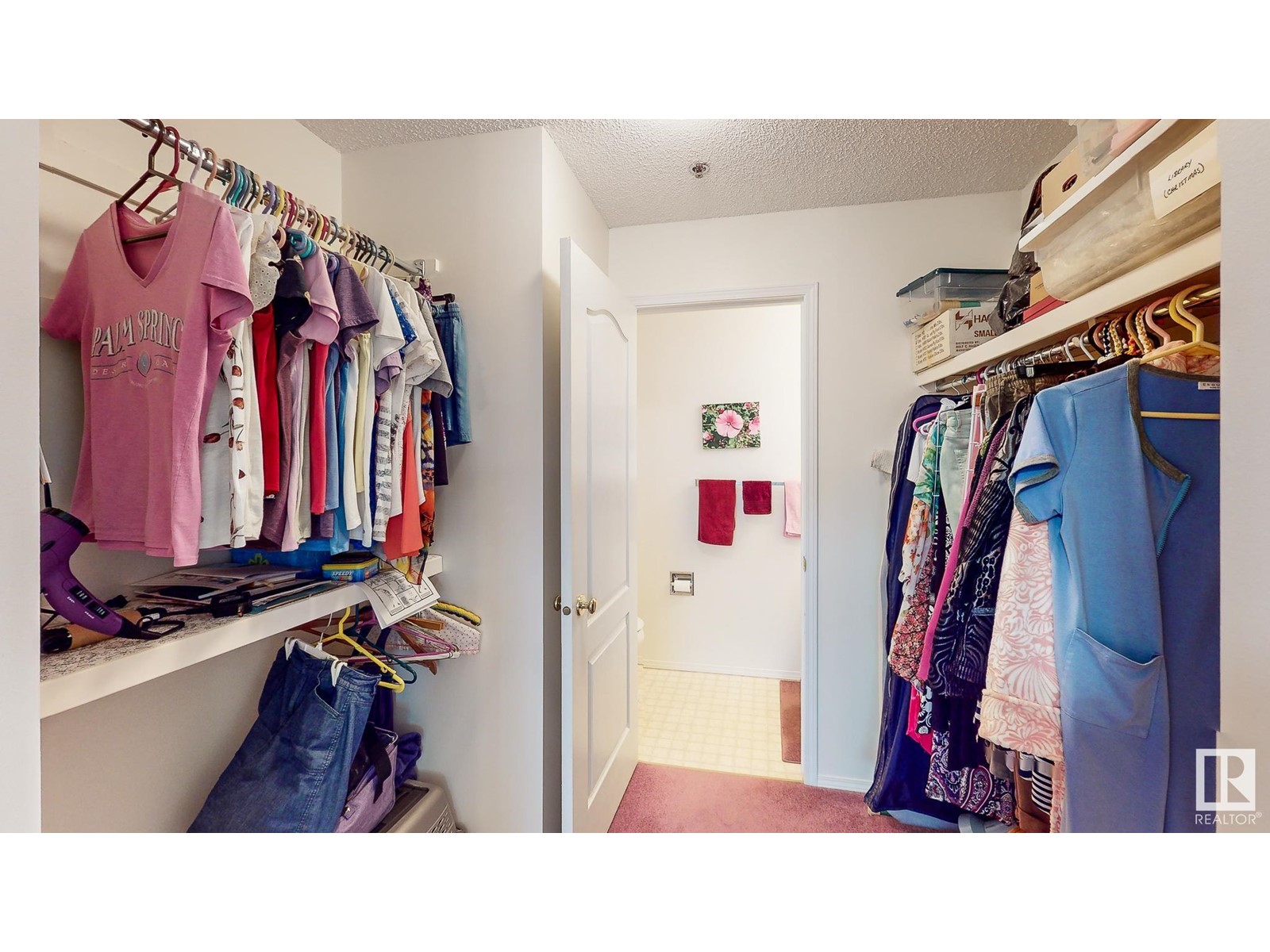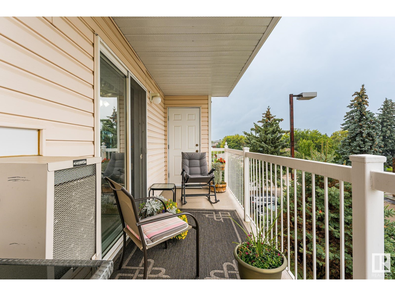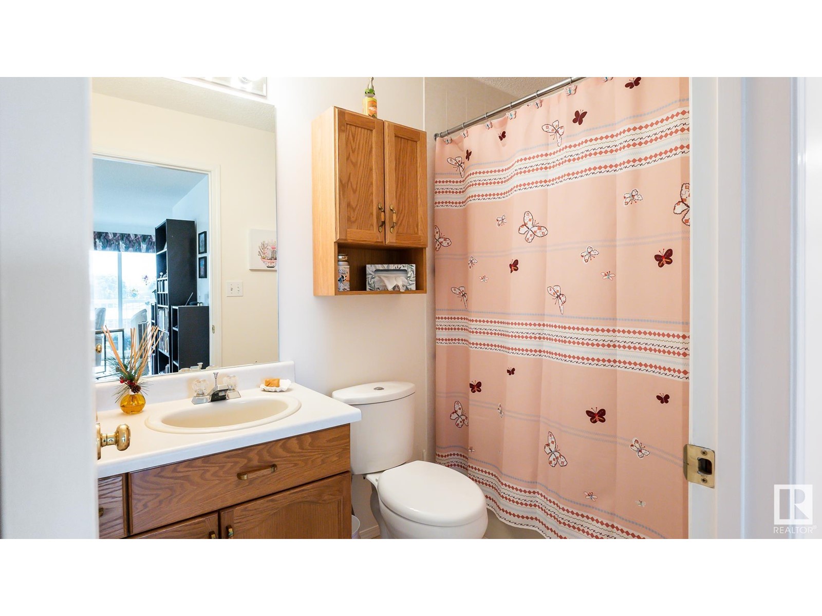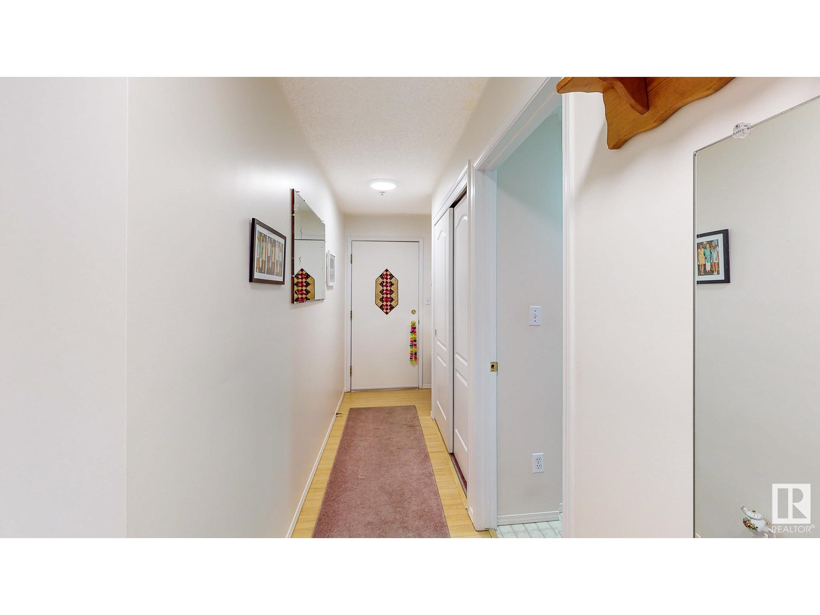 Located in Downtown Stony Plain, this lovely 2 bedroom, 2 bathroom corner unit w/ AC is move in ready. Elevator access to the unit. Over 1080 sq ft, corner unit with a South Exposure. Open kitchen with ample cupboards and counter space overlooks the dining area. Plenty of room for a full dining table. Patio Doors lead to the wrap around deck. Roomy living room with tons of natural light streaming in. Second garden door entry to the other side of the deck. Master Bedroom has walk through closet and 2 piece powder room. 2nd bedroom doubles as a den. In-suite laundry and portable dishwasher. Full Four piece bathroom. This extremely clean unit has neutral tones and laminate flooring in the main living space. Storage unit is located on the balcony. 1 Underground Heated Parking stall. Walk to all services from this prime location. Condo Fees are $430 and include: water/sewer/reserve fund/parking/insurance. Fairhaven Place is a well established, safe, 55+ condominium that has a great communit (id:22211)