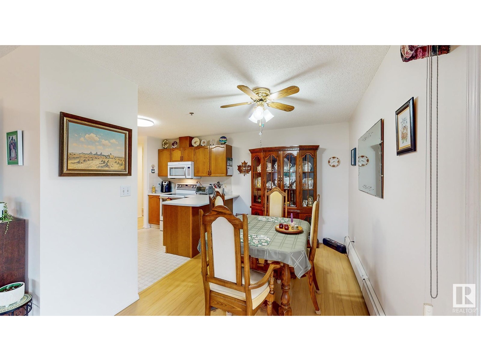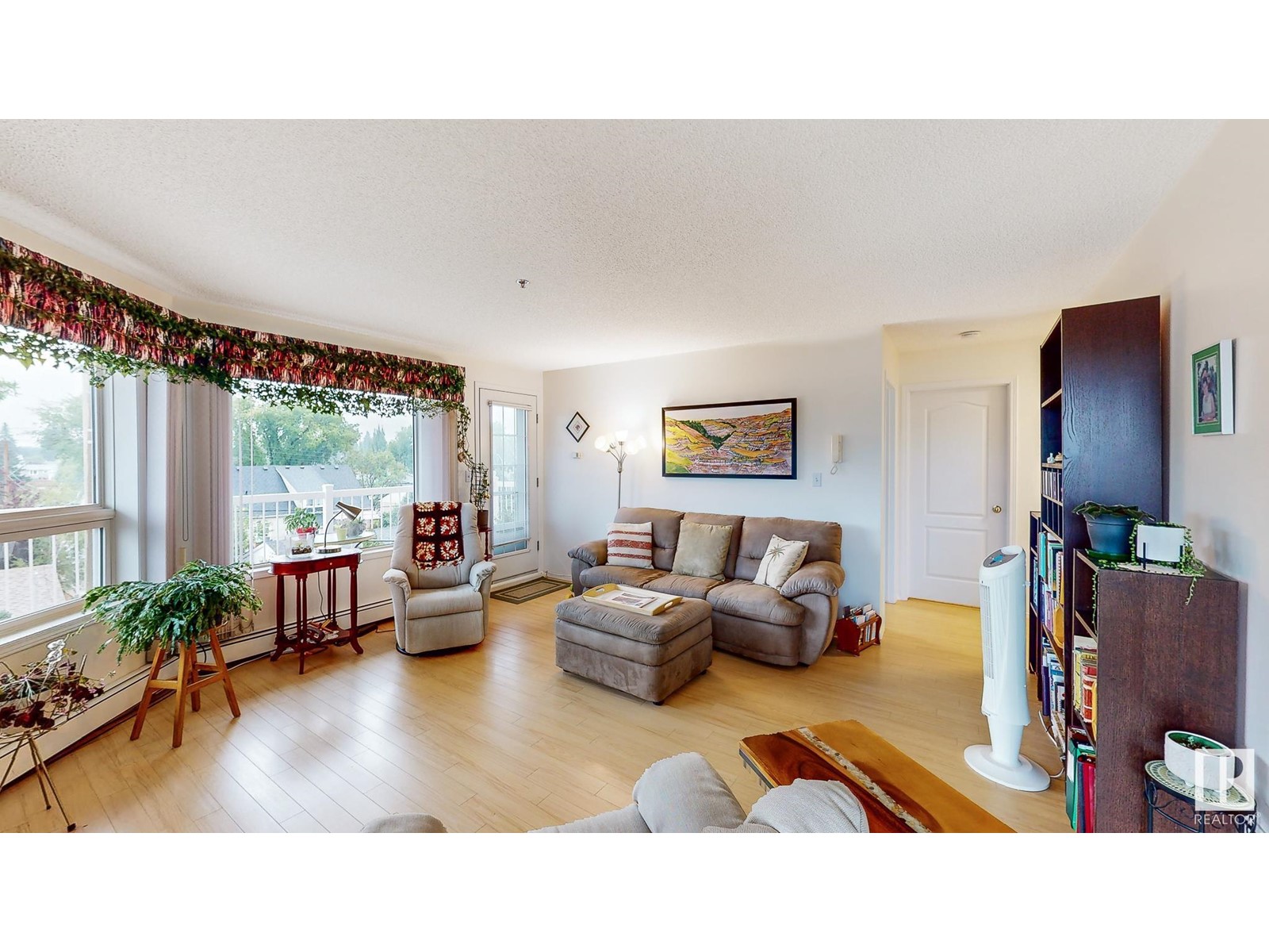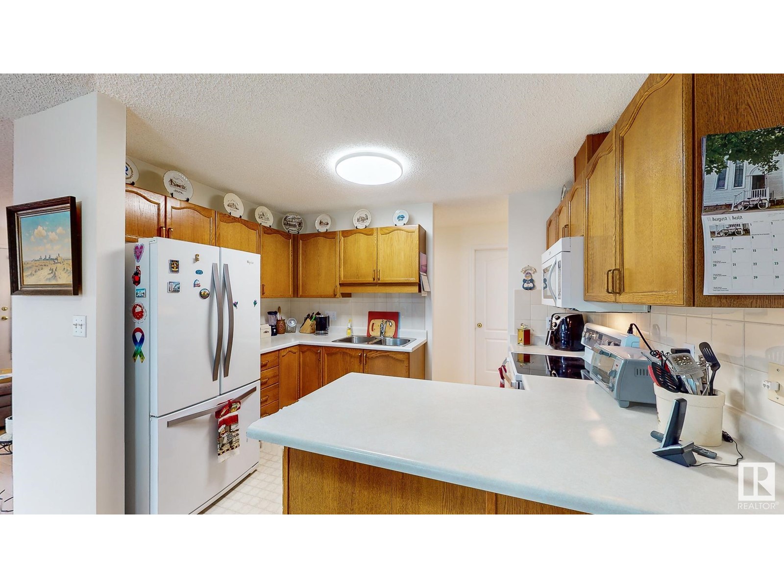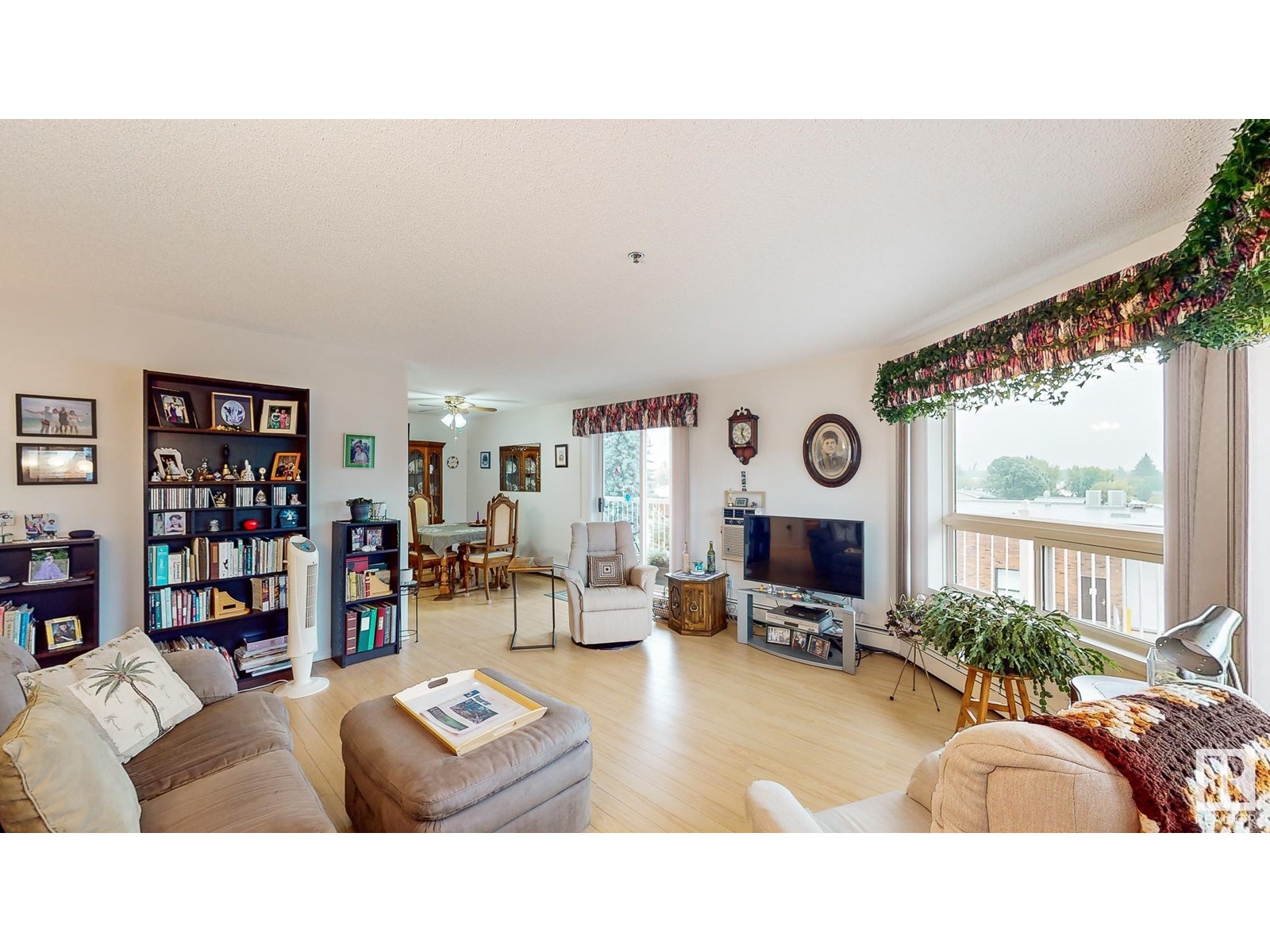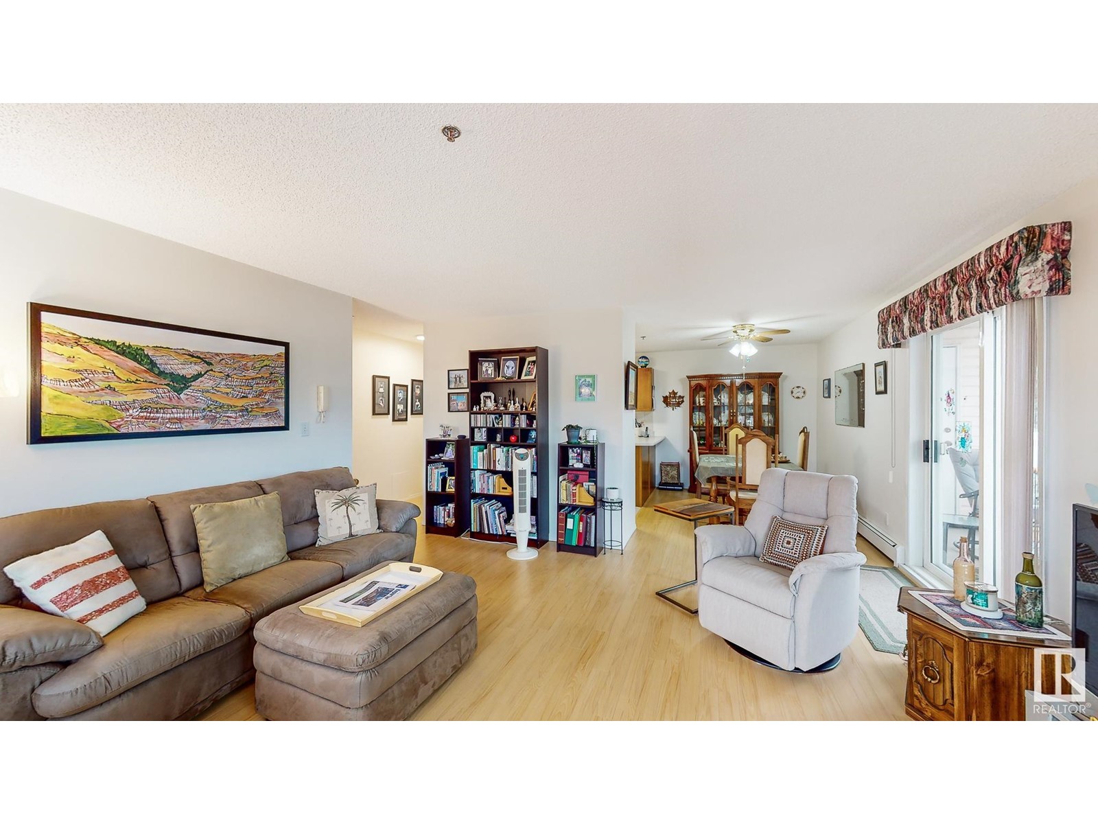 Located in Downtown Stony Plain, this lovely 2 bedroom, 2 bathroom corner unit w/ AC is move in ready. Elevator access to the unit. Over 1080 sq ft, corner unit with a South Exposure. Open kitchen with ample cupboards and counter space overlooks the dining area. Plenty of room for a full dining table. Patio Doors lead to the wrap around deck. Roomy living room with tons of natural light streaming in. Second garden door entry to the other side of the deck. Master Bedroom has walk through closet and 2 piece powder room. 2nd bedroom doubles as a den. In-suite laundry and portable dishwasher. Full Four piece bathroom. This extremely clean unit has neutral tones and laminate flooring in the main living space. Storage unit is located on the balcony. 1 Underground Heated Parking stall. Walk to all services from this prime location. Condo Fees are $430 and include: water/sewer/reserve fund/parking/insurance. Fairhaven Place is a well established, safe, 55+ condominium that has a great communit (id:22211)
