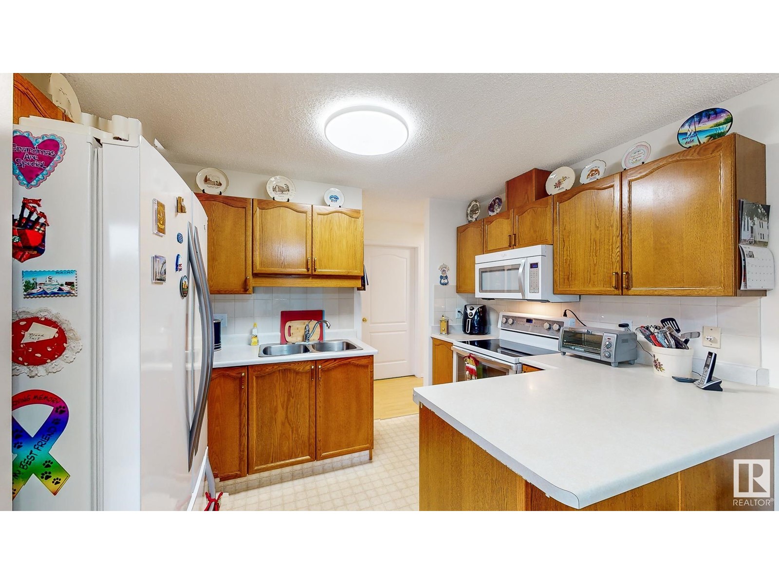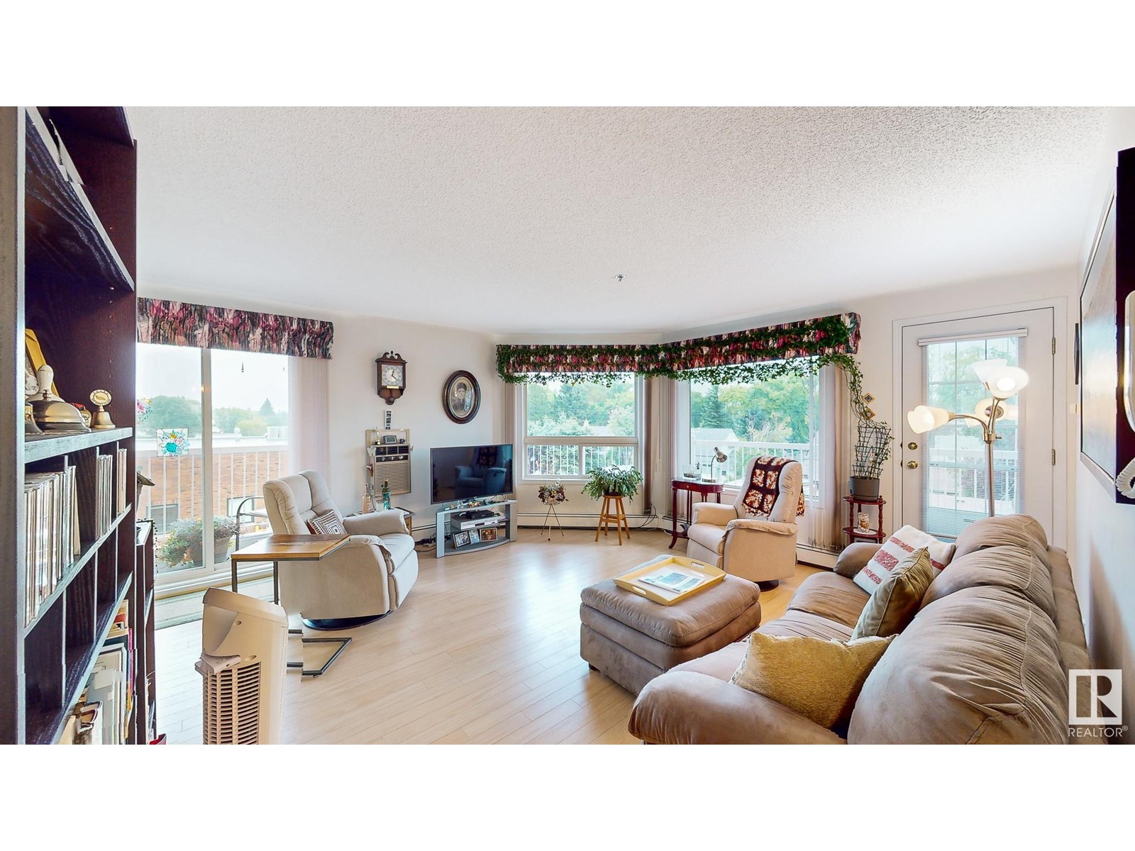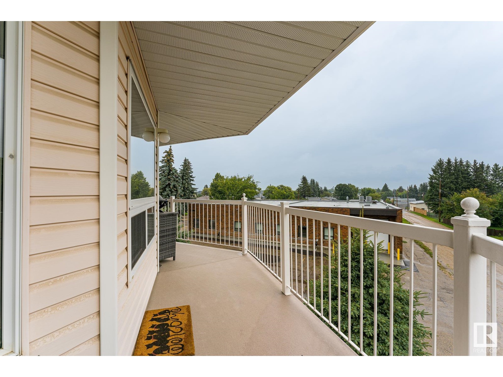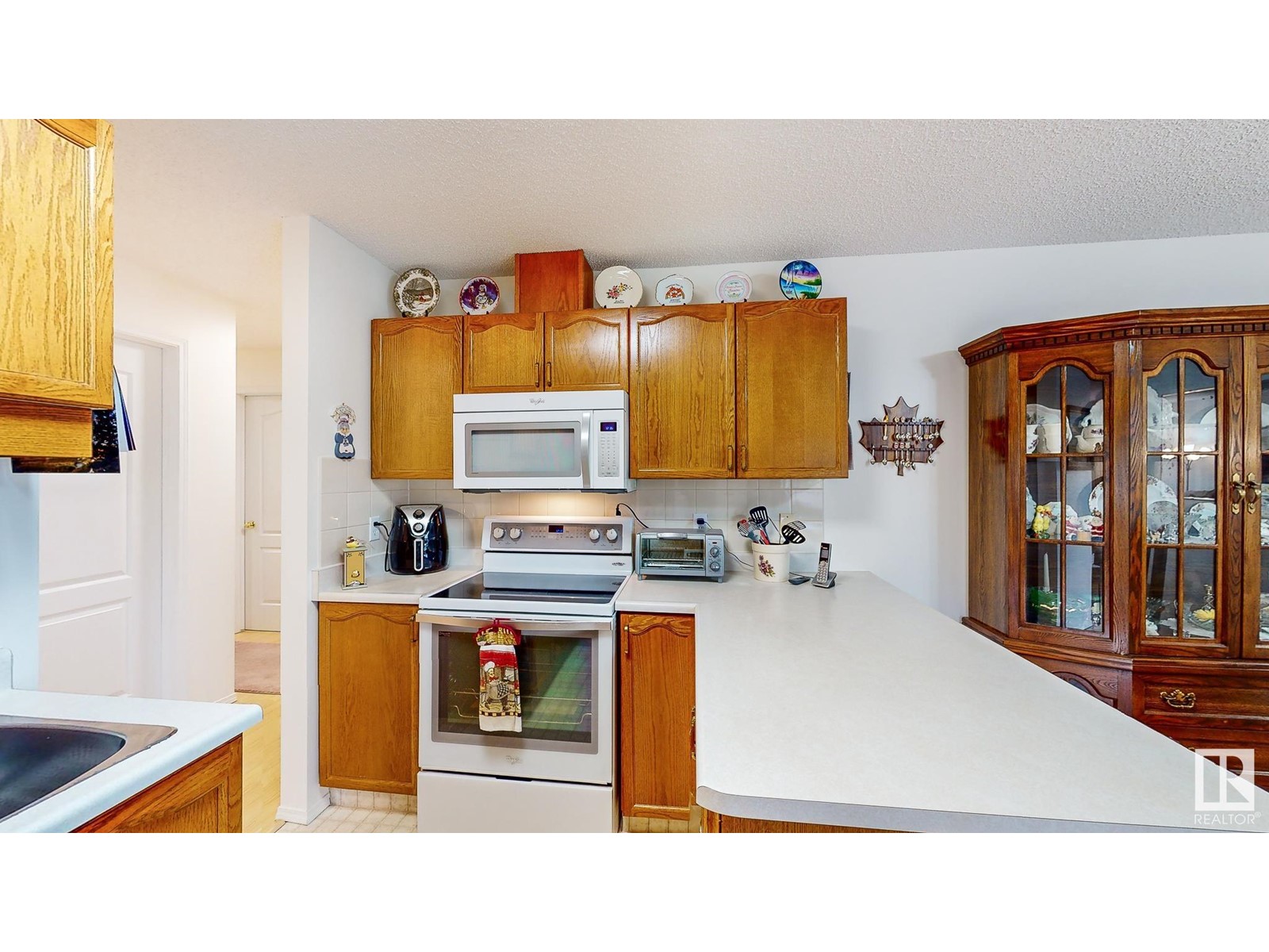 Located in Downtown Stony Plain, this lovely 2 bedroom, 2 bathroom corner unit w/ AC is move in ready. Elevator access to the unit. Over 1080 sq ft, corner unit with a South Exposure. Open kitchen with ample cupboards and counter space overlooks the dining area. Plenty of room for a full dining table. Patio Doors lead to the wrap around deck. Roomy living room with tons of natural light streaming in. Second garden door entry to the other side of the deck. Master Bedroom has walk through closet and 2 piece powder room. 2nd bedroom doubles as a den. In-suite laundry and portable dishwasher. Full Four piece bathroom. This extremely clean unit has neutral tones and laminate flooring in the main living space. Storage unit is located on the balcony. 1 Underground Heated Parking stall. Walk to all services from this prime location. Condo Fees are $430 and include: water/sewer/reserve fund/parking/insurance. Fairhaven Place is a well established, safe, 55+ condominium that has a great communit (id:22211)