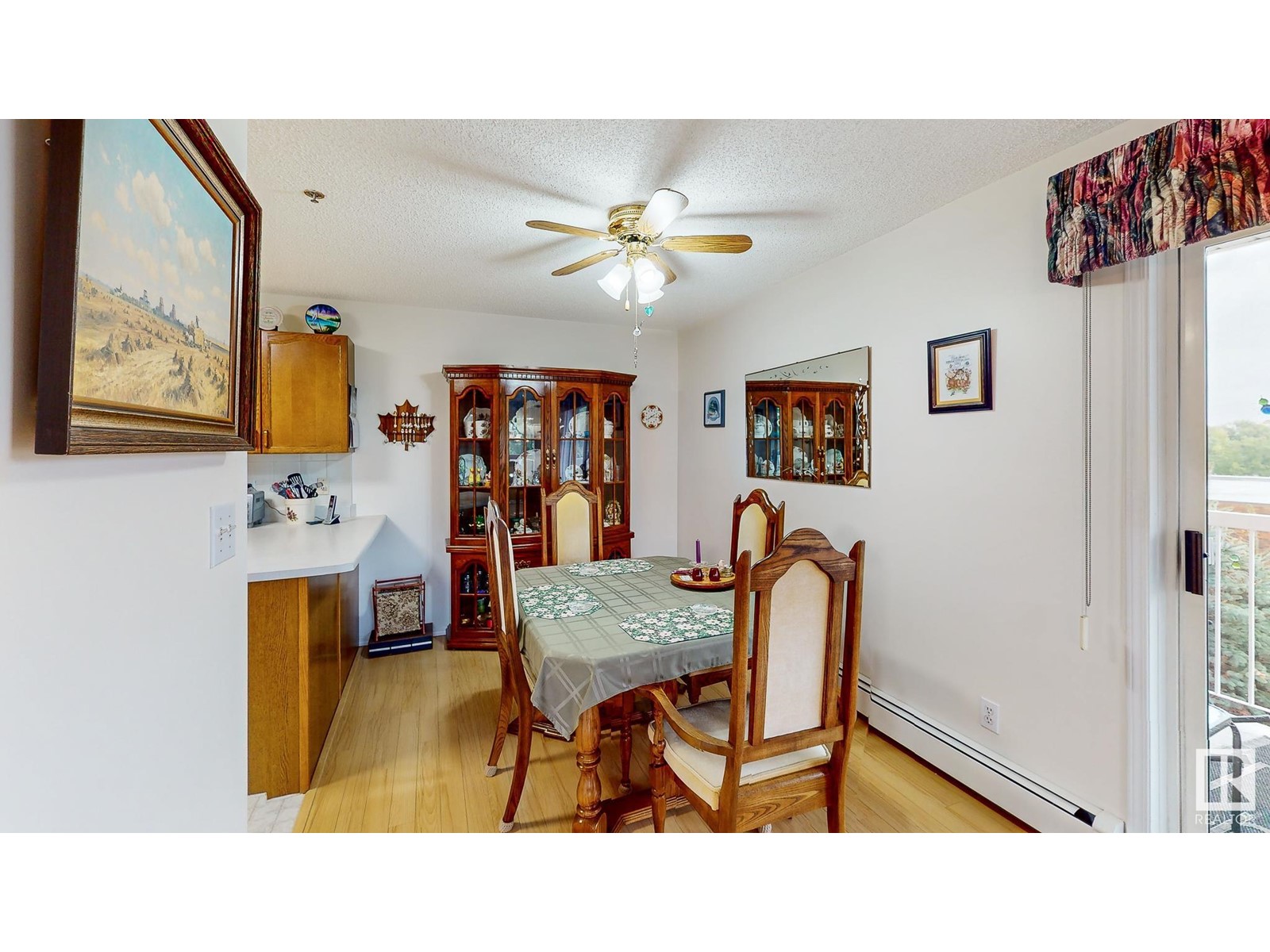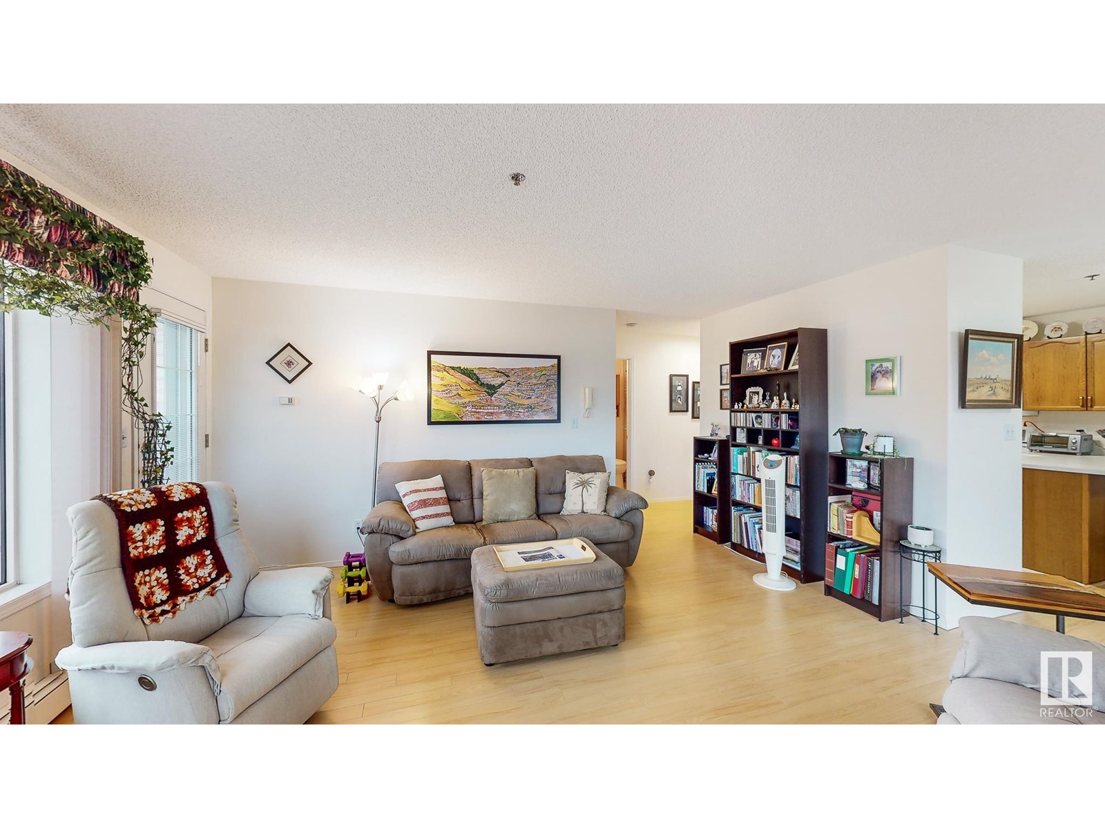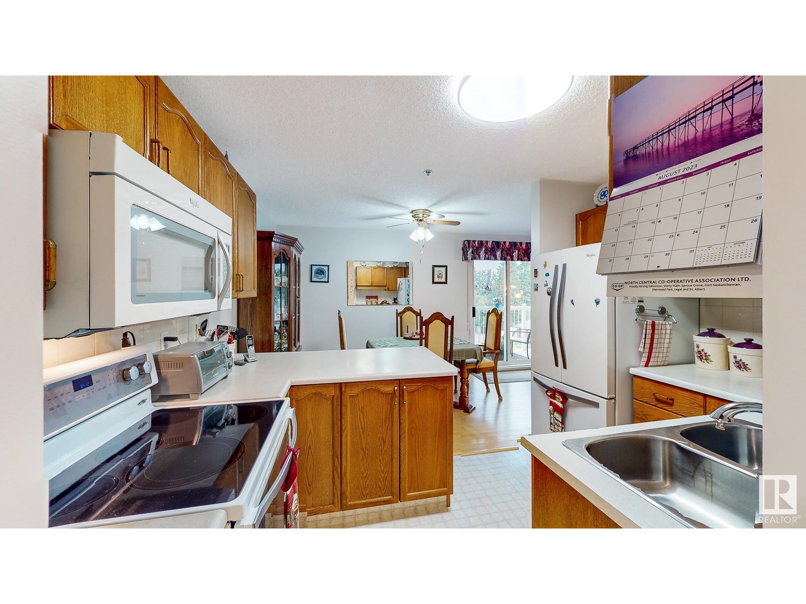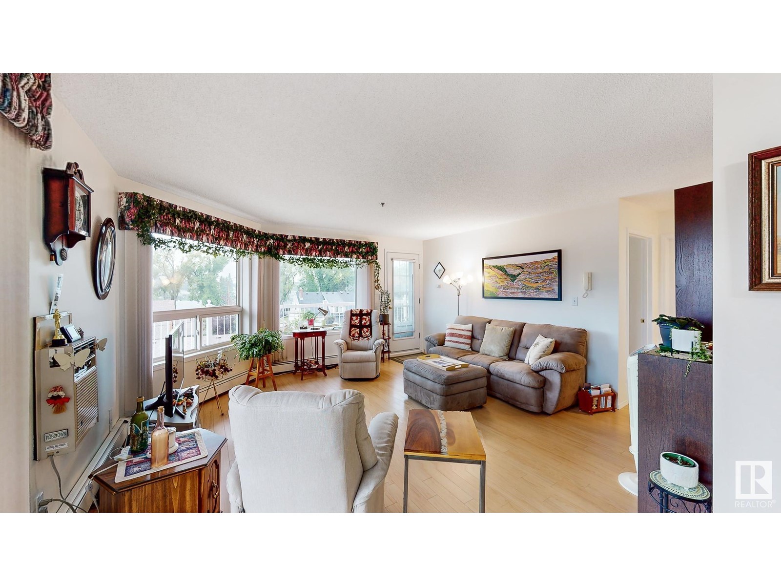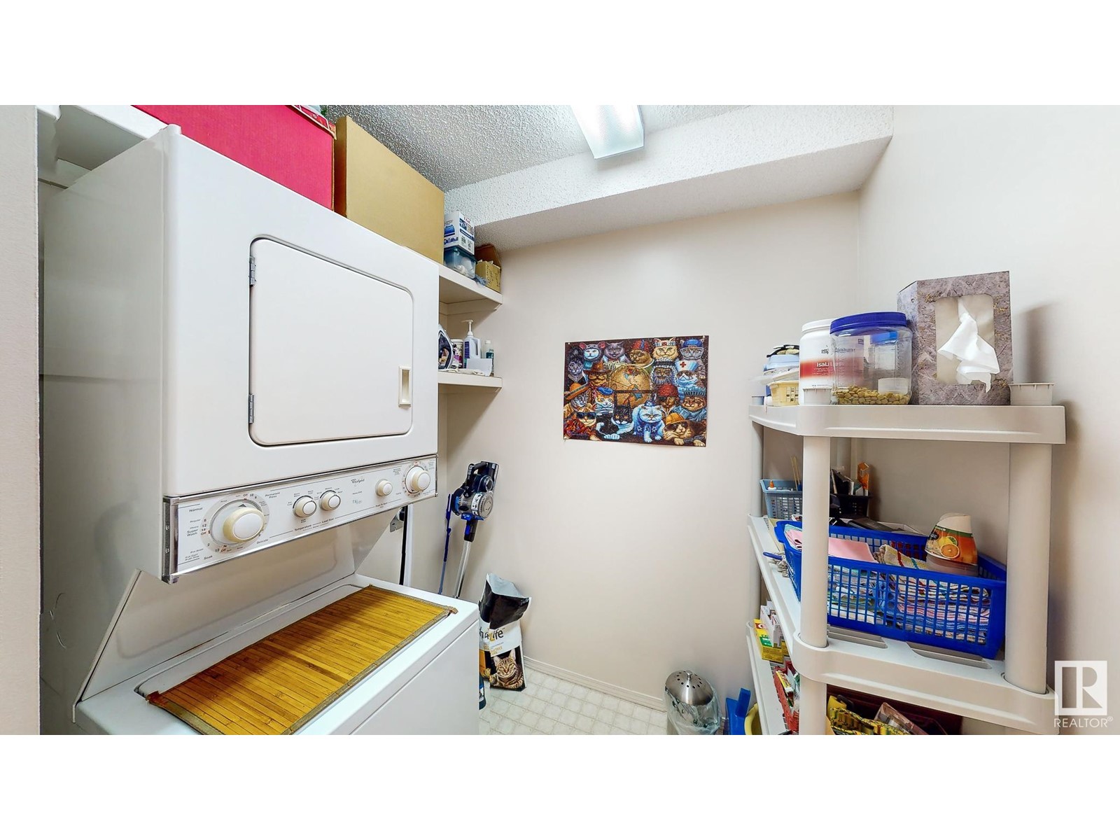 Located in Downtown Stony Plain, this lovely 2 bedroom, 2 bathroom corner unit w/ AC is move in ready. Elevator access to the unit. Over 1080 sq ft, corner unit with a South Exposure. Open kitchen with ample cupboards and counter space overlooks the dining area. Plenty of room for a full dining table. Patio Doors lead to the wrap around deck. Roomy living room with tons of natural light streaming in. Second garden door entry to the other side of the deck. Master Bedroom has walk through closet and 2 piece powder room. 2nd bedroom doubles as a den. In-suite laundry and portable dishwasher. Full Four piece bathroom. This extremely clean unit has neutral tones and laminate flooring in the main living space. Storage unit is located on the balcony. 1 Underground Heated Parking stall. Walk to all services from this prime location. Condo Fees are $430 and include: water/sewer/reserve fund/parking/insurance. Fairhaven Place is a well established, safe, 55+ condominium that has a great communit (id:22211)