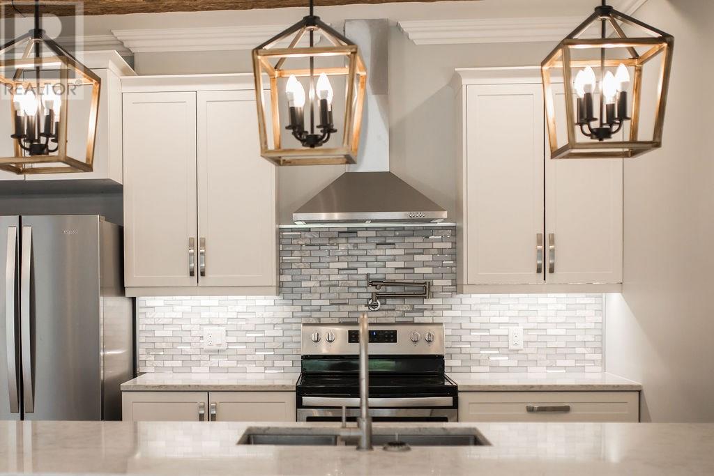 This exceptional townhome offers a terrific open concept floor plan with custom designed kitchen, quartz counter tops, and a pot filler over the stove. The spacious cathedral ceilinged master suite is equipped with a custom ensuite bath with oversized walk-in shower with rain shower heads and double quartz vanity. The other 2 bedrooms offer good size, and the 2nd bath has quartz topped double vanity with under counter ambient lighting and a large tub with rain shower head. The 2nd floor also has a bonus room suitable for an office or extra storage as well as a 2nd floor laundry. All windows have custom electric blinds while the 20 x 10 deck with privacy screens back onto a wooded area for added privacy. (id:22211)