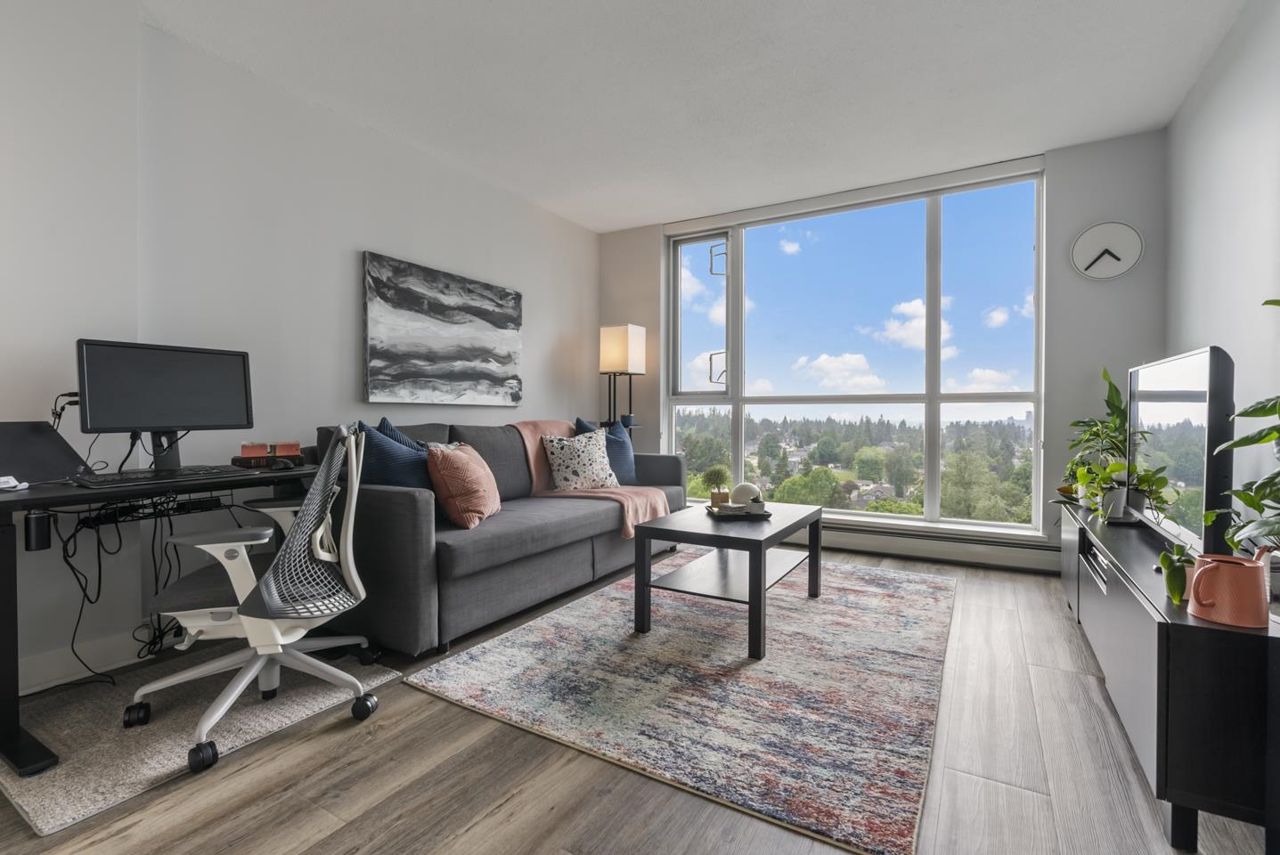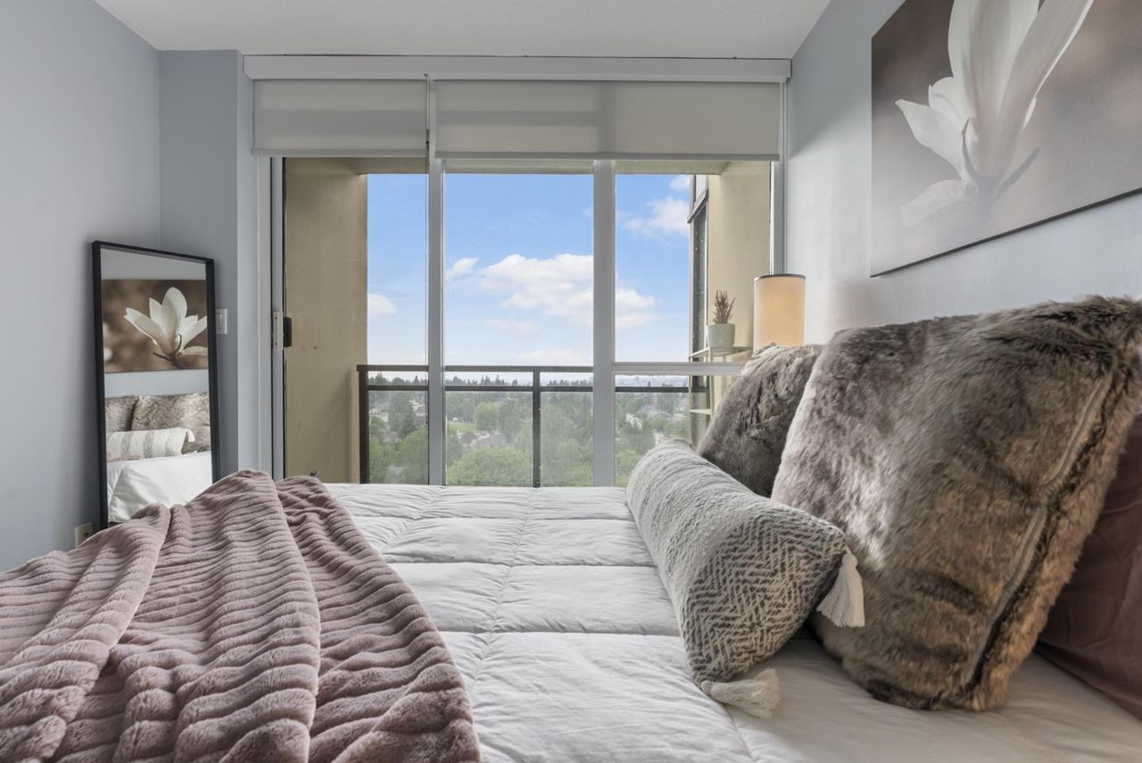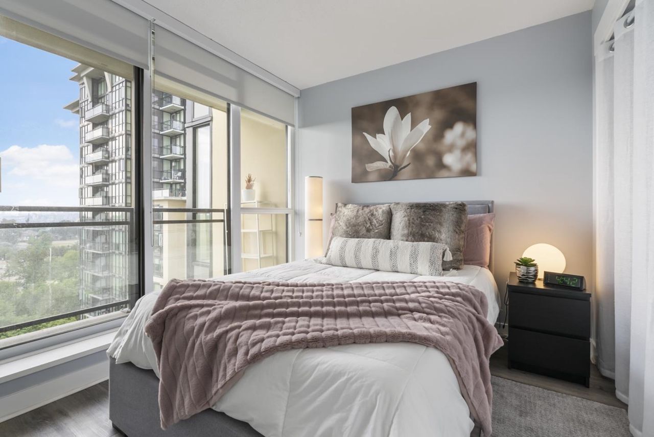 Tastefully updated 1BR+Den 1BTH North Surrey condo. Fresh paint & caulking throughout welcomes you into your stylish 15th-floor residence. New laminate flooring & underlay lead towards a modern living area illuminated by dazzling floor-to-ceiling windows with newer shades & screens. The sophisticated, gourmet kitchen features brand-new stainless steel appliances gleaming against glass-accented cabinetry & quartz-topped counters. Your tranquil bedroom offers a large closet with upgraded organizers & a private balcony boasting sweeping views of the city below. Your City Point home boasts secured underground parking, a fully equipped gym, a lush green courtyard & media lounge with fireplace. Perfectly located steps from Gateway Skytrain & Nesters Market with easy access to Patullo Bridge.