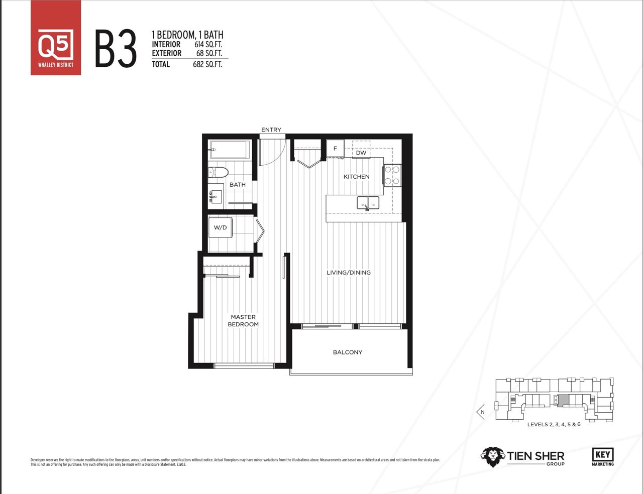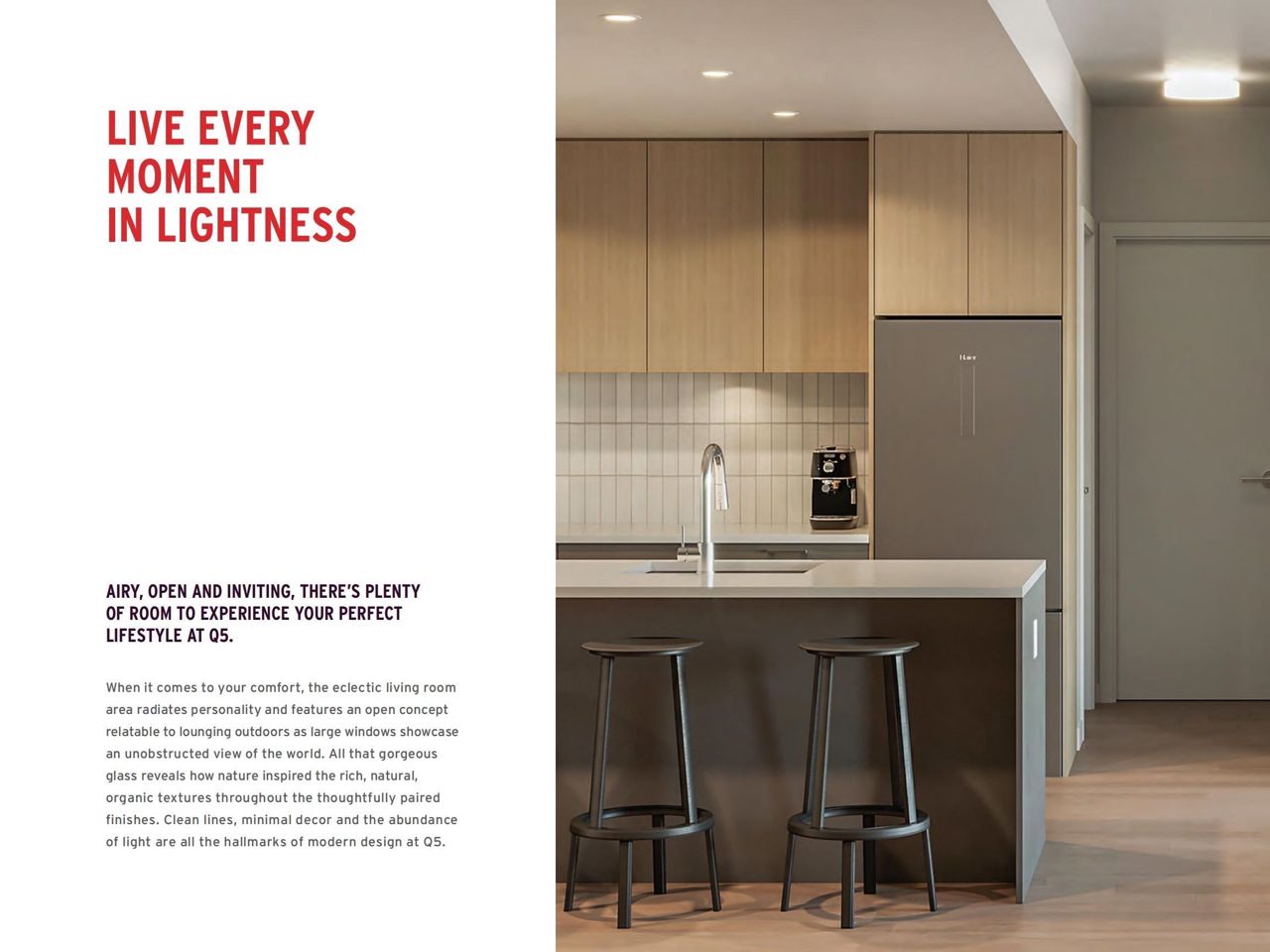 Q5 is a brand new six-storey collection of 141 spacious homes, ranging from studios to family-friendly 3-bedrooms. With next-level amenities and contemporary design, Q5 provides a rare opportunity for exceptional urban living surrounded by every convenience. The collection’s location in Whalley District offers access to the most exciting, energetic and rapidly evolving neighbourhood in Western Canada. The spirit of the urban environment celebrating technology, infrastructure, architecture, culture, history and community, all just steps from home at Q5. 614 sqft interior, 68 sqft exterior, 1 parking, 1 locker. Est. completion FEB 2024