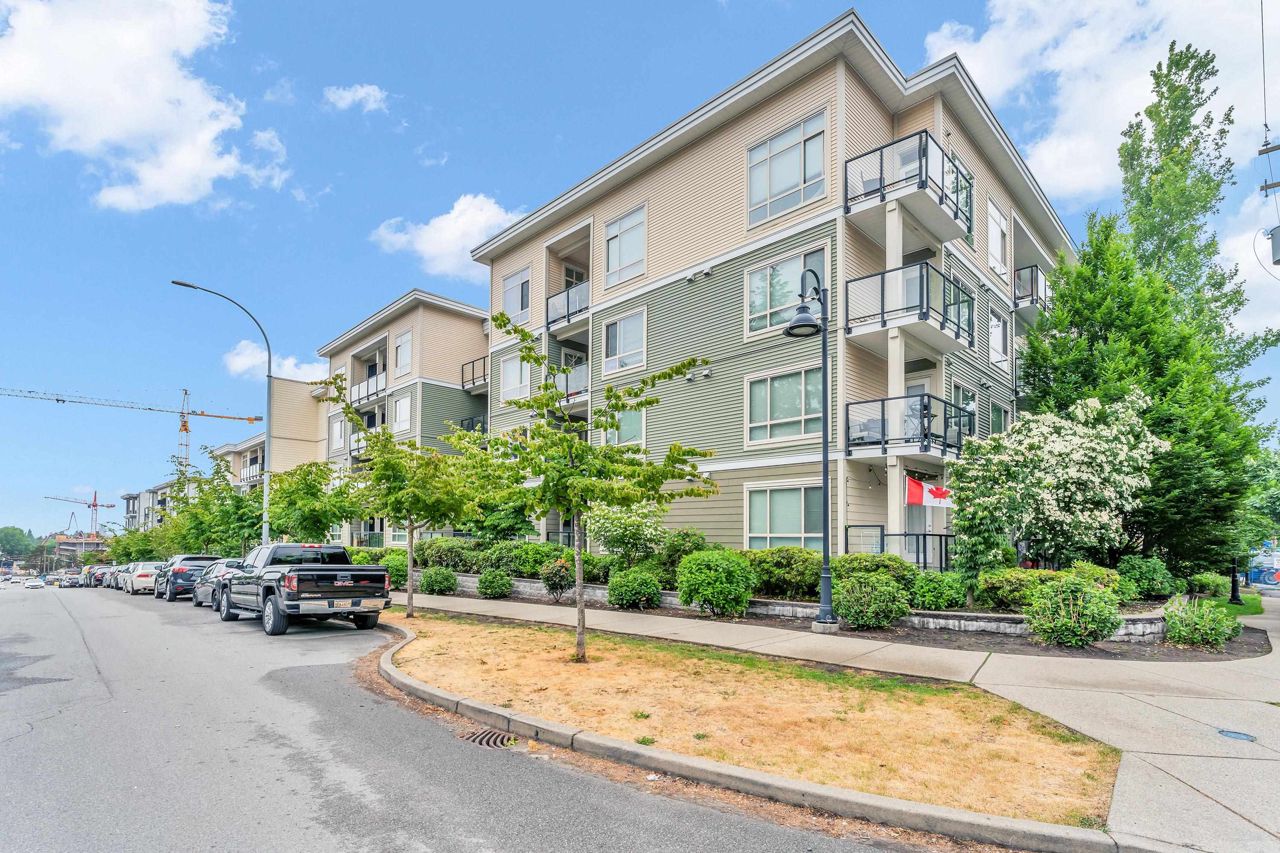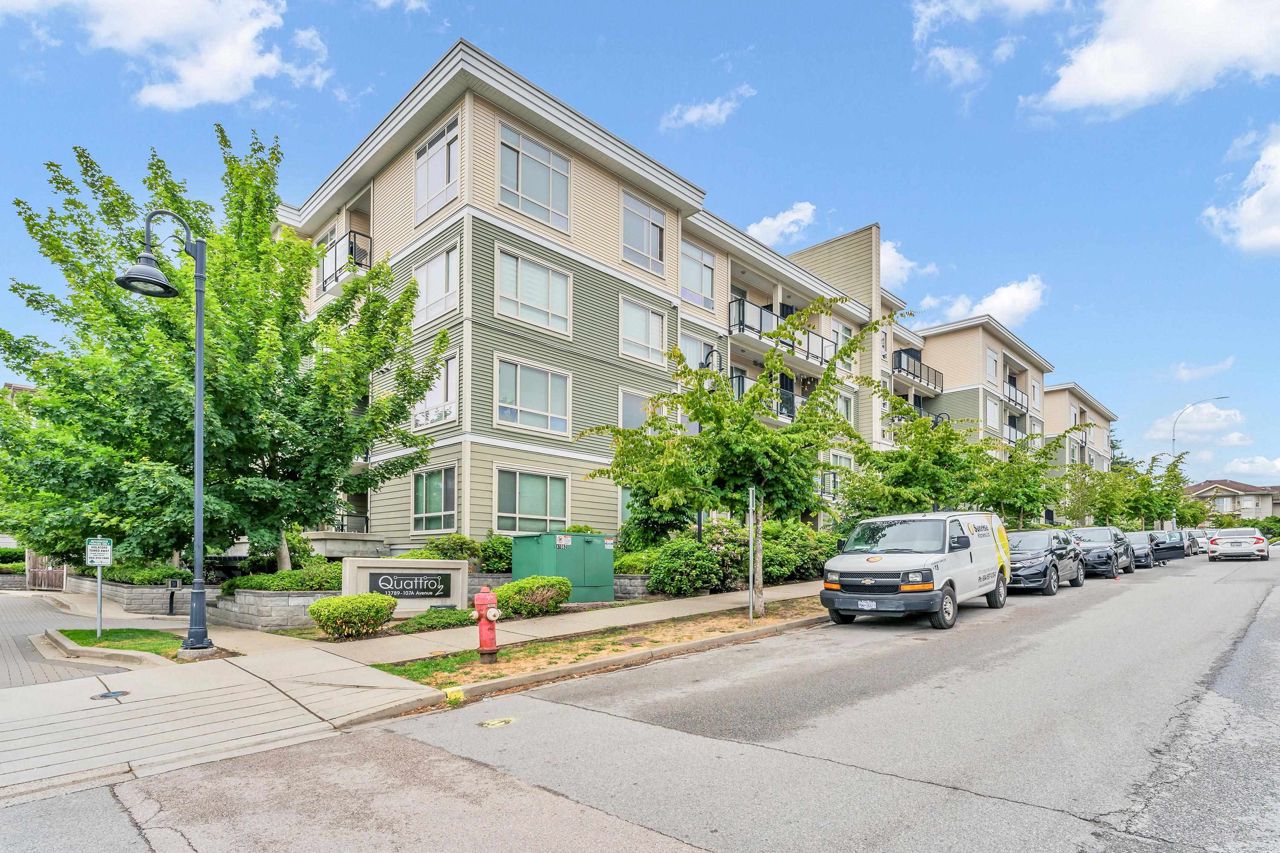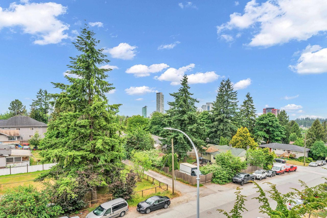 Welcome to Quattro 2 in North Surrey! This large south facing 1 bed and 1 bath penthouse (top floor) unit measured at 625sf. Very bright and spacious! Features laminate flooring, stainless steel appliances, open concept kitchen, insuite laundry, 10 foot ceilings and large covered balcony with city views! Comes with 1 parking and 1 locker. Amenities in this lovely building include a huge exercise centre, a playground perfect for kids to play on, and a quiet court yard. Centrally located to Skytrain, recreation, parks, schools and shopping. Great for investor or first time buyers. Rentals allowed, 1 cat or 1 dog allowed. **OPEN HOUSE July 22/23 SAT/SUN 2-4PM.**