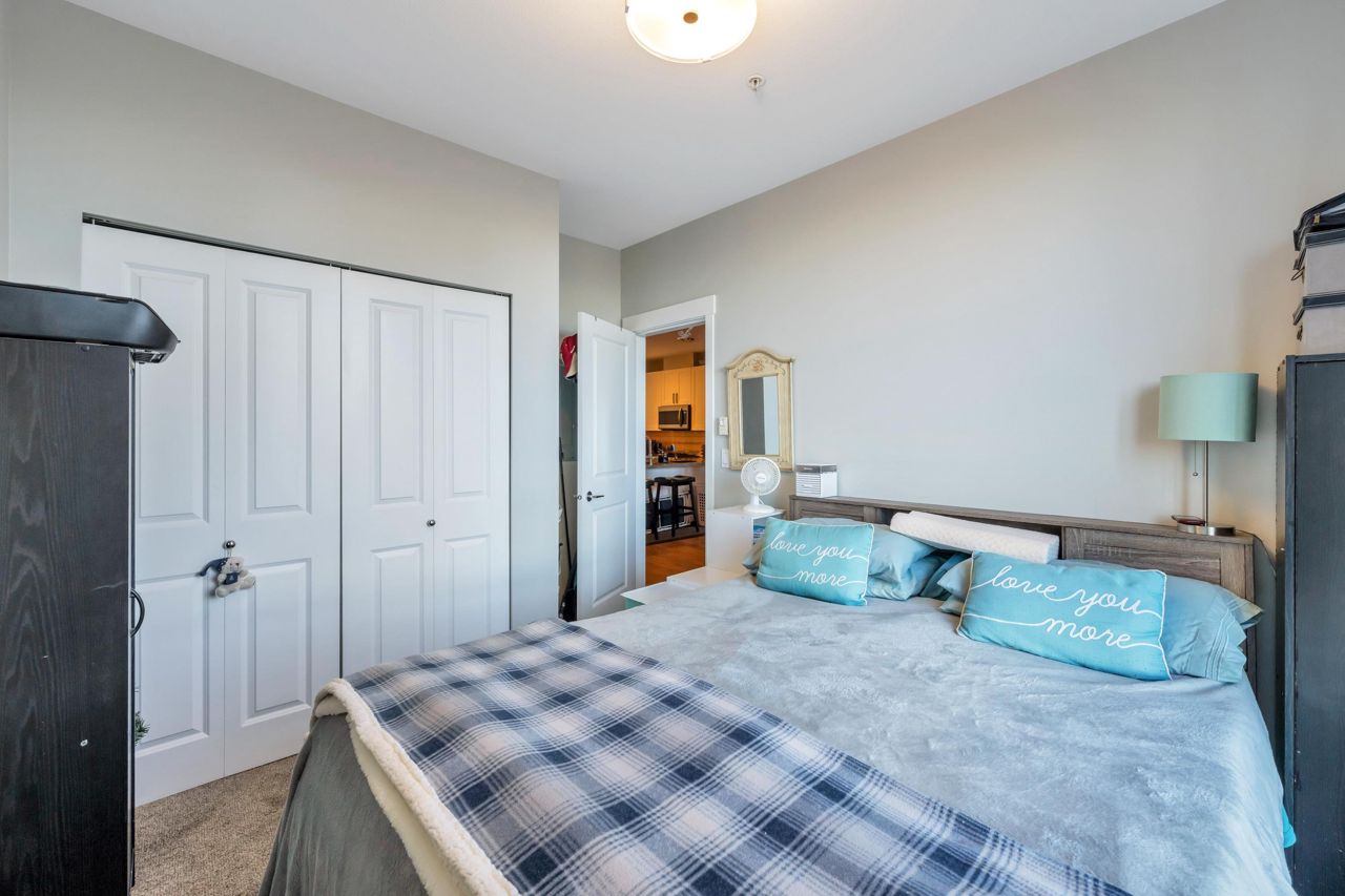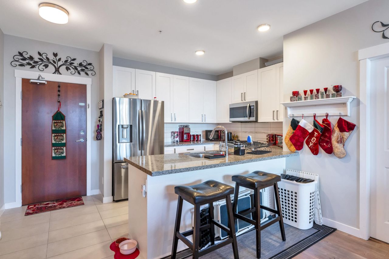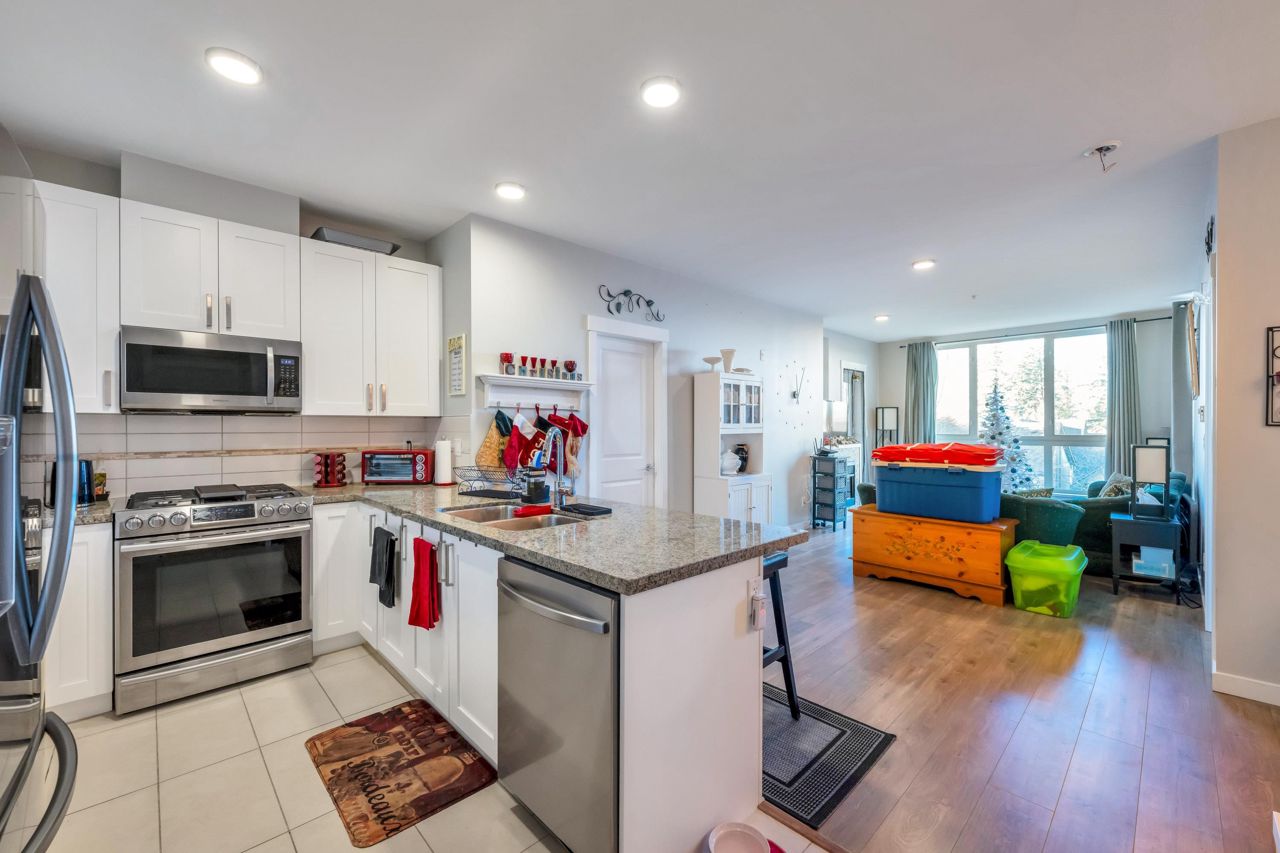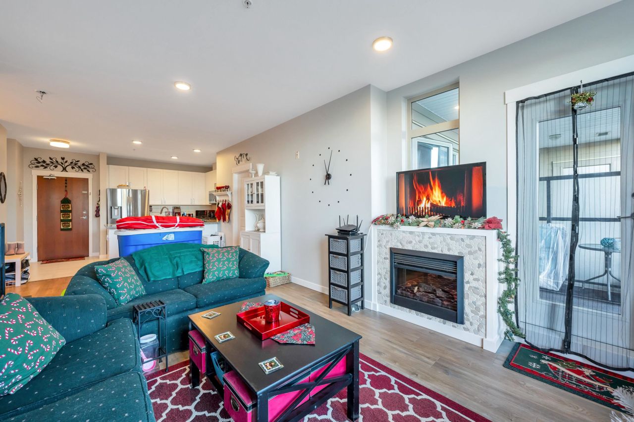 Welcome to The Morgan! This meticulously maintained two bedroom & den home is the epitome of quality. With large windows throughout, this unit is flooded w/ natural light. The kitchen boasts granite countertops, a breakfast bar w/room for 3, 2020 installed stainless steel appliances & gas range. The living room showcases a cozy fireplace & access to the covered balcony, ideal for enjoying your morning coffee. Modern flooring & newer paint throughout. Generous sized den perfect for a home office a bonus. The spacious Primary bedroom features a spa like ensuite offering the perfect retreat after a long day. The second bedroom & guest bath complete the living space. Amenities are many offering an exercise centre, outdoor pool & hot tub to name a few. One parking included. Pets Welcome.