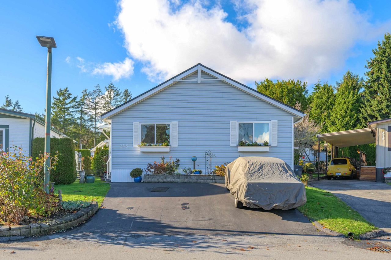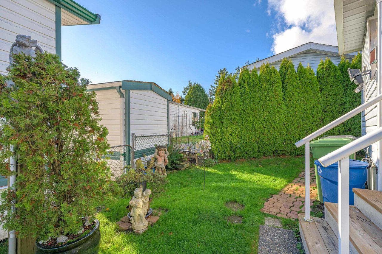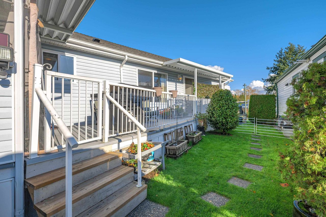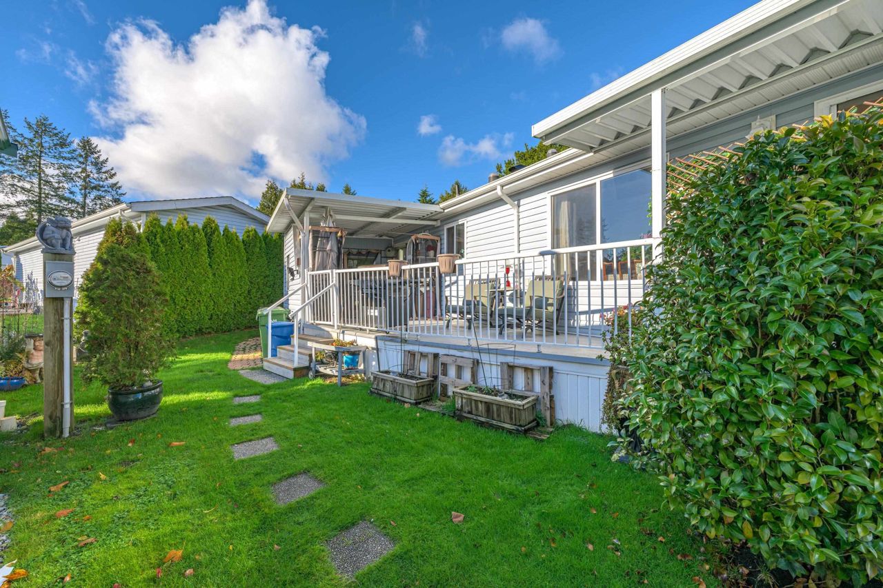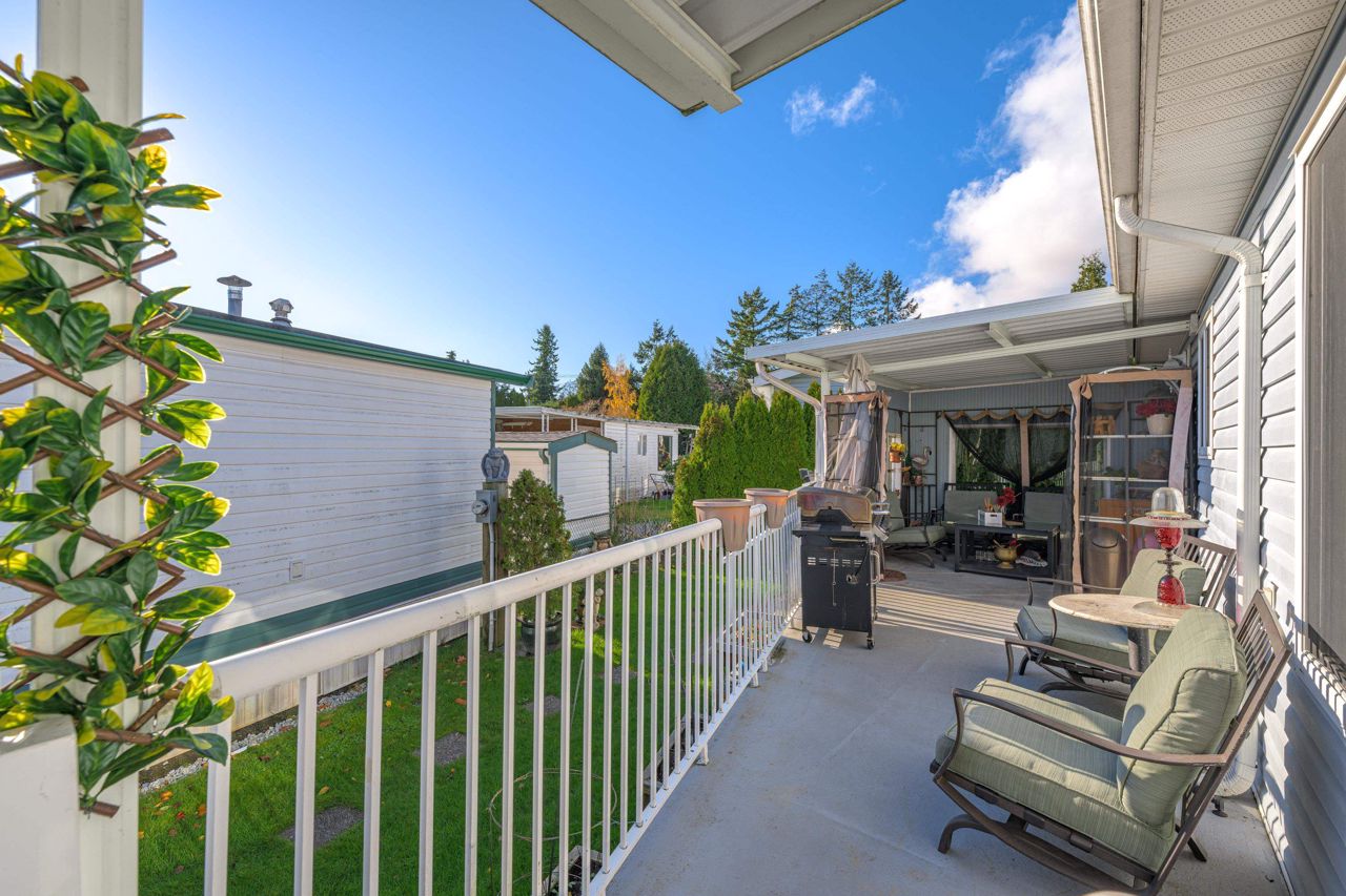 Welcome to your "Modular Home"! Feels like a house with a spacious bright floor plan, vaulted ceilings, 3 large Bdrms, 2 baths, double glazed windows, Gas stove top, wall oven, huge eat in kitchen and a separate dining/living room. Walk out to the amazing deck, partially covered with a cozy area for relaxing get togethers. Large workshop shed, plenty of storage and situated in a great location in the park! 3 yr old roof, lovely low maintenance yard. This home has been lovingly cared for by the current owners. This park has amazing amenities; outdoor heated pool, clubhouse, workout room, library, games room and walking trails. In a prime location near transit, shopping, US border and schools. Bring your 2 fur babies ... Cats and dogs, Dogs maximum height 20" at withers. A must see!