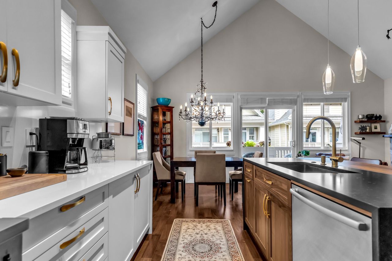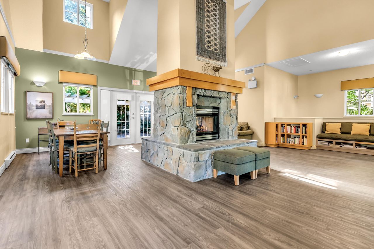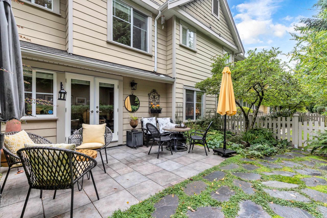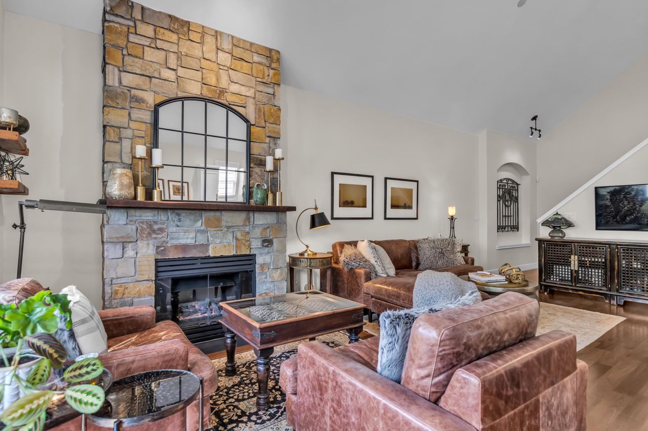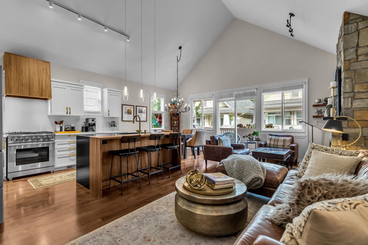 Welcome to Woodgrove! Move-in ready beautifully updated 1693 sq.ft. townhome. 3 bedrooms & 3 baths. Quiet southfacing fenced yard w resurfaced patio & flagstones. Maple hardwood & updated custom millwork throughout. Vaulted ceilings, new stone facing on gas fireplace, newer appliances, custom cabinets, island & stove hood w adjacent balcony for BBQ make the kitchen/great room perfect for entertaining. Huge primary bedroom w vaulted ceiling, 5 piece ensuite w heated floors & spacious WI closet with custom built-ins. Two spacious secondary bedrooms currently used as art studio & office. Ample storage. New furnace & hot water on demand. EV charger in SxS double garage. Roof nine years young. All ages & 2 pets welcome. Large central greenspace & well appointed clubhouse & exercise room.