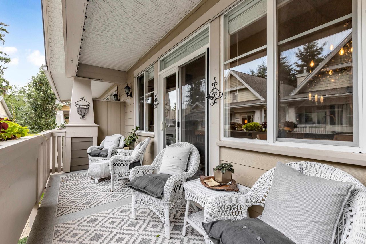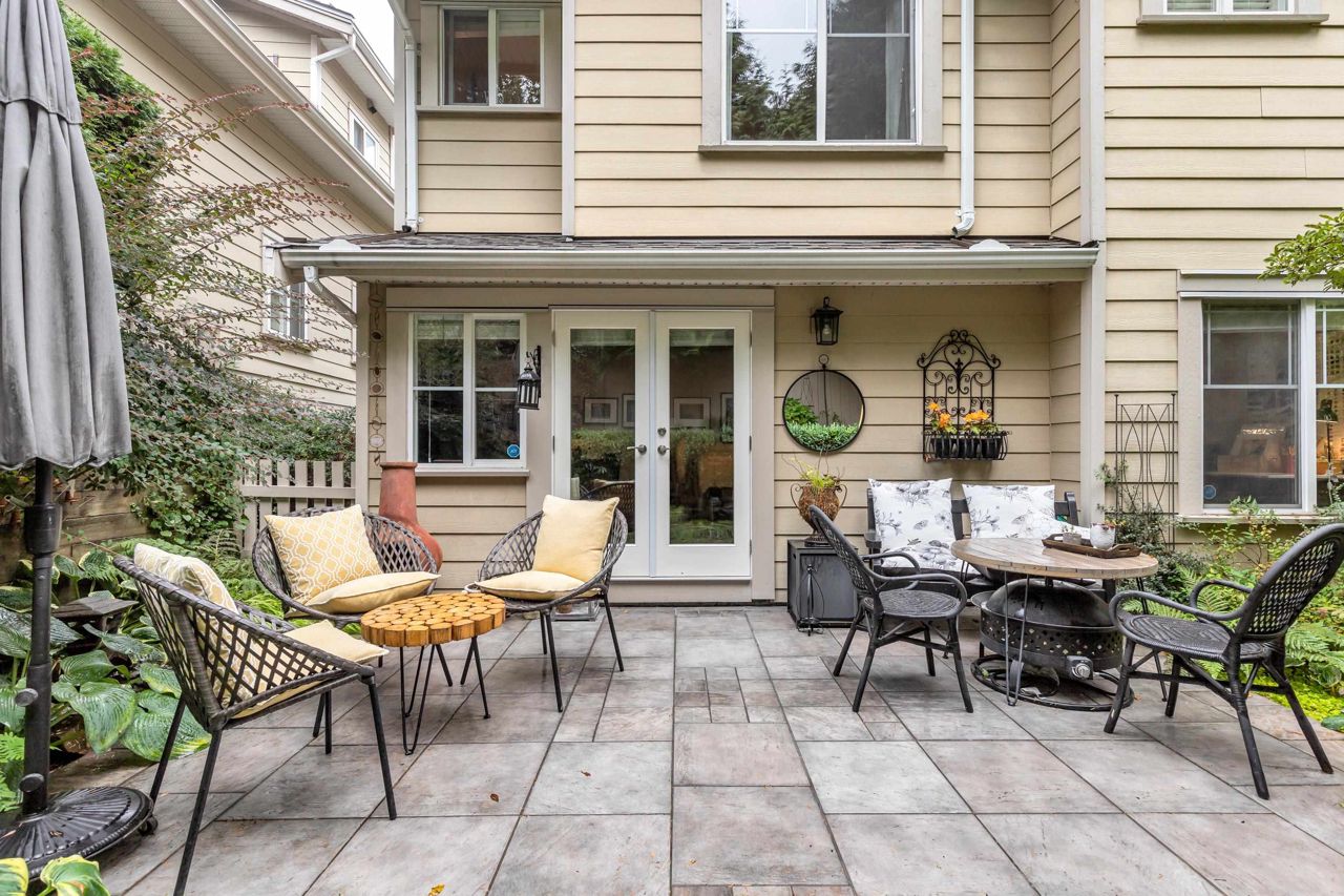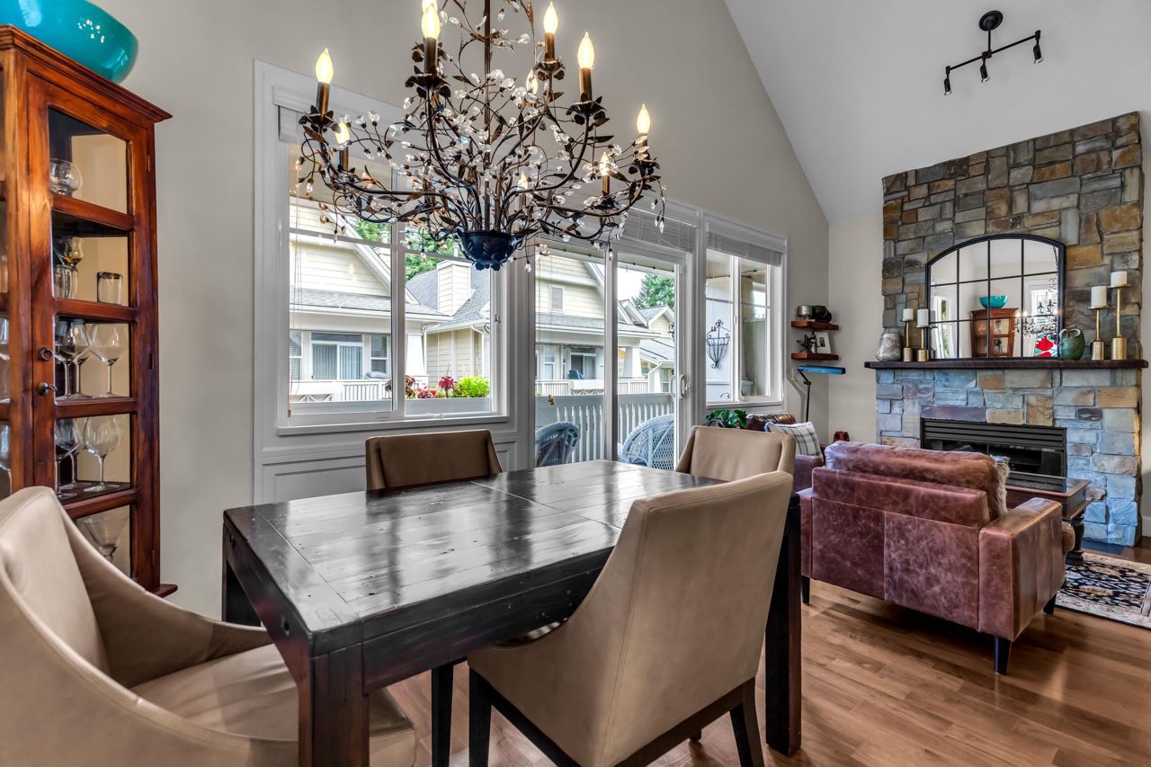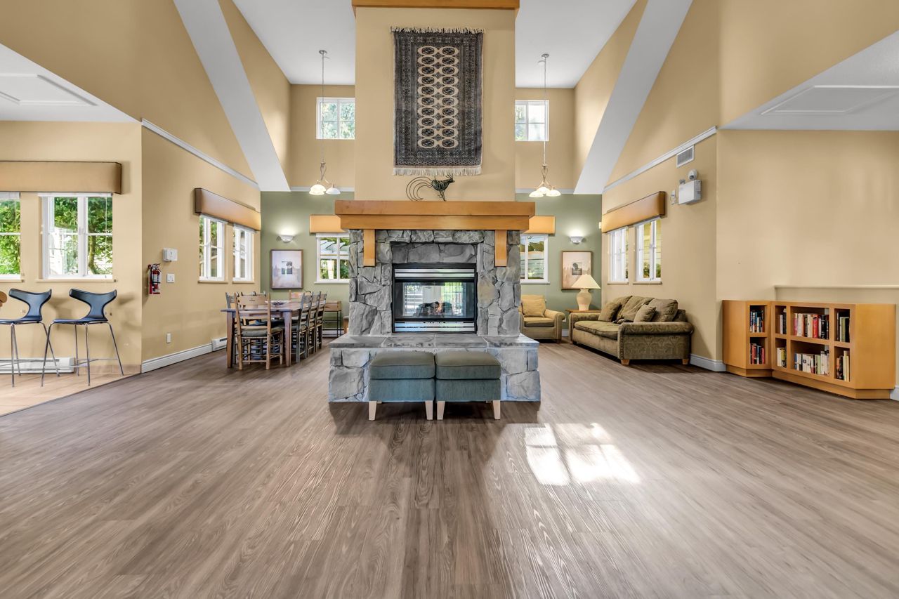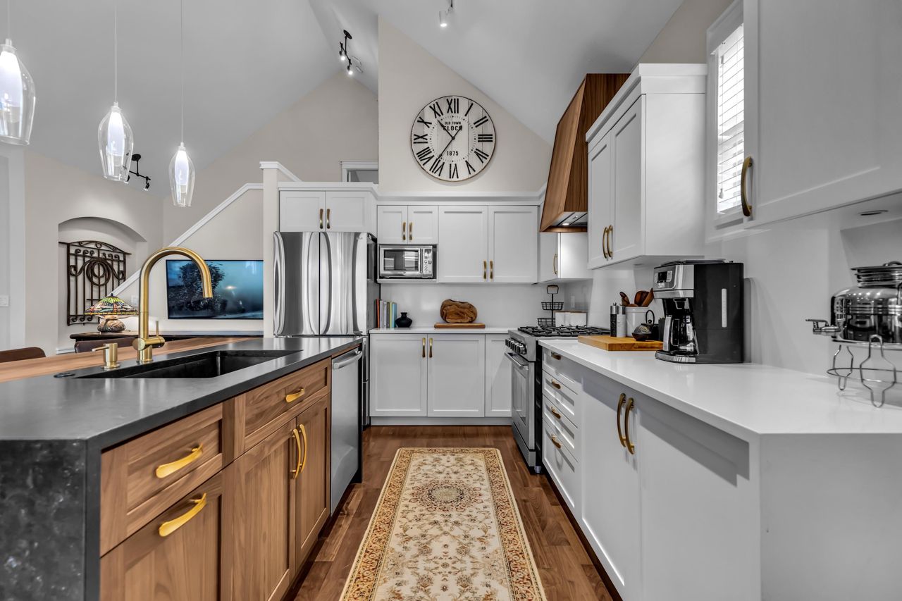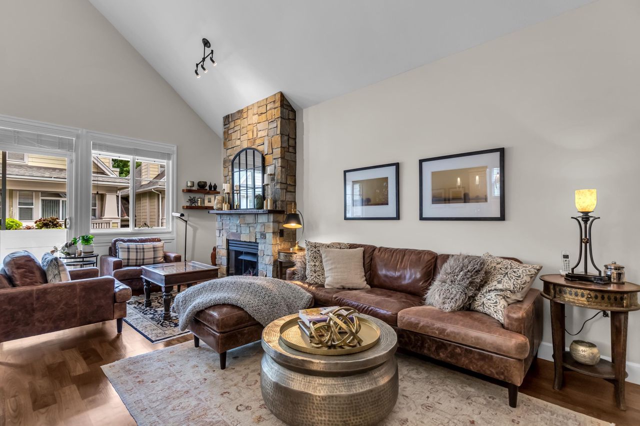 Welcome to Woodgrove! Move-in ready beautifully updated 1693 sq.ft. townhome. 3 bedrooms & 3 baths. Quiet southfacing fenced yard w resurfaced patio & flagstones. Maple hardwood & updated custom millwork throughout. Vaulted ceilings, new stone facing on gas fireplace, newer appliances, custom cabinets, island & stove hood w adjacent balcony for BBQ make the kitchen/great room perfect for entertaining. Huge primary bedroom w vaulted ceiling, 5 piece ensuite w heated floors & spacious WI closet with custom built-ins. Two spacious secondary bedrooms currently used as art studio & office. Ample storage. New furnace & hot water on demand. EV charger in SxS double garage. Roof nine years young. All ages & 2 pets welcome. Large central greenspace & well appointed clubhouse & exercise room.