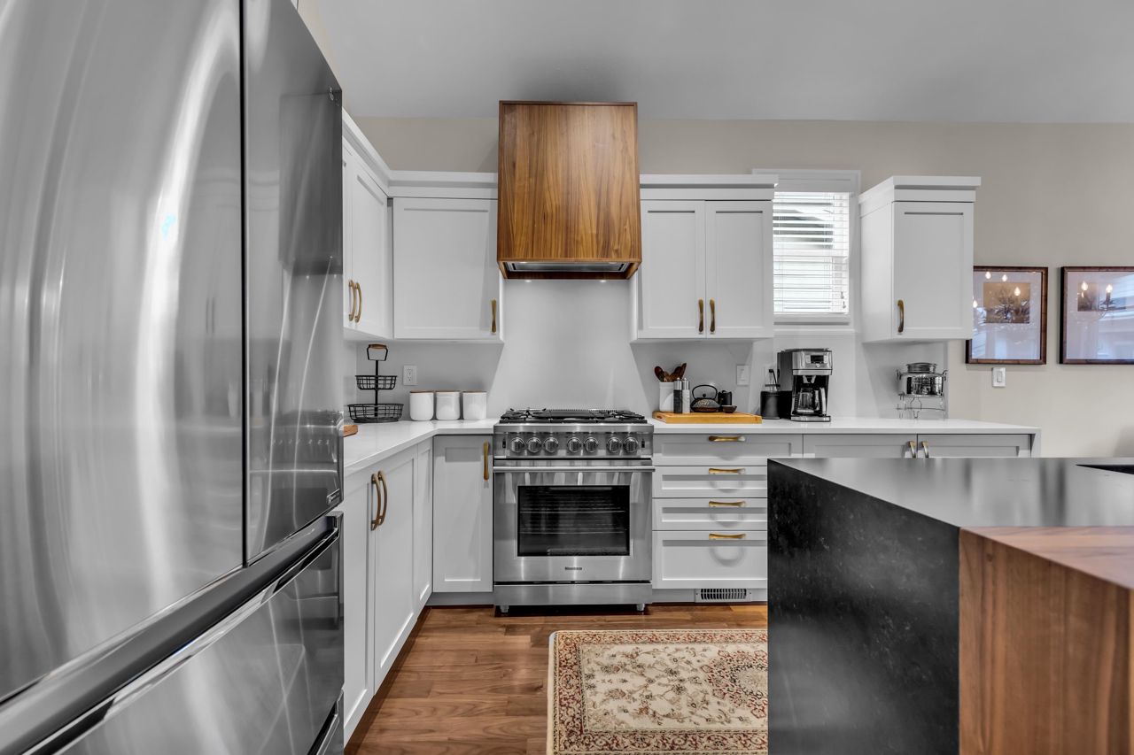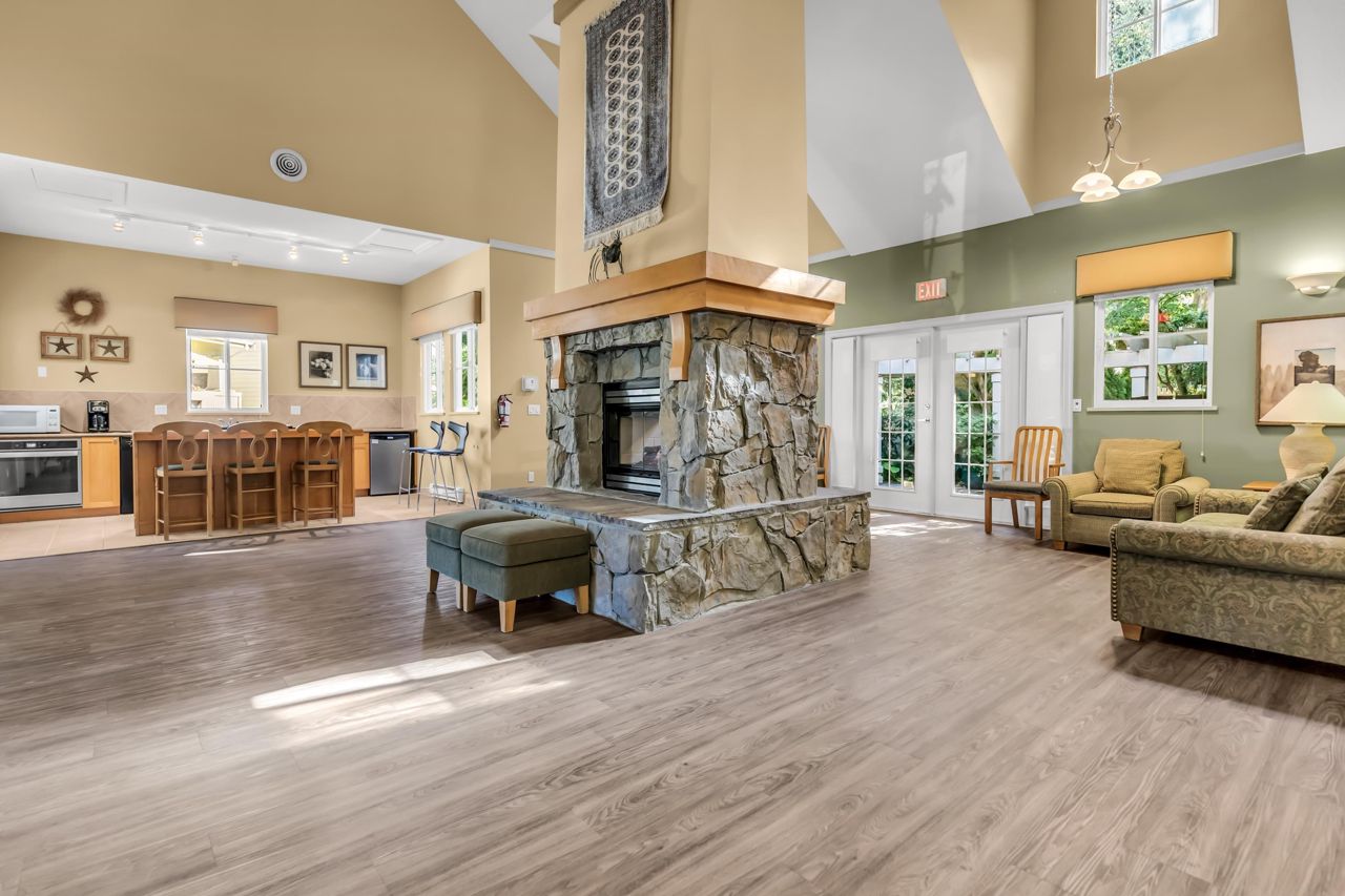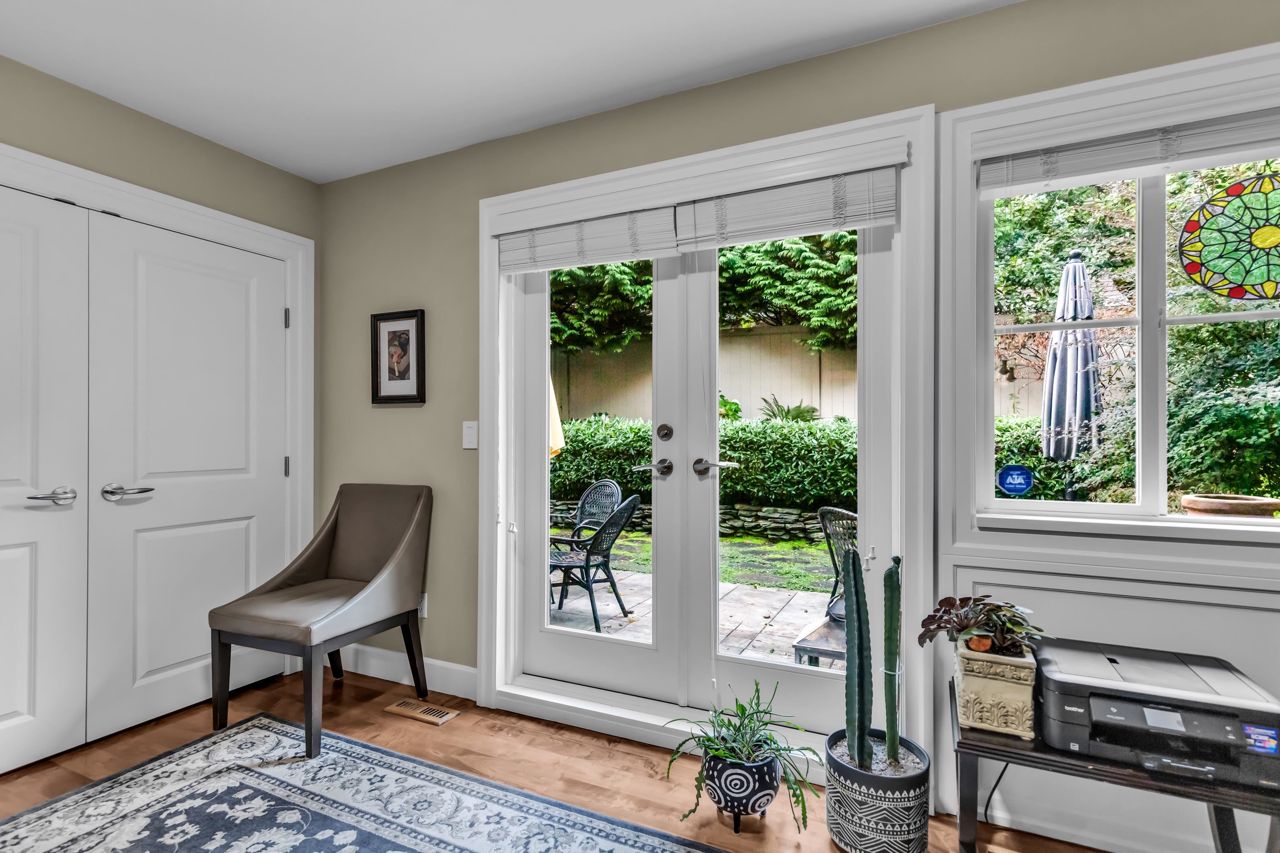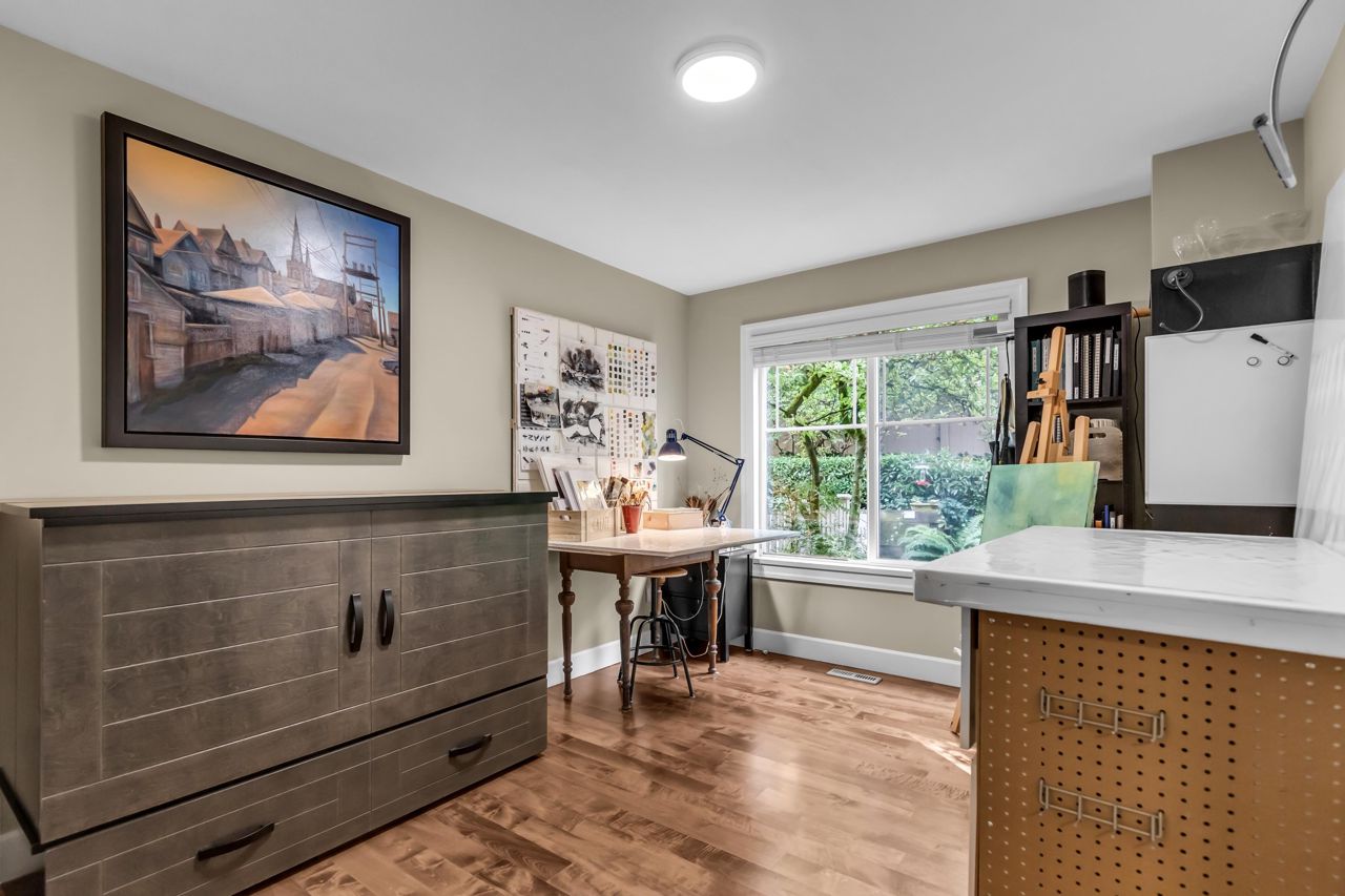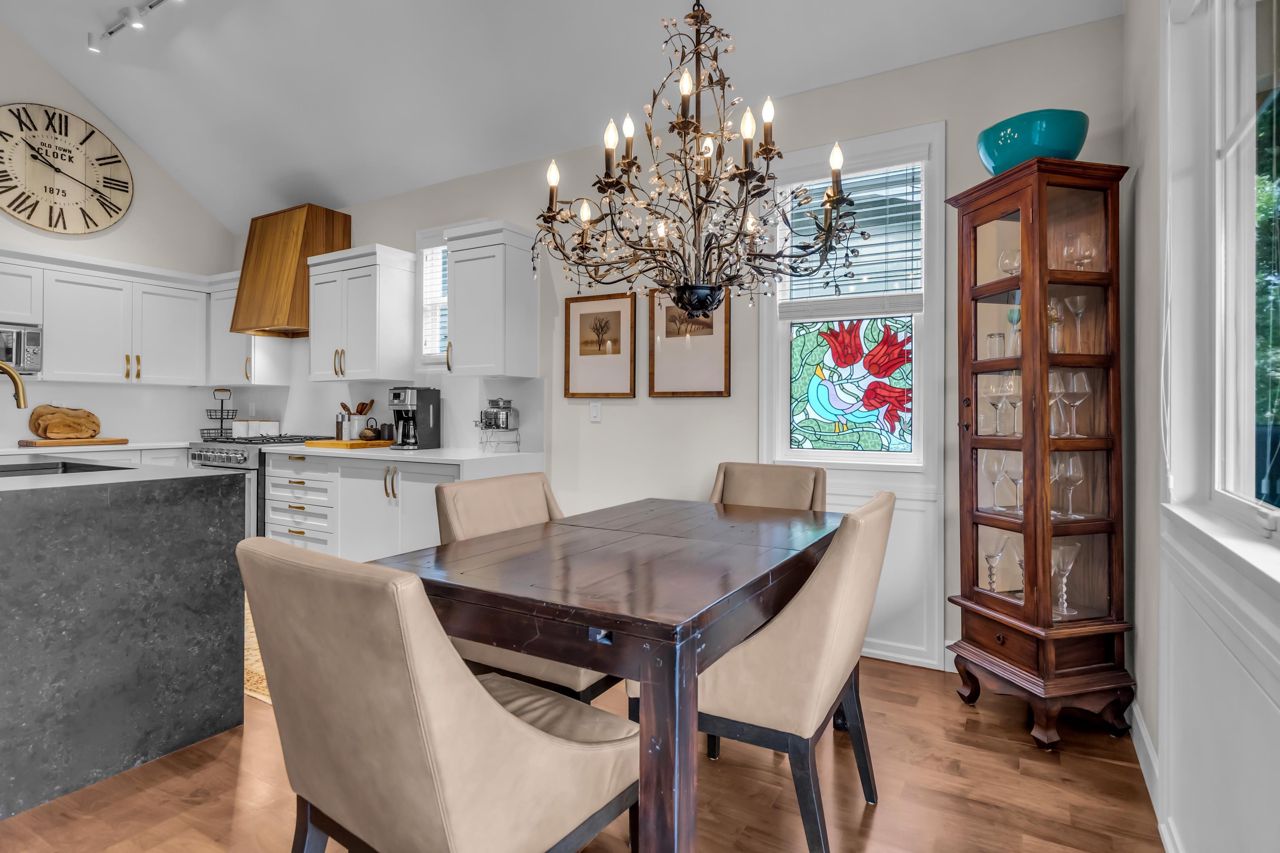 Welcome to Woodgrove! Move-in ready beautifully updated 1693 sq.ft. townhome. 3 bedrooms & 3 baths. Quiet southfacing fenced yard w resurfaced patio & flagstones. Maple hardwood & updated custom millwork throughout. Vaulted ceilings, new stone facing on gas fireplace, newer appliances, custom cabinets, island & stove hood w adjacent balcony for BBQ make the kitchen/great room perfect for entertaining. Huge primary bedroom w vaulted ceiling, 5 piece ensuite w heated floors & spacious WI closet with custom built-ins. Two spacious secondary bedrooms currently used as art studio & office. Ample storage. New furnace & hot water on demand. EV charger in SxS double garage. Roof nine years young. All ages & 2 pets welcome. Large central greenspace & well appointed clubhouse & exercise room.