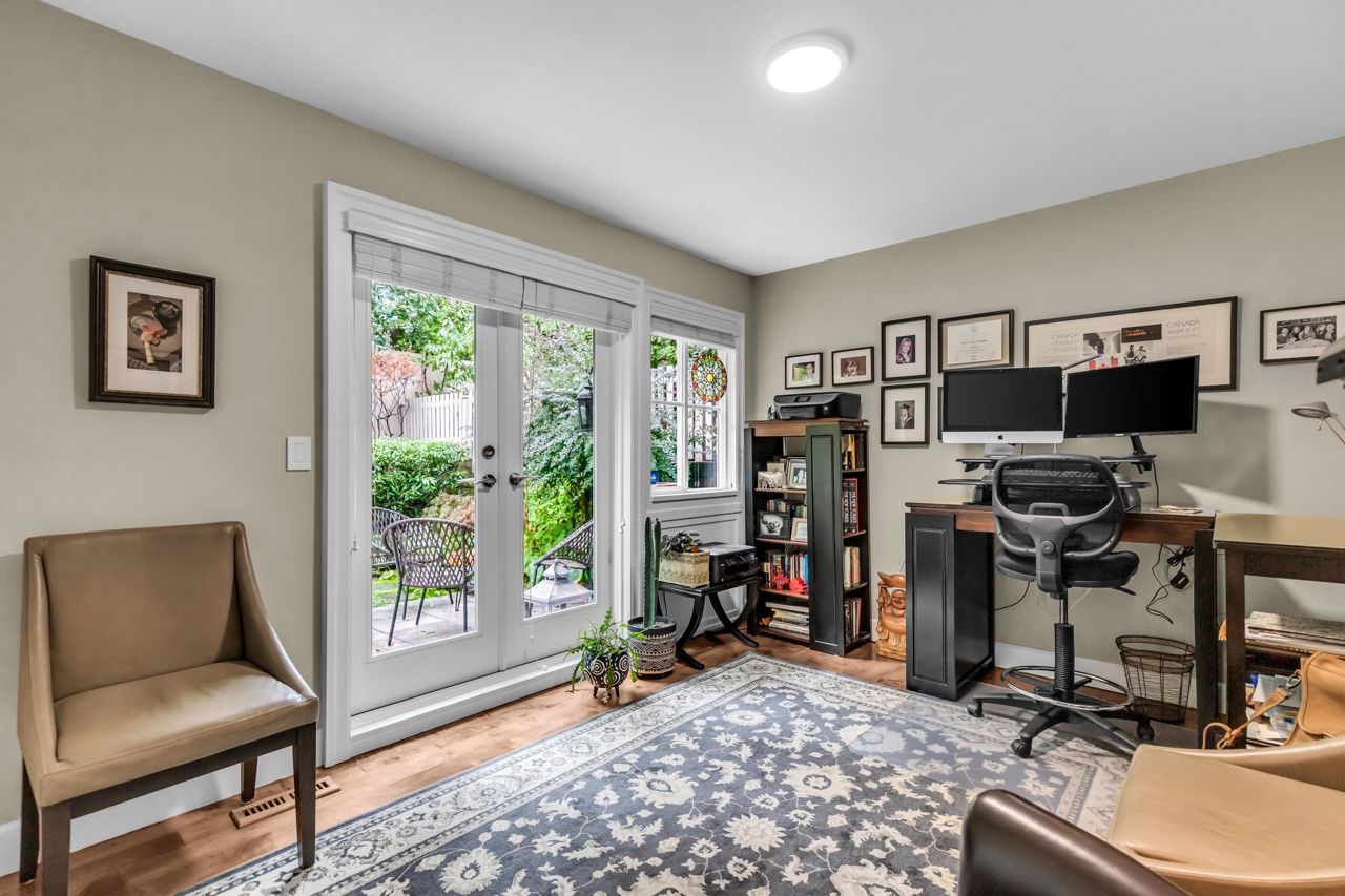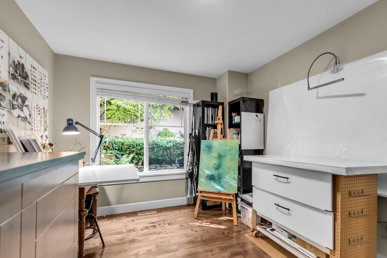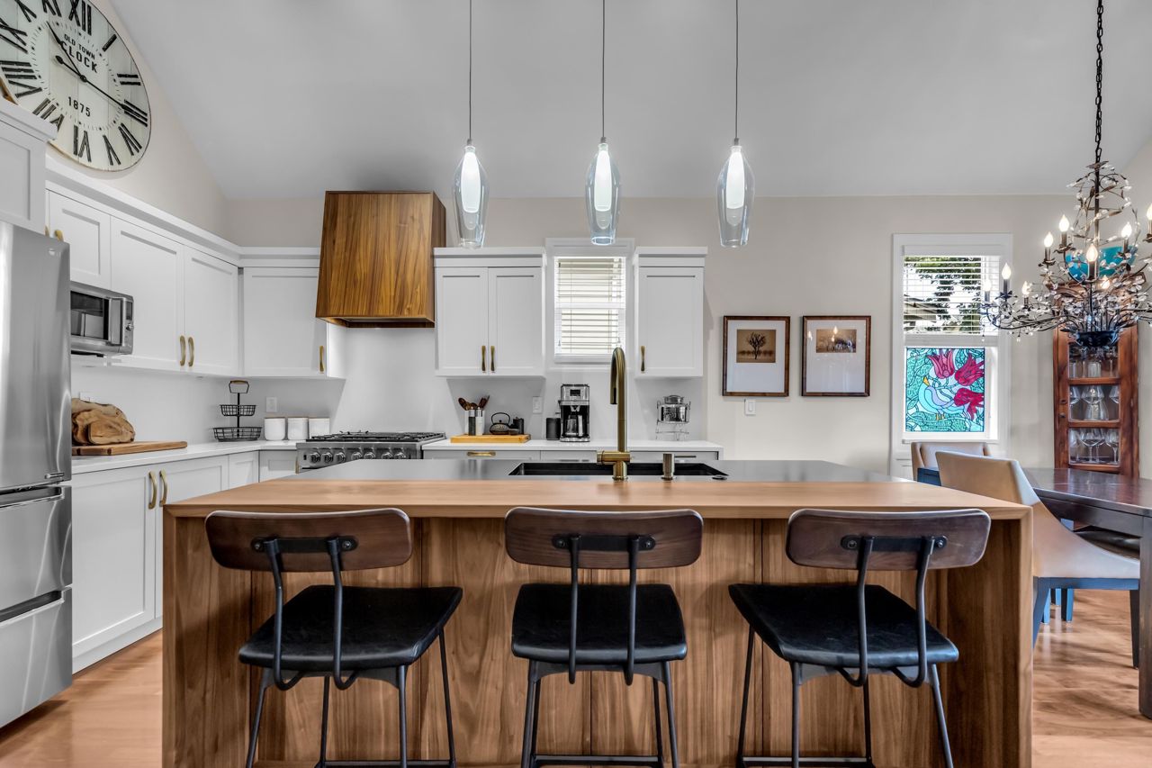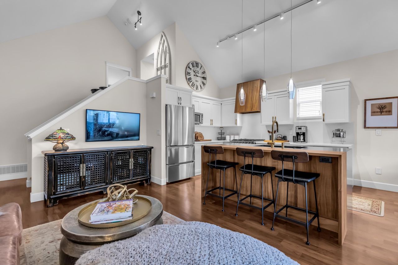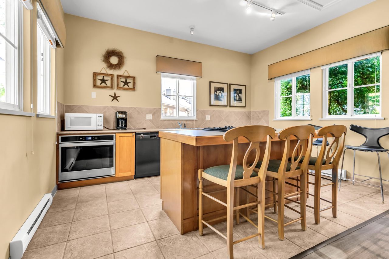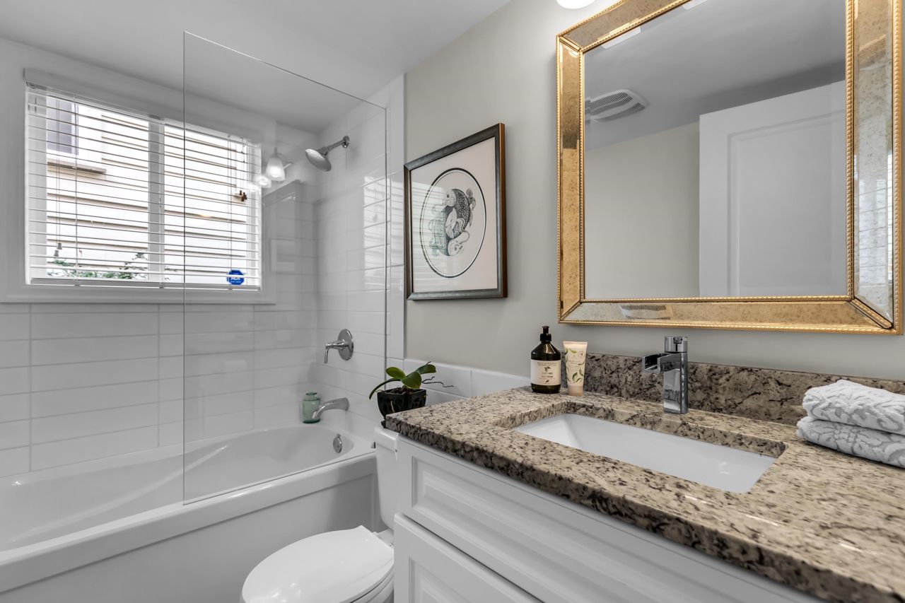 Welcome to Woodgrove! Move-in ready beautifully updated 1693 sq.ft. townhome. 3 bedrooms & 3 baths. Quiet southfacing fenced yard w resurfaced patio & flagstones. Maple hardwood & updated custom millwork throughout. Vaulted ceilings, new stone facing on gas fireplace, newer appliances, custom cabinets, island & stove hood w adjacent balcony for BBQ make the kitchen/great room perfect for entertaining. Huge primary bedroom w vaulted ceiling, 5 piece ensuite w heated floors & spacious WI closet with custom built-ins. Two spacious secondary bedrooms currently used as art studio & office. Ample storage. New furnace & hot water on demand. EV charger in SxS double garage. Roof nine years young. All ages & 2 pets welcome. Large central greenspace & well appointed clubhouse & exercise room.