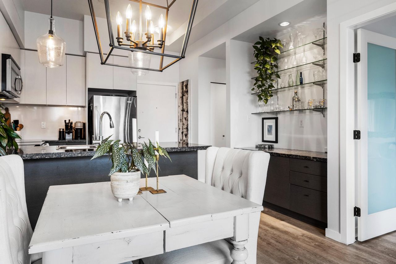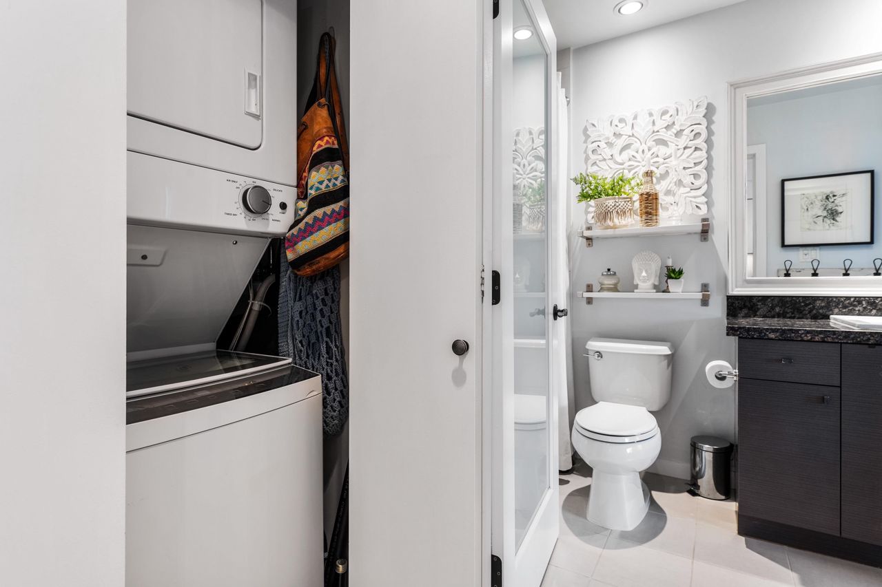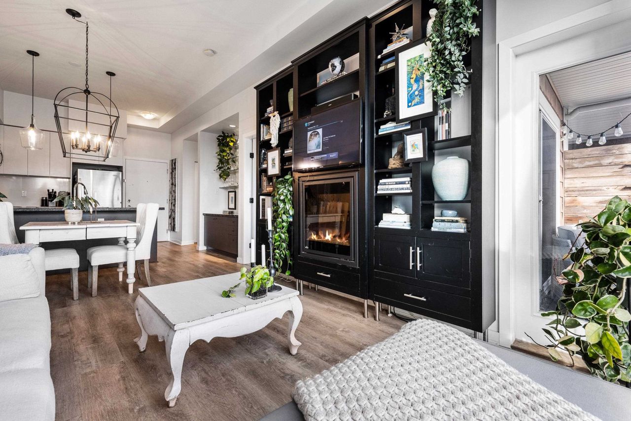 Welcome to the desirable Waterstone! This stunning 1 bedroom PENTHOUSE features vinyl plank flooring, a MODERN KITCHEN with granite counters, stainless steal appliances, updated light fixtures and a custom built in with cabinets and glass shelving. The living room offers plenty of natural light from the LARGE WINDOWS. The spacious bedroom has access to the 4 piece bathroom and a large sliding glass door leading to the NICE SIZED PATIO with privacy screen and VIEWS OF THE WATER FEATURE. This condo also includes a new in-suite washer and dryer. Waterstone offers resort style amenities including INDOOR 60' LAP POOL, HOT TUB, dry and steam sauna, well equipped fitness centre, 17 seat theatre room, game room and more! Call for more info!
