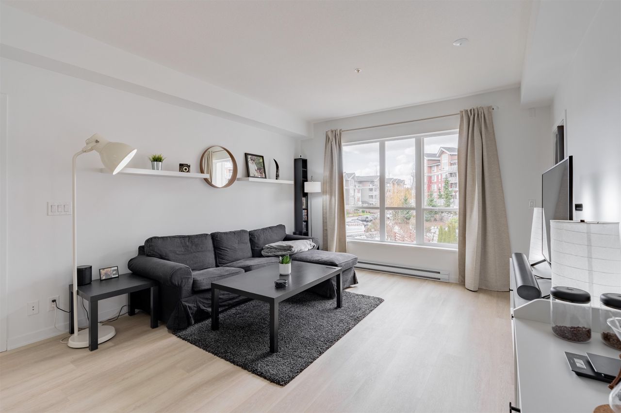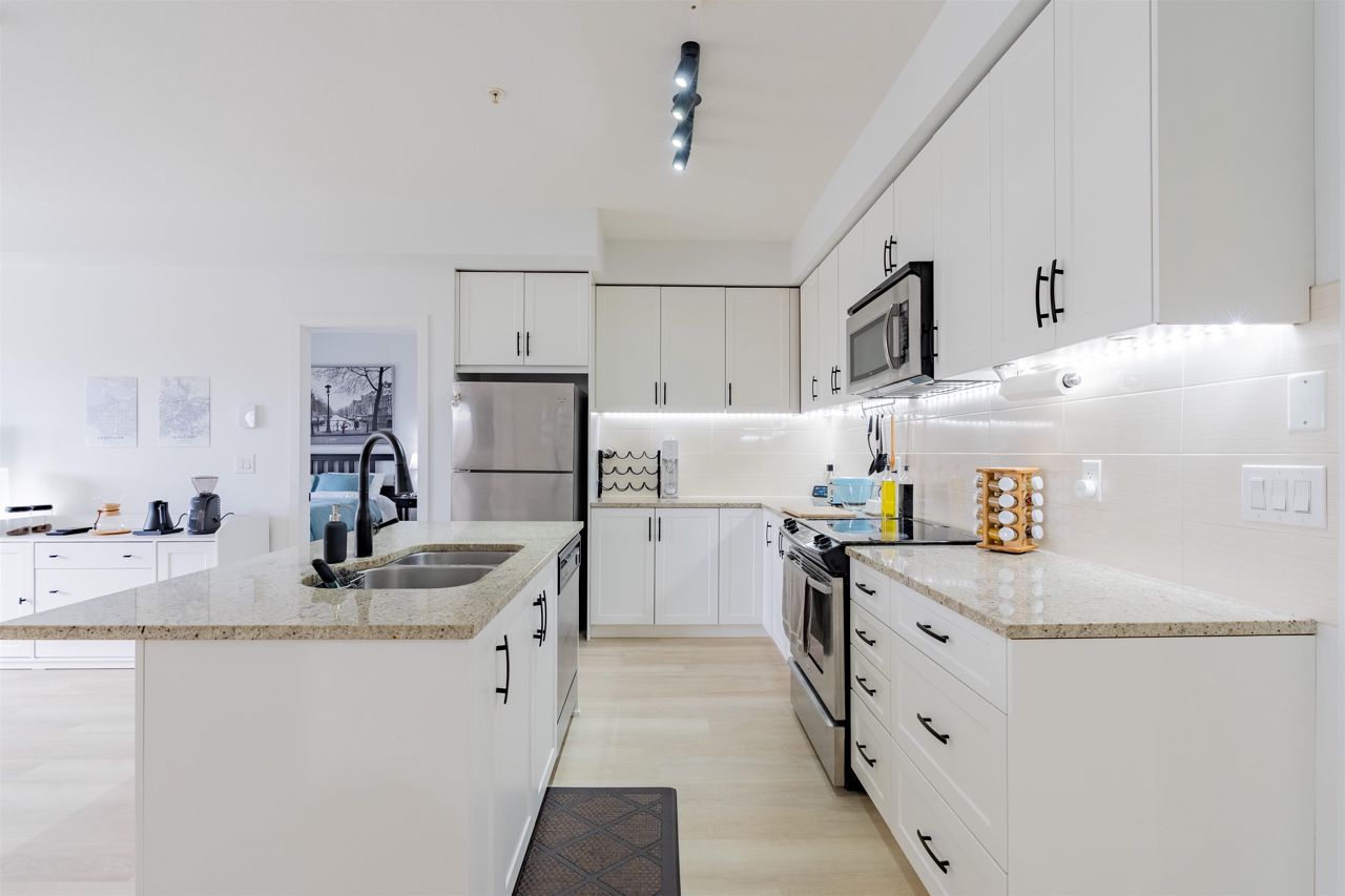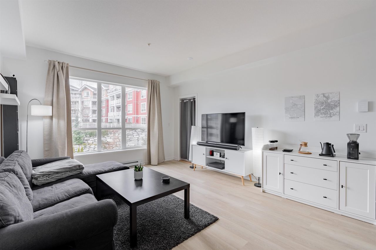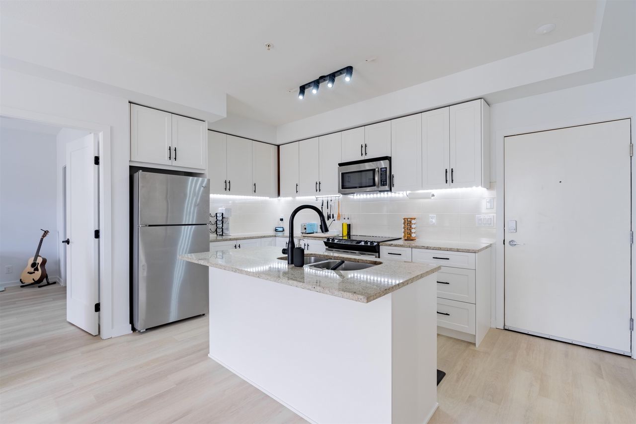 Welcome home to your bright West facing, updated 2 bed 2 bath condo in desirable Waterstone. This ideal layout features a large open living area dividing each bedroom. Updated kitchen cabinets, brand new flooring, newer washer and dryer, and fresh paint make this move in ready with nothing to do. Waterstone comes complete with one of the best amenity centres including a 17 seat theatre, indoor pool, dry & steam saunas, fully equipped fitness centre, chef's kitchen, fireside lounges, fire pit, games room & more! Centrally located within walking distance of grocery stores, restaurants, pubs, breweries, Hwys 1 & 10 and future Skytrain. Open House CANCELLED