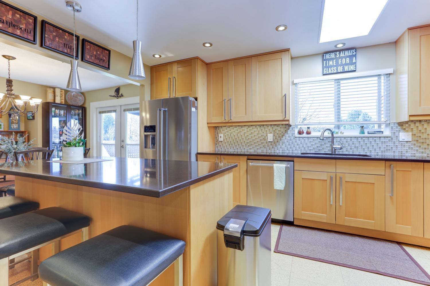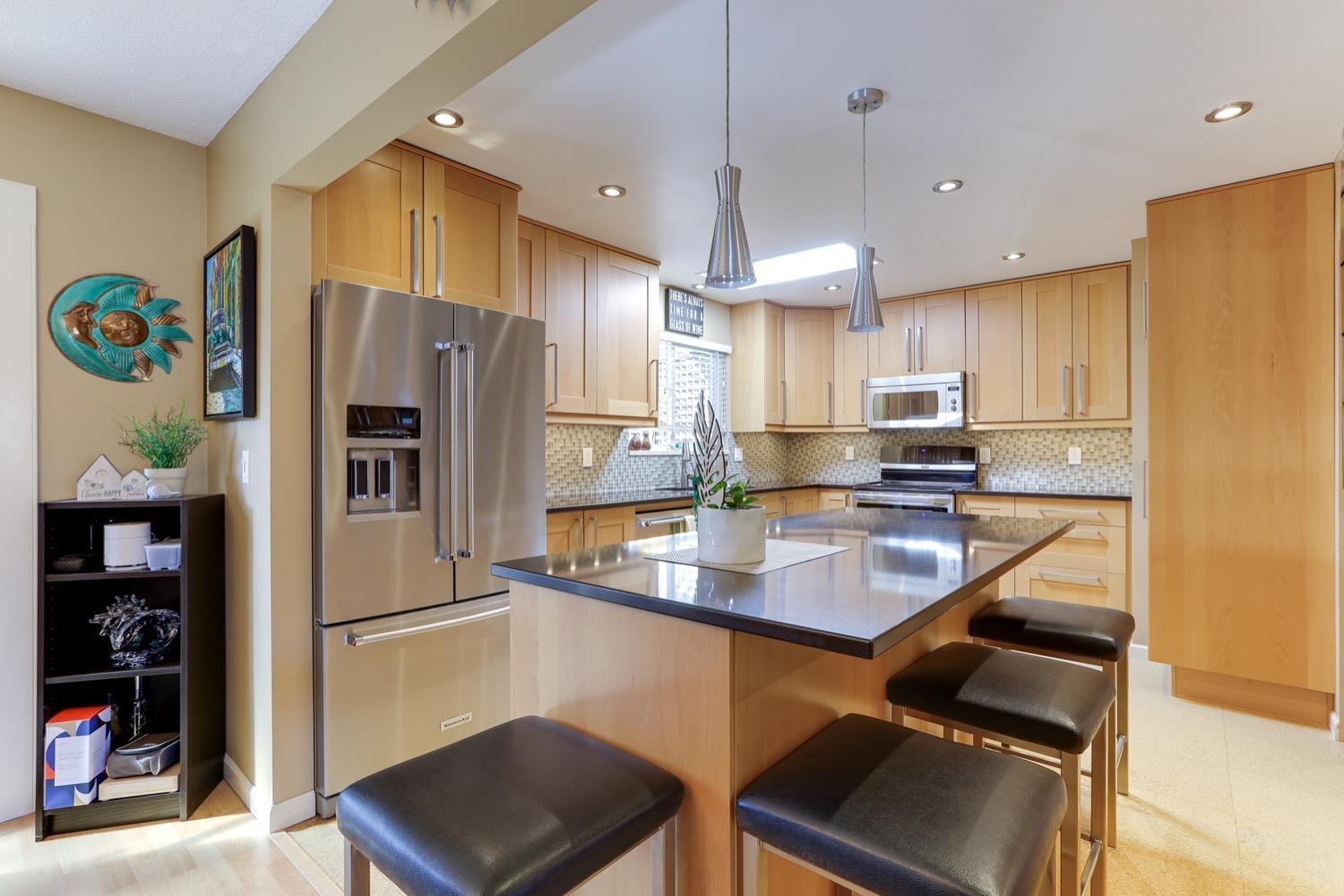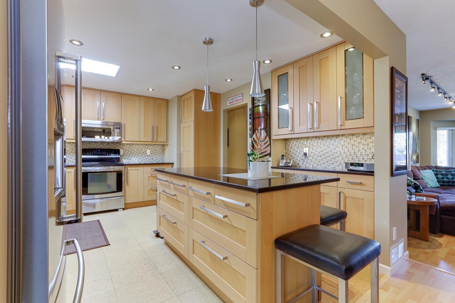 Designed with love for families! Original owners have beautifully maintained this warm, comfortable family home. Loving touches include updated kitchen with quartz topped large island, cork floor for comfort, skylight for added brightness. Family size diningroom offers direct access to covered, tiered deck with hot tub, party size livingroom features centre gas fireplace. Primary BR includes 3 pce ensuite, double closets, remaining bedrooms great for kids or guests. Lower floor includes family/rec room with centre gas fireplace, built in desk ideal for home office or studies, 4th BR, 3 pce bath with double shower, laundry area, storage, direct access to garage and gorgeous fenced yard offers fruit trees, huge patio, more storage, pergola. Bonus! 100 foot swale at back guarantees privacy! (id:22211)
