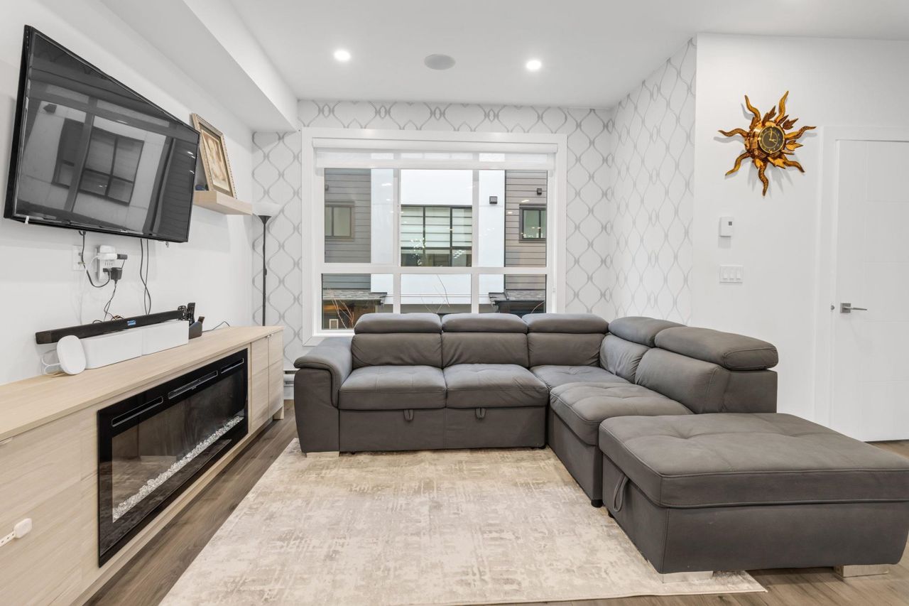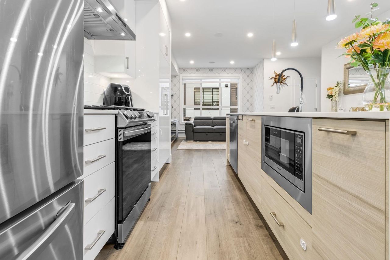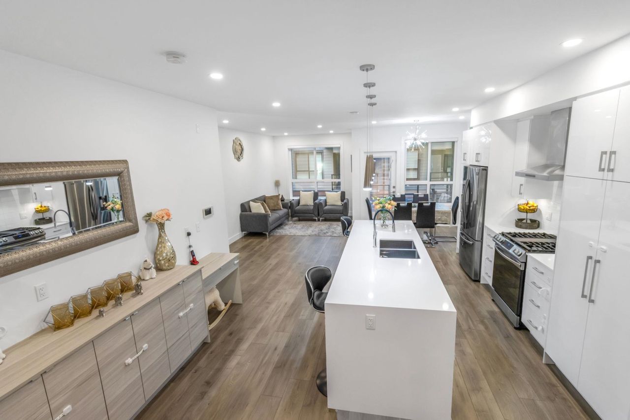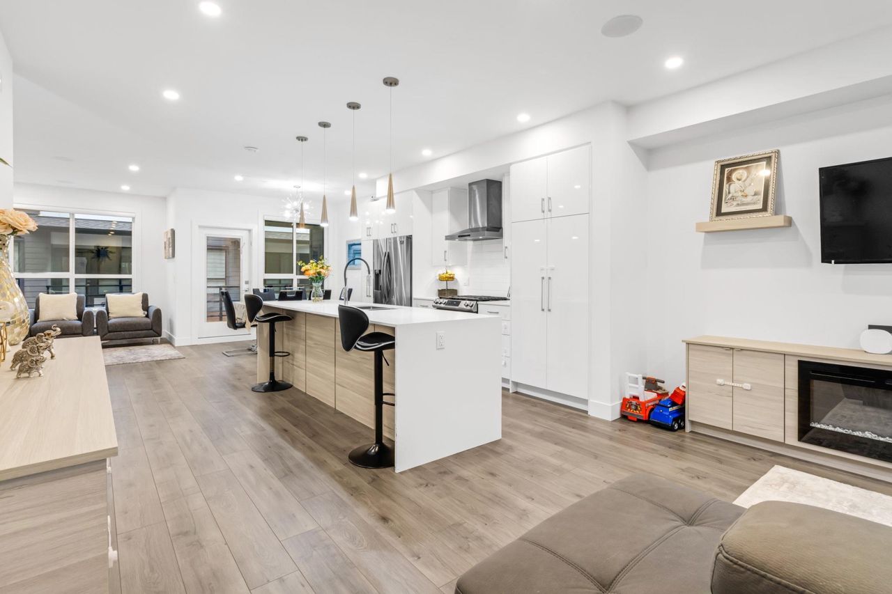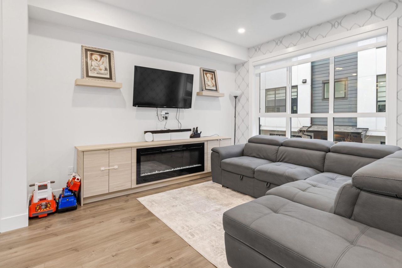 Welcome Home to beautiful Spacious 4 Bed + 4 Bath Unit !! Ground level has spacious Bedroom with ensuite and Extra wide side by side garage. Bright and Spacious Main level comes with Kitchen, Dinning, powder w/r and 2 living areas with modern entertainment unit,upgraded shelves and cozy upgraded fireplace. Built in speakers throughout.open concept kitchen with quality appliances, pull out drawers in Pantry with extra upgraded pantry too,Gas Stove,built in hutch and work station. Covered balcony with gas hookup for BBQ. Upper level has 3 spacious bedrooms with oversized windows, Side by side laundry with custom shelving. Huge Master bedroom comes with 11 ft vaulted ceiling, ensuite washroom and 3 separate closets. Close proximity to schools, recreation and transit.