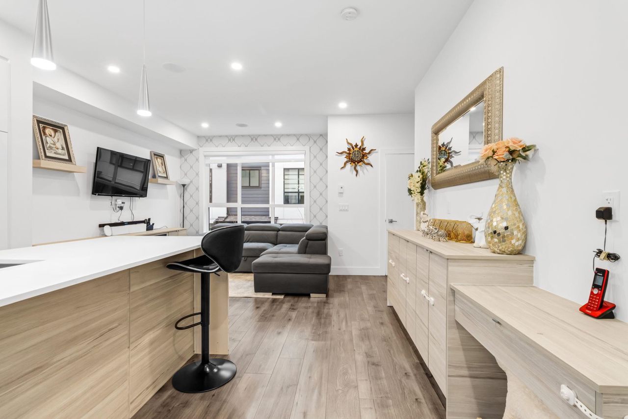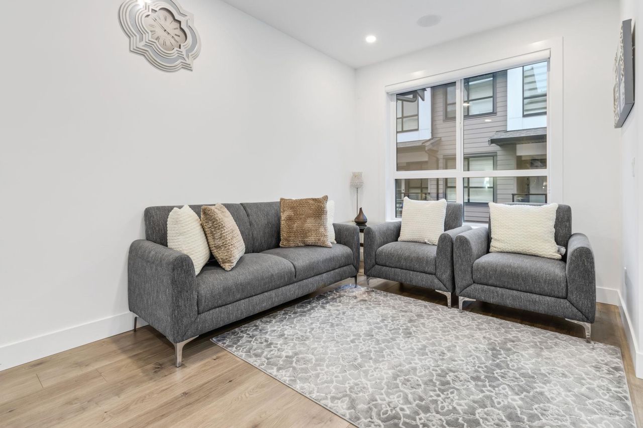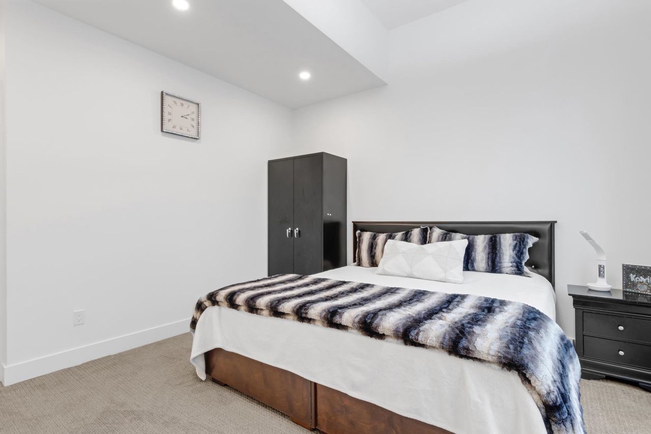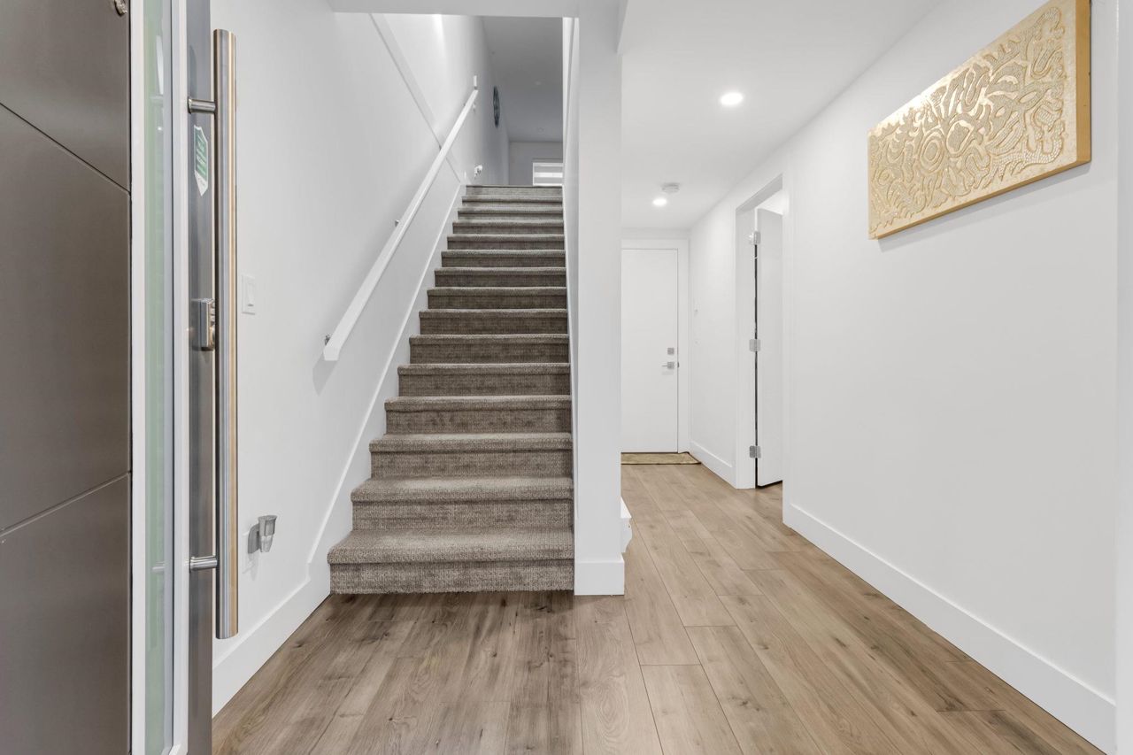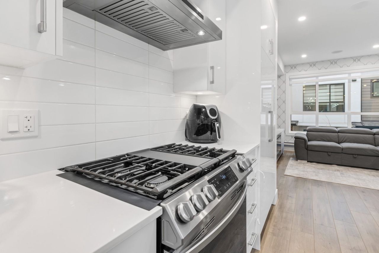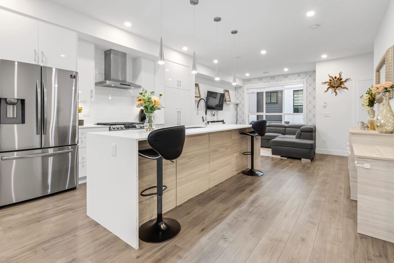 Welcome Home to beautiful Spacious 4 Bed + 4 Bath Unit !! Ground level has spacious Bedroom with ensuite and Extra wide side by side garage. Bright and Spacious Main level comes with Kitchen, Dinning, powder w/r and 2 living areas with modern entertainment unit,upgraded shelves and cozy upgraded fireplace. Built in speakers throughout.open concept kitchen with quality appliances, pull out drawers in Pantry with extra upgraded pantry too,Gas Stove,built in hutch and work station. Covered balcony with gas hookup for BBQ. Upper level has 3 spacious bedrooms with oversized windows, Side by side laundry with custom shelving. Huge Master bedroom comes with 11 ft vaulted ceiling, ensuite washroom and 3 separate closets. Close proximity to schools, recreation and transit.