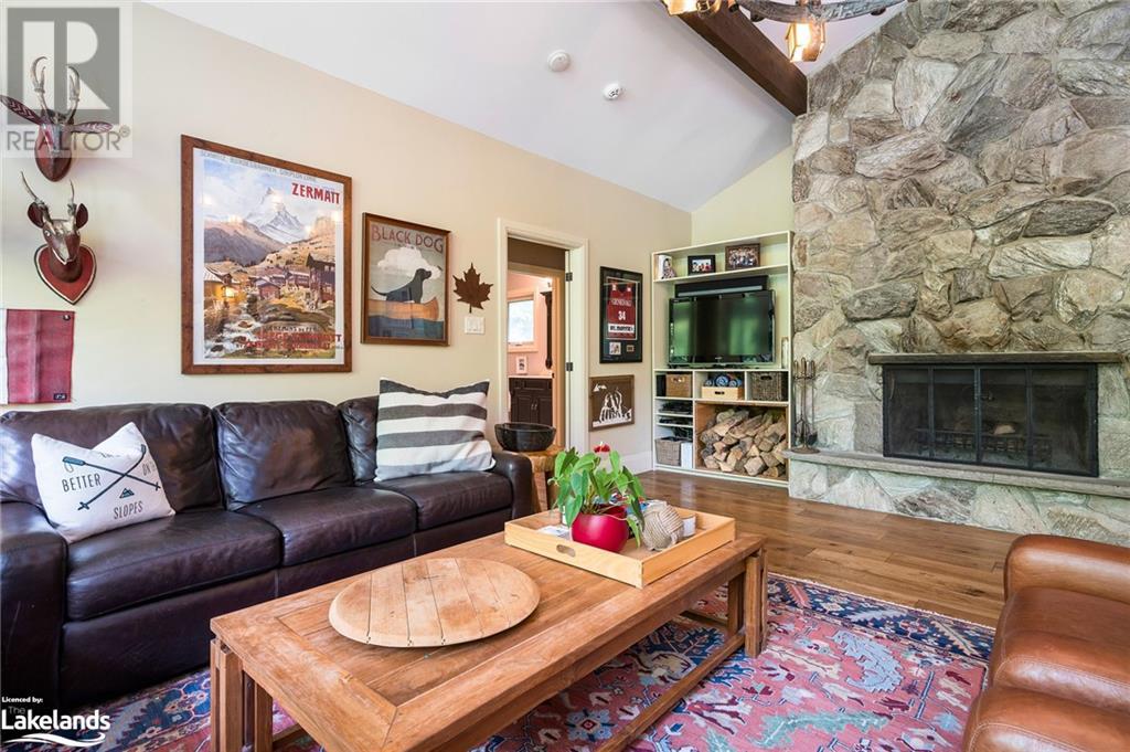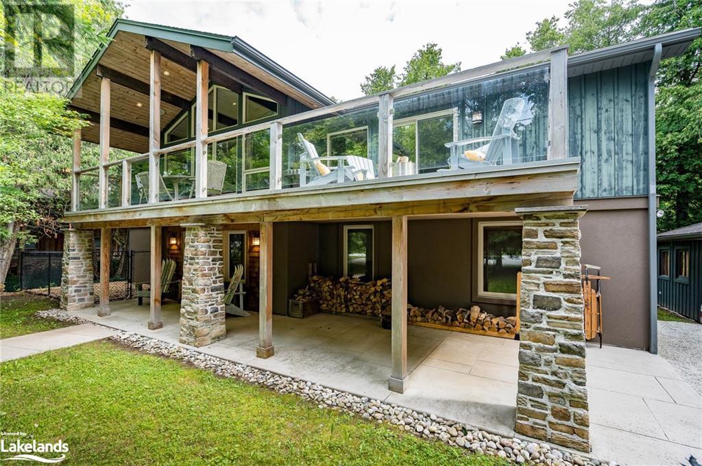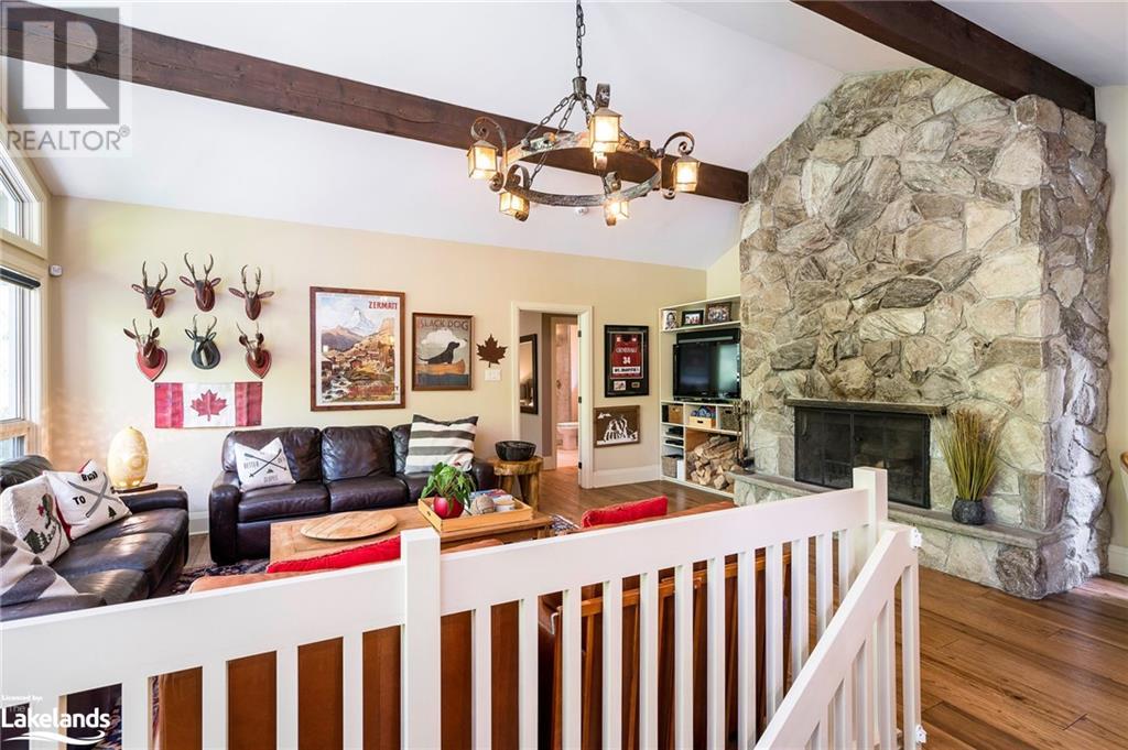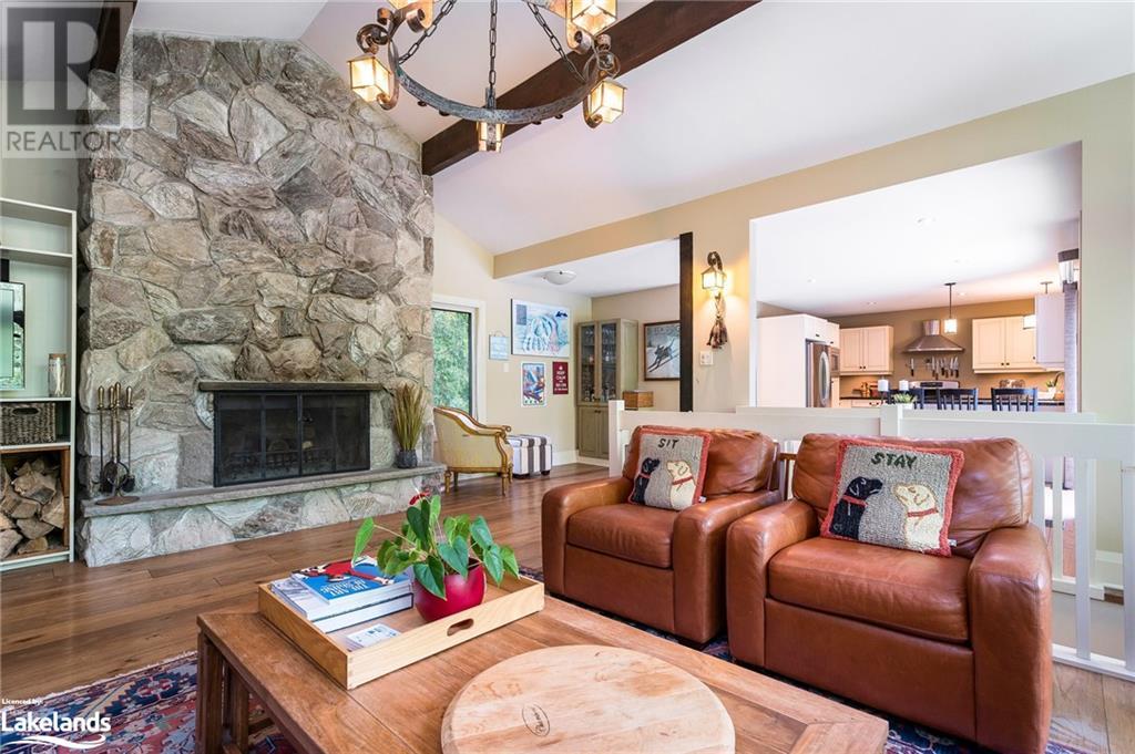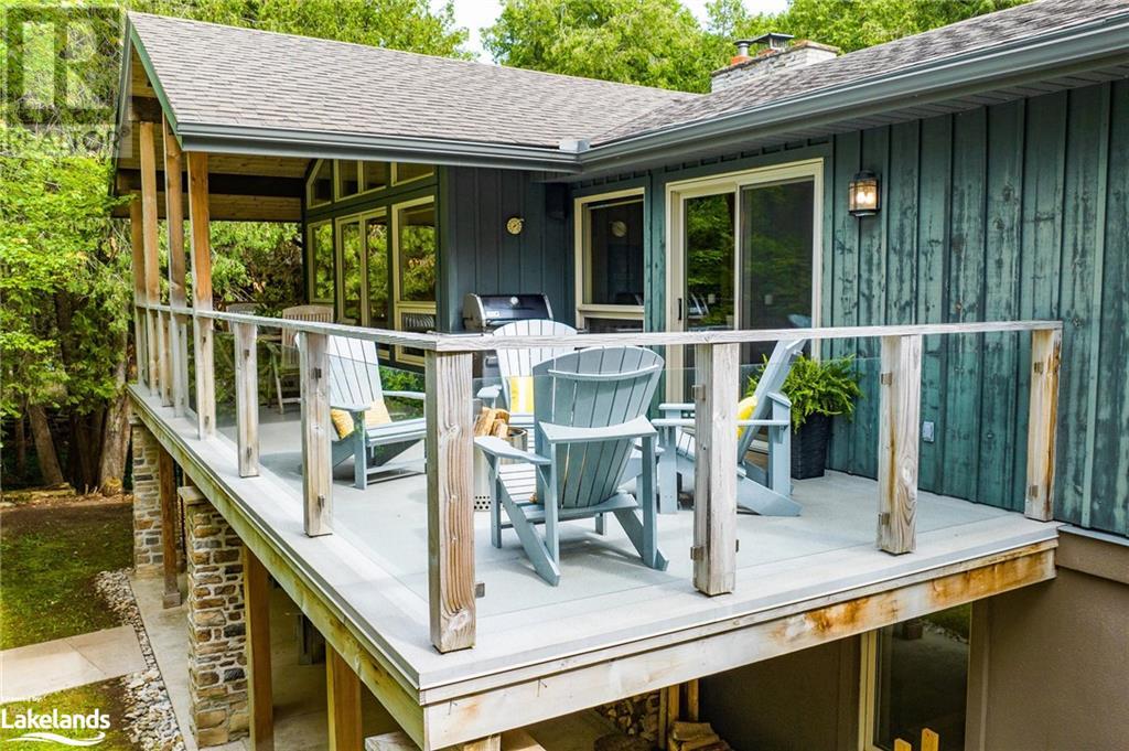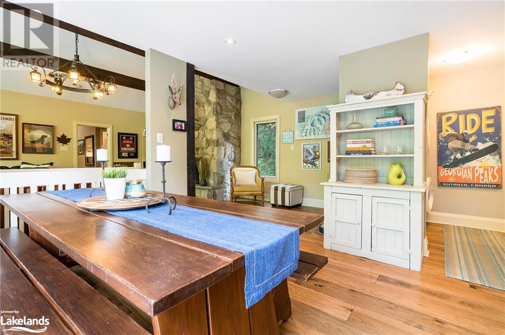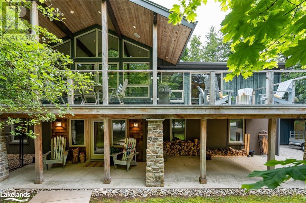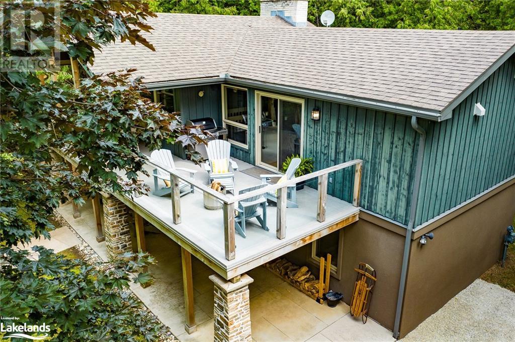Shore Acres-Enjoy this exclusive 5 bedroom/3 bath chalet year round with access to the private beach and conveniently located minutes to Georgian Peaks, Georgian Bay Club and downtown Thornbury plus direct access to the Georgian Trail just across the street. Completely renovated down to the studs and upgraded from the original chalet. This property features two floor to ceiling wood burning fireplaces constructed with locally sourced stone. The upper level offers custom gourmet kitchen, dining room, impressive living room with vaulted ceiling, primary bedroom with ensuite, plus an additional 4 piece bathroom and laundry. Wide plank hardwood flooring throughout the main level. Just off the dining room is the main deck with a covered dining area and open lounge space surrounded by glass railings. The ground level features a family room with wood burning fireplace, mudroom, 4 bedrooms, 6 person sauna and a 4 piece bathroom. In addition, the backyard offers additional space for enjoying the outdoors including the fire pit and a fully fenced cedar chip lined dog run. Not to forget the fully insulated ski tuning shed. (id:22211)