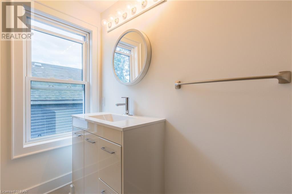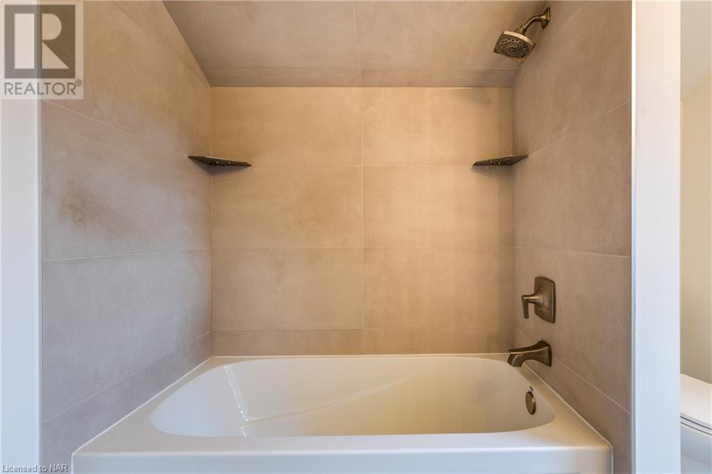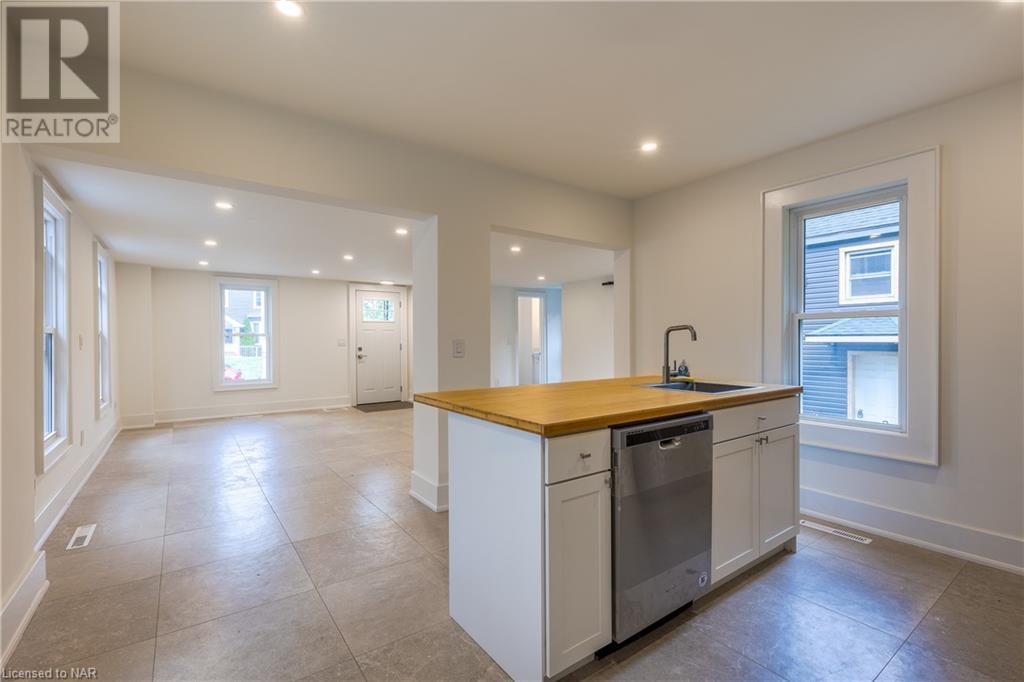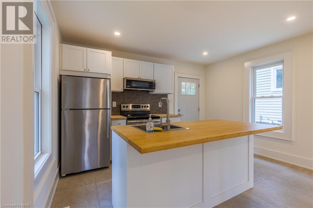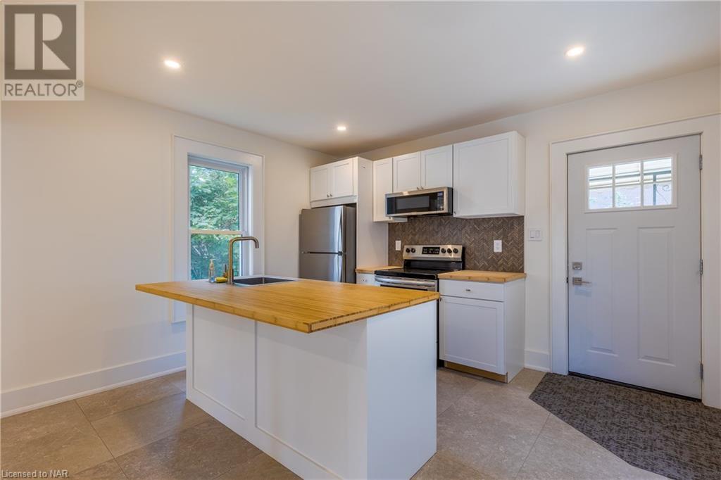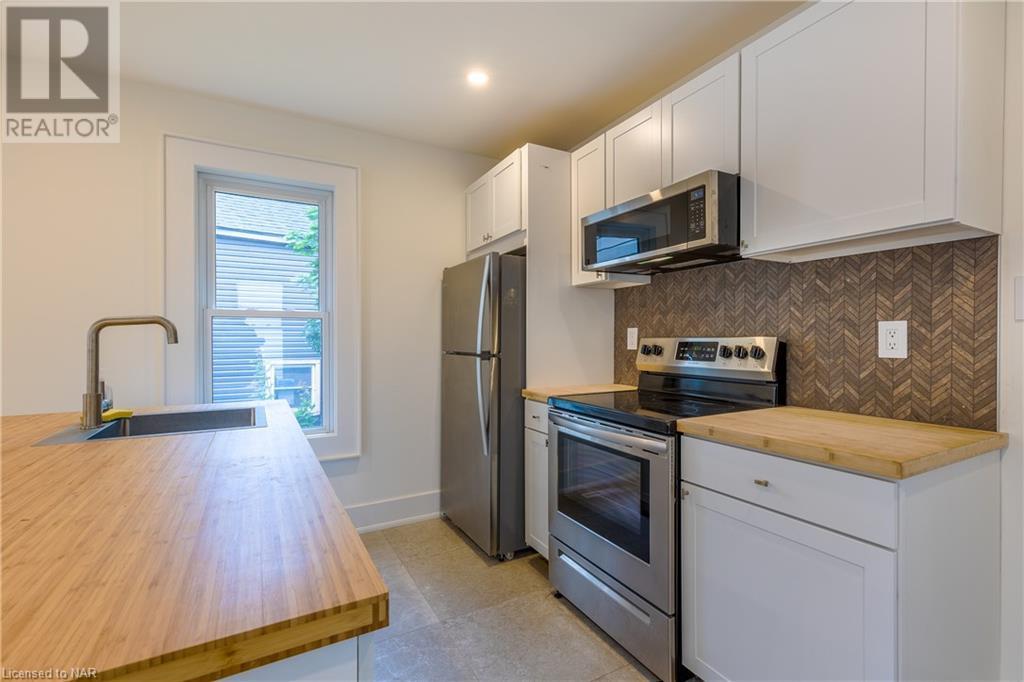 Move in ready 2 Bedroom, 1.5 bath home with beautiful finishes throughout. This home features modern ceramic tile and engineered hardwood flooring throughout, pot lights, a fully updated kitchen with white cabinetry, a large island, stainless steel appliances and beautiful backsplash. A door off the kitchen leads to a large partially fenced backyard. An updated 2pc bath on the main level, and an open concept living and dining area completes the main level. The 2nd level features 2 bedrooms, a fully updated 3pc bath, and convenient upper level laundry. Other updates include: Furnace (2021), vinyl windows throughout, freshly painted inside and out, updated exterior doors, updated wiring and plumbing. Easy access to 406 highway and walking distance to Historical downtown Thorold. (id:22211)