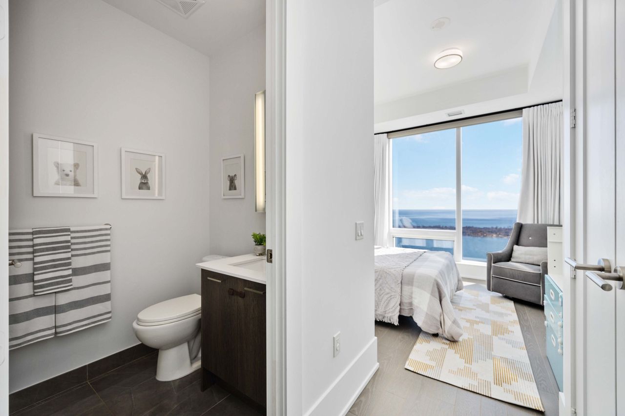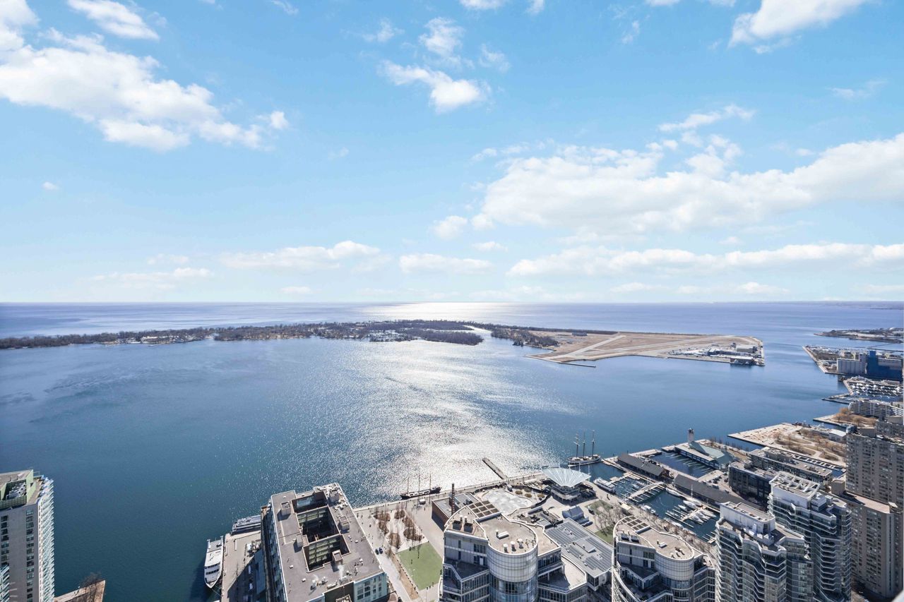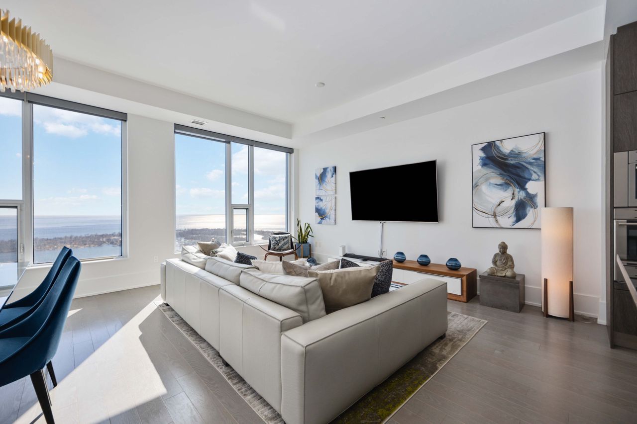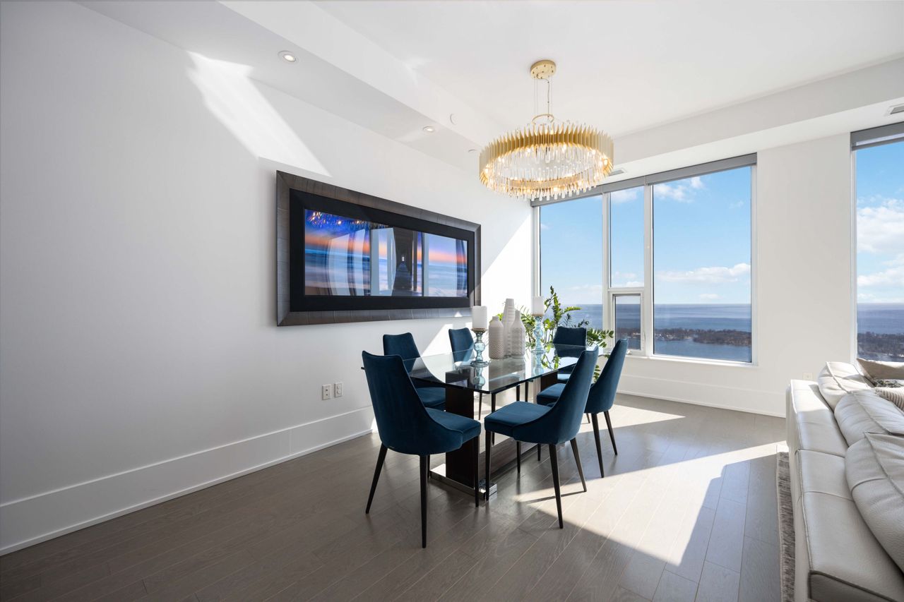 Indulge in the pinnacle of sophisticated urban living with this exquisite 1687 sqft unit boasting 270-degree panoramic views of Lake Ontario. This residence offers unparalleled luxury, state-of-the-art amenities, and a prime location that exemplifies the essence of cosmopolitan living. This property boasts lofty 10 ft ceilings, floor-to-ceiling windows, open-concept layout, kitchen w/ modern built in appliances, marble countertops & backsplash. Retreat to the primary bedroom w/ 2 closets, including an oversized walk-in closet & w/o to balcony. The freestanding tub & heated floor awaits in your primary ensuite. Spacious second bedroom contains a modern ensuite. Large den features exquisite built ins & can serve as a third bedroom or home office. Enjoy the two side by side parking spots along with a private, large storage room. This is a rare chance to immerse yourself in the epitome of urban sophistication. Don't miss out on the chance to make this extraordinary property your new home.Cutting-edge amenities: keyless access, 24 hr security, visitor parking, steps to waterfront, full size gym, The Shore Club, sauna, spa, theater, spin class, yoga room, outdoor pool w/ cabanas, 2 executive party rooms, guest suites & more!