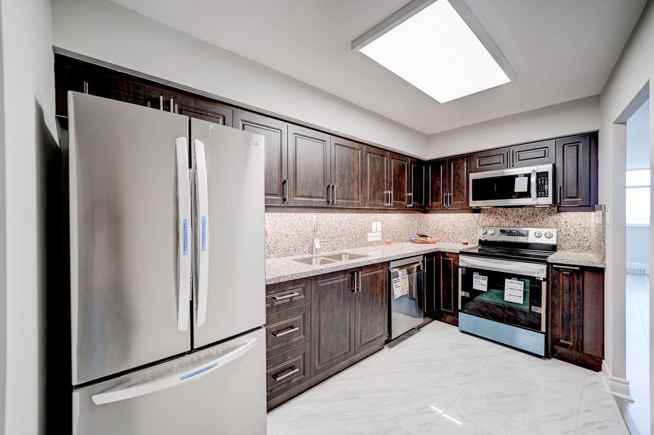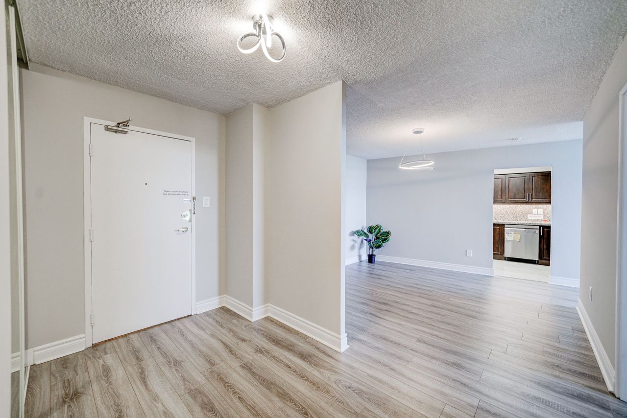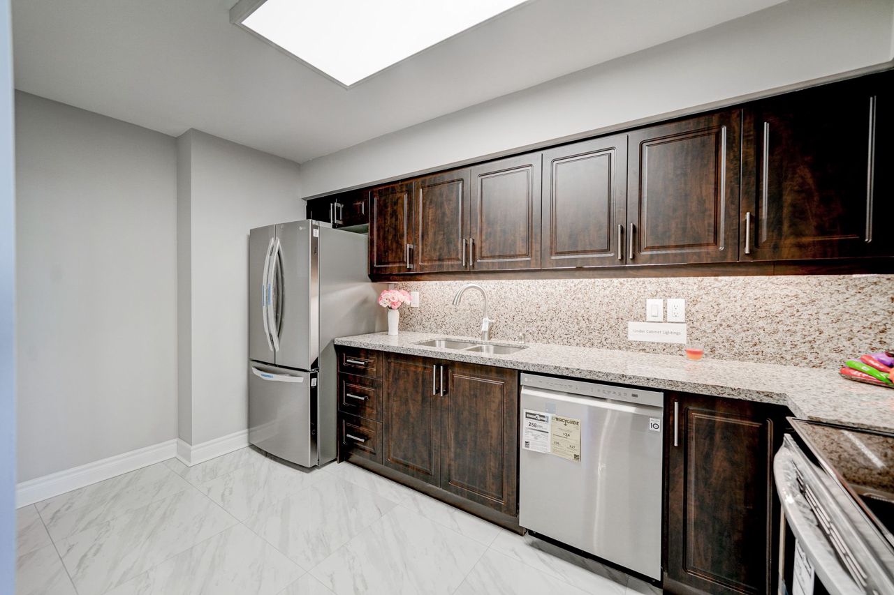 New Kitchen w/stone counter & backsplash, under cabinet lighting, lazy Susan, sauces cabinet, double sinks. New floorings throughout, fresh paint, Updated bathroom, 2 W/I closets + large ensuite locker. Unobstructed East view w/large balcony. >>>Perfect location. Modernize building w/update facilities, wave to open entrances. Outdoor pool, Tennis court, party room, Sauna... Minutes to Hwy401/404, Step to 24 hours TTC bus, Schools, Bridle Wood Mall for all your needs.New Stainless Steel Appliances: Stove, Fridge, Microwave with Range Hood, Dishwasher, New Light Fixtures.