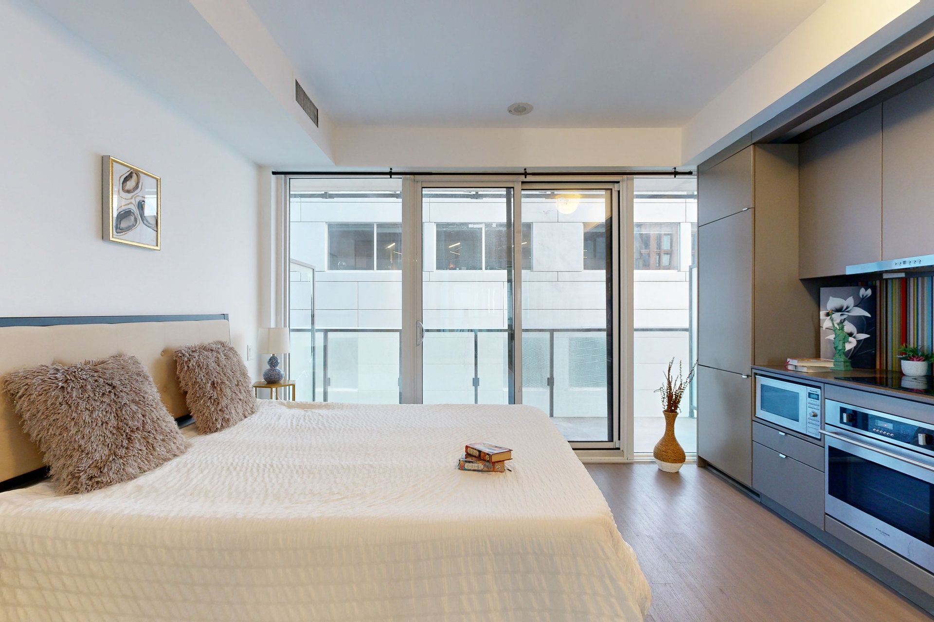 A Luxurious Condo in the heart of Toronto's Entertainment District. Modern Freshly Painted Studio Condo with 9- foot smooth ceilings and Floor-to-Ceiling Windows, Granite countertops and Hardwood Floors Throughout. King West Neighbourhood with 100 Walk Score, steps to Restaurants, Theatres, Financial District, Bisha Hotel, CN Tower, Rogers Centre, Public Transit, shopping , Supermarkets & Starbucks. 24 hr Concierge, fully equipped Gym, Party Room, Yoga Area, Theatre w/ Servery, Lounge, Kitchen, Dining Room, Billiards, Guest Suite, and easy access to all essential facilities. The open & airy Atmosphere perfectly suited for students or yonge professionals seeking a high-end life style. Don't miss this opportunity to live in one of the Toronto's most vibrant neighbourhoods.