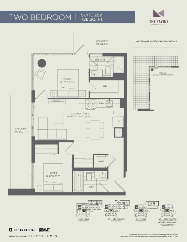 Welcome to The Ravine Condos situated steps away from the picturesque trails, diverse wildlife, and serene surroundings of Brookbanks Park and Deerlick Creek Ravine. This 2 bedroom unit offers 2 bath and 2 Balconies...One from the master bedroom and the other from the living room with breath taking view of the city. Minutes to DVP, 404, 401, Downtown Toronto & all your shopping. Please note pictures are Builders Renderings, This is an assignment sale.Upgraded kitchen cupboards, full size appliances, upgraded backsplash, wide plank laminate flooring, floor to ceiling windows,