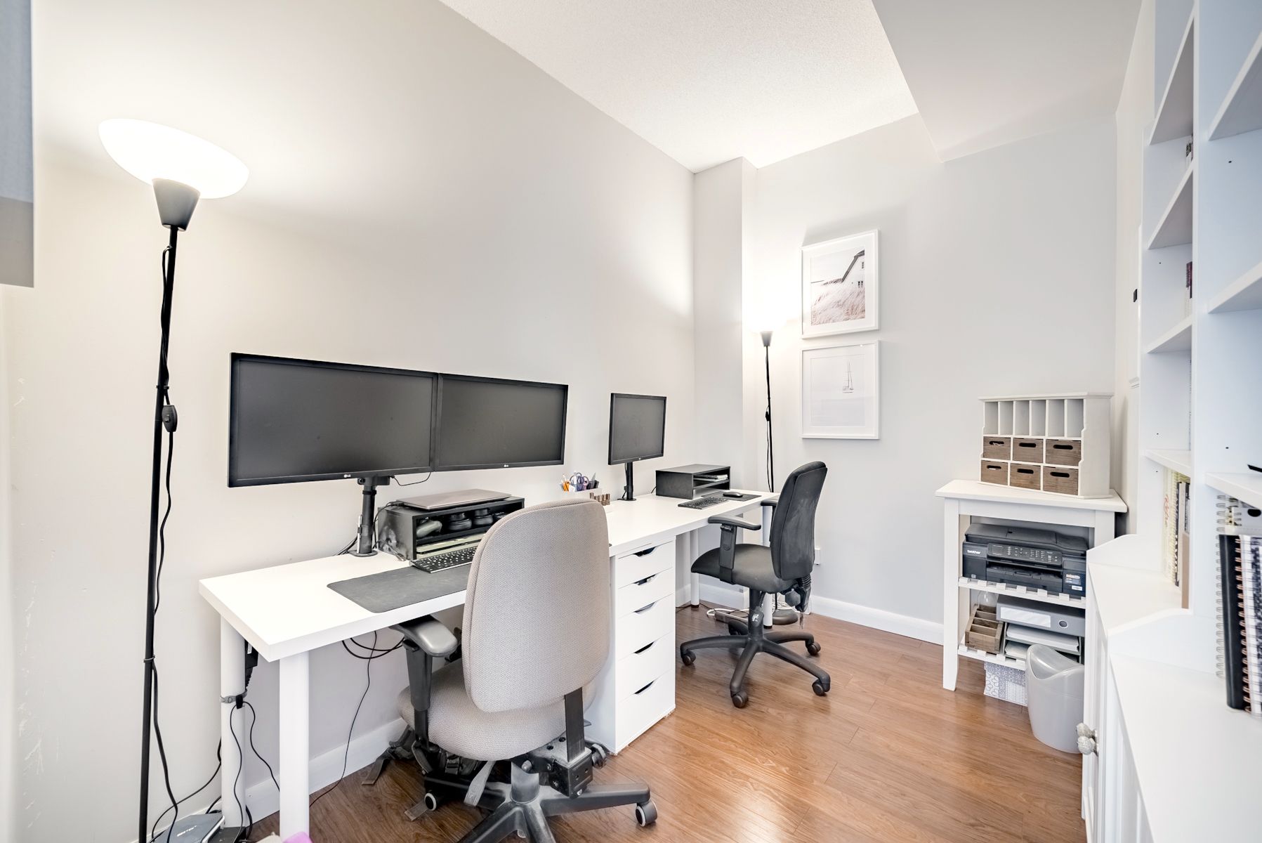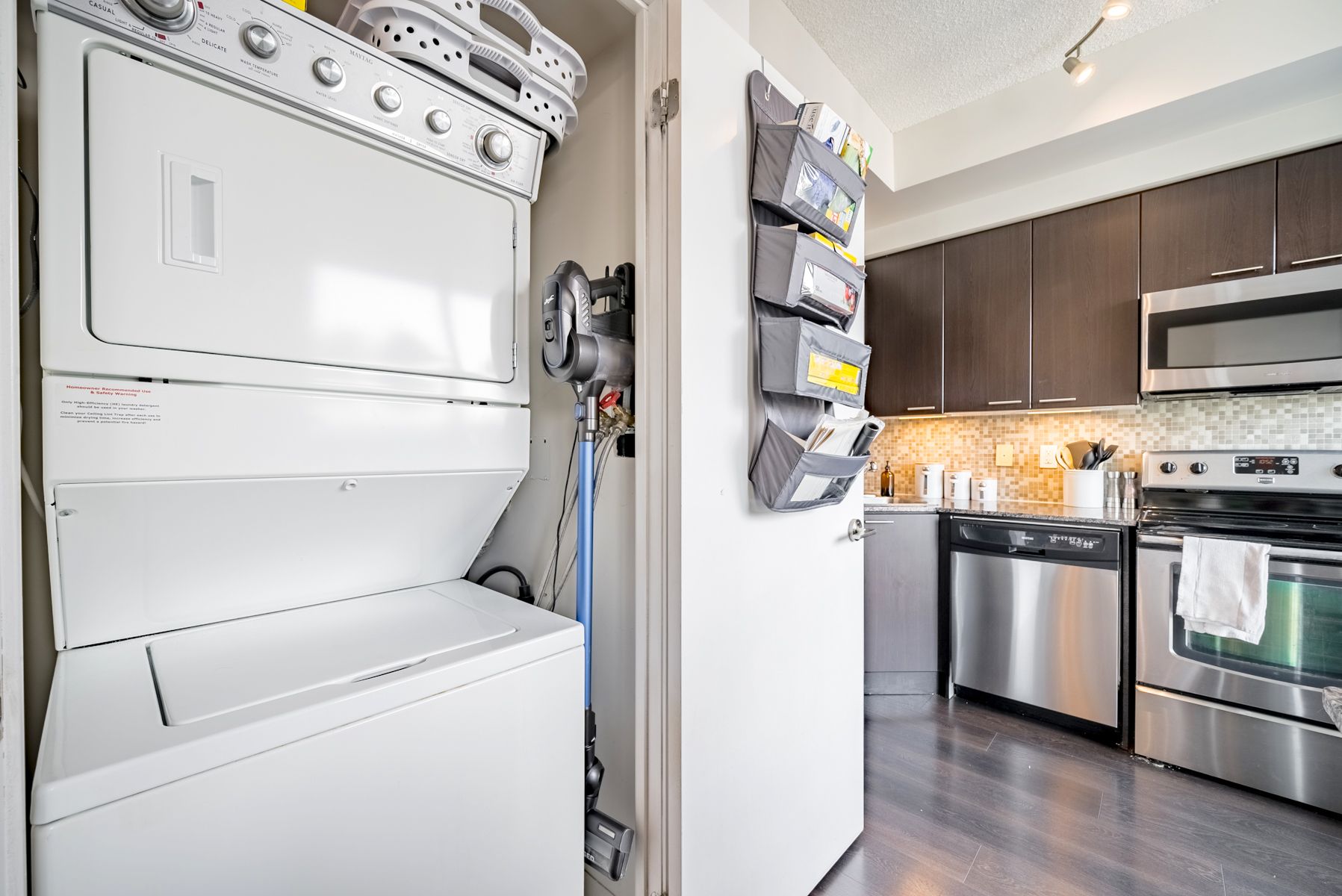 Bright and airy unit with a fantastic floorplan! This layout is a great choice for couples, or anyone in a work-from-home setup. 9 foot ceilings, floor to ceiling windows and intelligent design choices add to the spacious feeling not common in urban condos. The spacious den/study accommodates a double desk and can easily be converted into a bedroom. Massive balcony can fit a dining set and still have space for lounging. The shared rooftop deck is truly the standout feature of the amenities in the building. It has stunning views of the city as well as a BBQ area, making it an ideal place to host friends and family. But that is not where it ends, the amenities-rich building has party rooms, games rooms, full gym, a movie theater and more. A floorplan that feels like home, with excellent amenities, an impressive outdoor space and parking included, this is an excellent opportunity for a first time buyer looking for something special or an investor looking to add to their portfolio.All Light Fixtures & Appliances. Stainless Steel Fridge, Stainless Steel Stove, Stainless Steel Built In Microwave & Stainless Steel Dishwasher. Stackable Washer & Dryer.