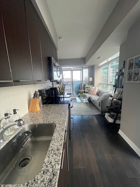 Live bright and bold in this stunning corner suite at LTD Condos in the Fort York neighbourhood. With 9-foot ceilings, floor-to-ceiling windows, and an expansive south-facing view, this space is bathed in natural light from sunrise to sunset. Step onto your private balcony and take in the shimmer of Lake Ontario or the buzz of the downtown skyline below. Inside, the open-concept floor plan is airy and versatile, designed for both relaxed evenings in and effortless entertaining. The modern kitchen connects seamlessly with the living area, creating a natural flow for everyday life. Residents at LTD Condos enjoy a full suite of amenities including a rooftop deck, a fully equipped gym, party and meeting rooms, guest suites, visitor parking, and secure bike storage. Step outside and discover one of Toronto's most walkable neighbourhoods. Wander the waterfront trails, explore the parks that line Lake Ontario, or head to the Rogers Centre where the Blue Jays are currently lighting up the season. Local favourites like Stackt Market, The Well, and the cafes of Harbourfront are all within a short stroll. Grocery runs are a breeze with Sobeys and Loblaws nearby, and TTC access is at your doorstep with quick links to the subway, Union Station, and the Gardiner Expressway. Includes both parking and a locker, which are a true luxury downtown. This is not just a place to live; it's a lifestyle defined by light, location, and limitless energy.