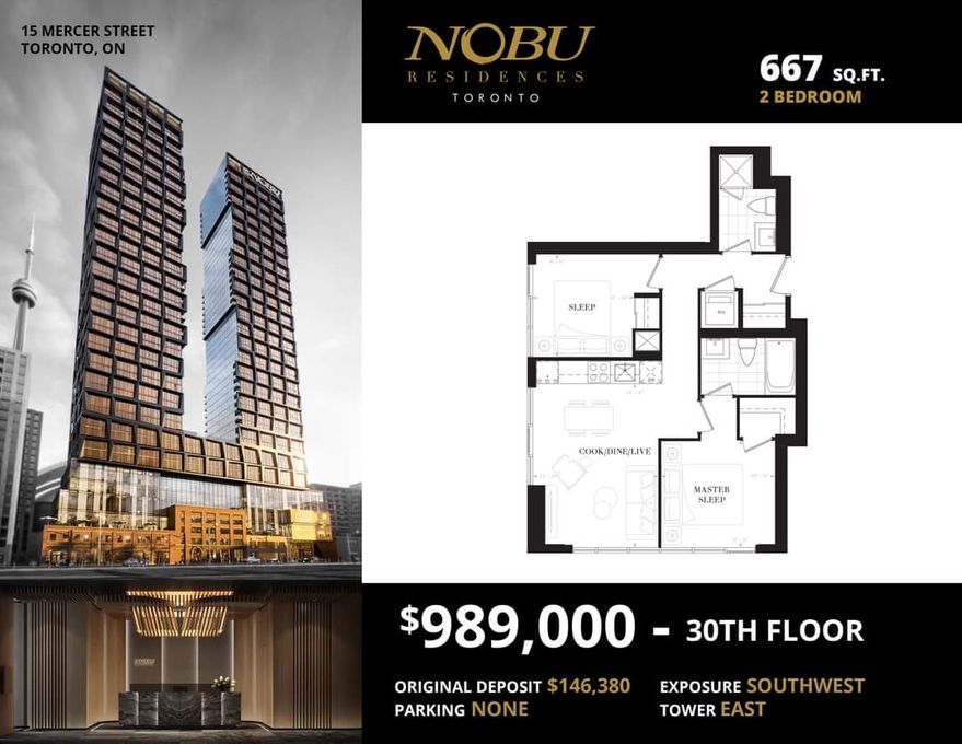 超豪华市中心公寓NOBU,两室两卫,高层西南角,湖景视野无遮挡,户型方正,自住合适并且投资潜力巨大。现在仅仅需要给到定金即可,有兴趣请微信robinliucanada 或者短信电话4168232830。