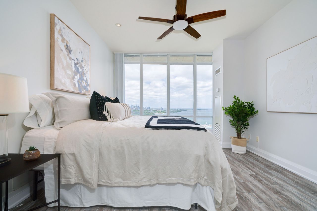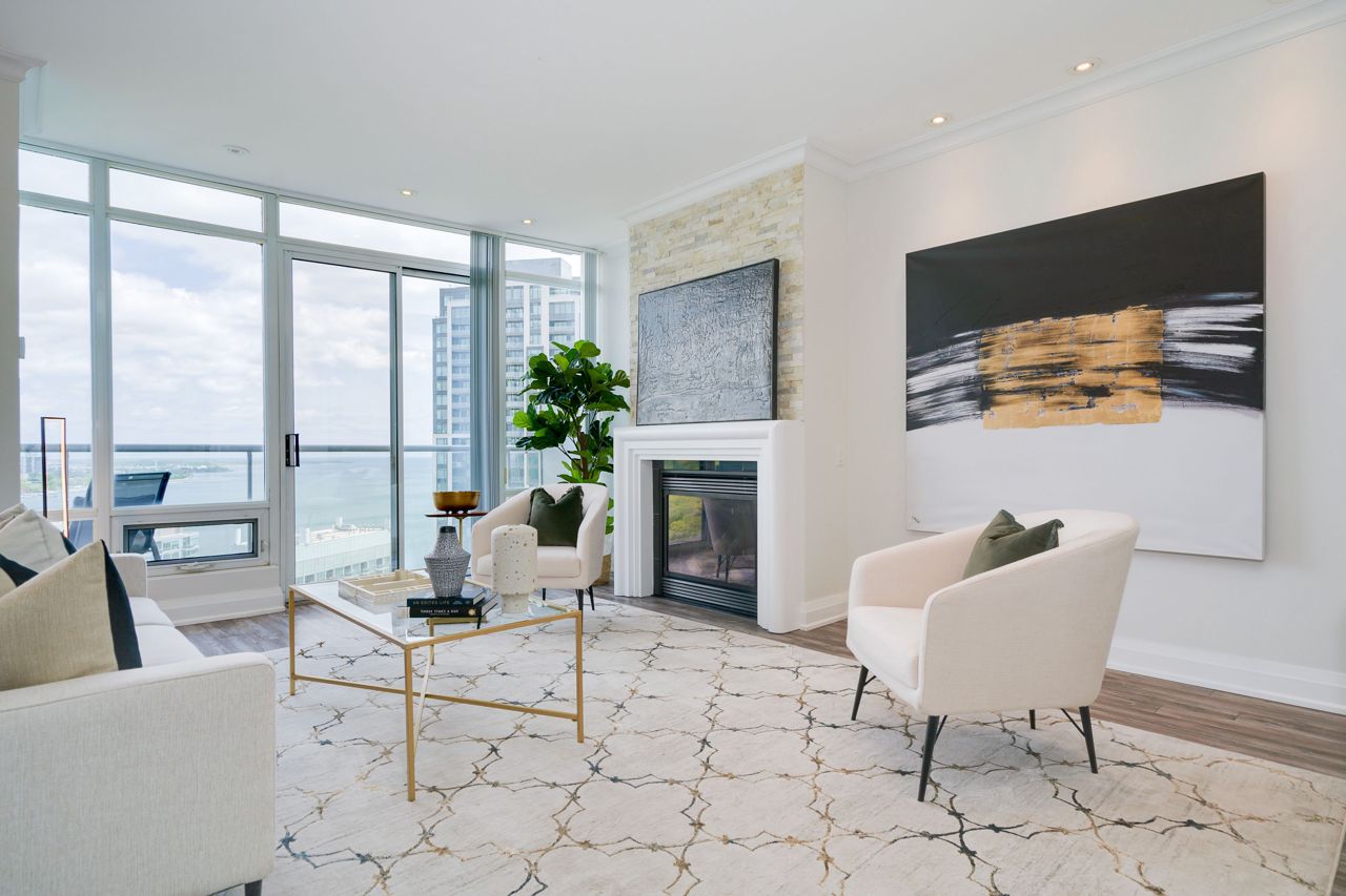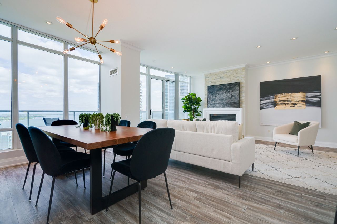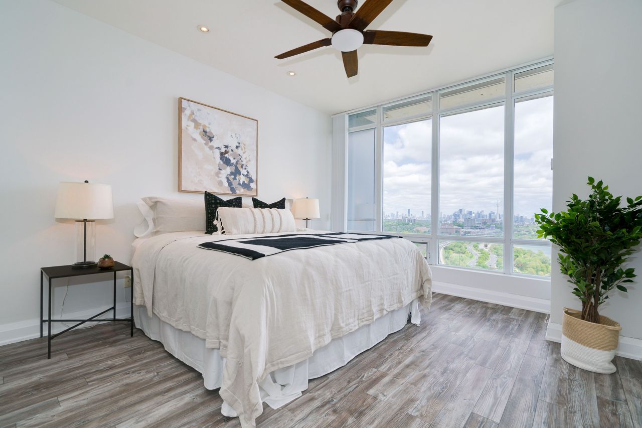 Living Large & in Charge. This spectacular 2-storey penthouse suite is one of the largest in the building, with a stunning view of the City and the Lake that will take your breath away. The open-concept main living area features a spacious gourmet kitchen with stainless steel appliances, a large dining space, and a cozy fireplace - perfect for entertaining guests or relaxing after a long day. The amazing view from the floor-to-ceiling windows provide an abundance of natural light. 9-foot smooth ceilings & pot lights throughout, this suite is designed for luxury living. The Oversized Bedrooms & Luxurious Primary Bed are spacious enough to accommodate king-sized beds & offer ample closet and storage space. Located just minutes from High Park & The Waterfront, Cheese Boutique, both airports, this Penthouse Suite offers the perfect balance of luxury & convenience.Fridge, Stove, Built in Microwave, Built in Dishwasher, Front load Washer & Dryer. Includes Heat, Hydro and Water. Incredible amenities, including a Party Room, Indoor Pool, Gym, Sauna, virtual golf, and much more.