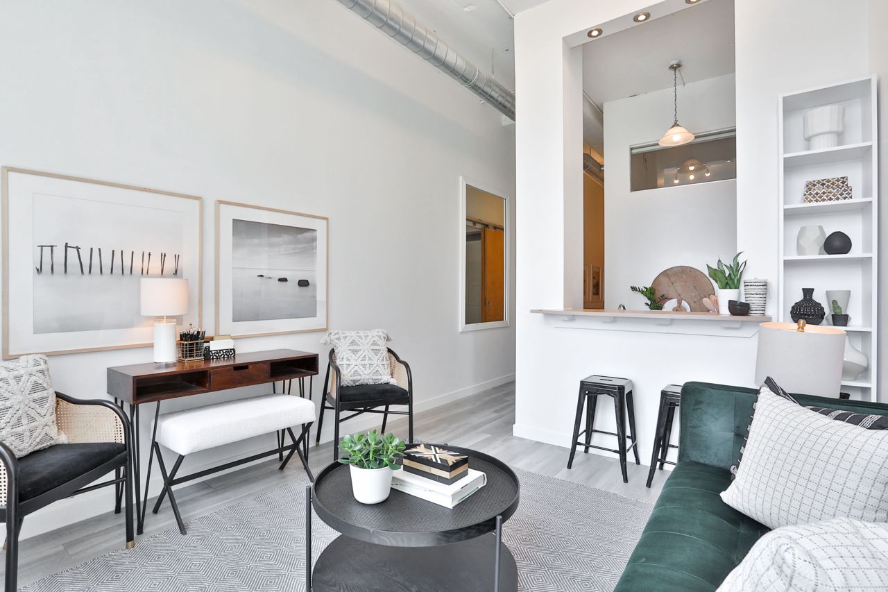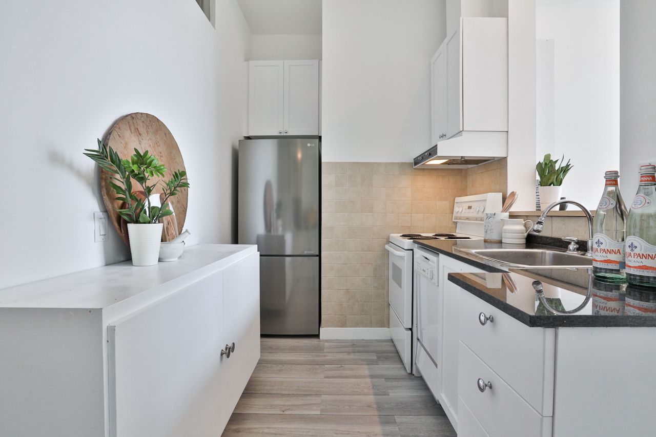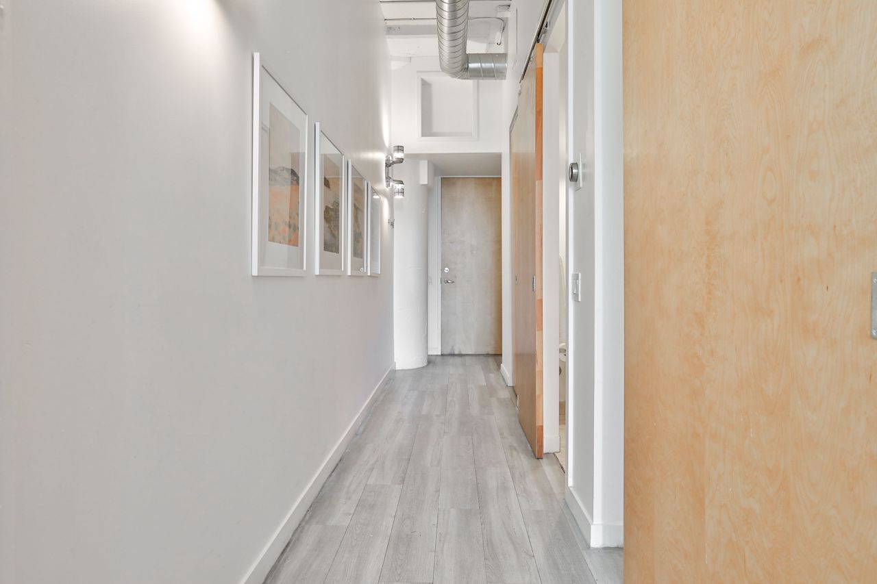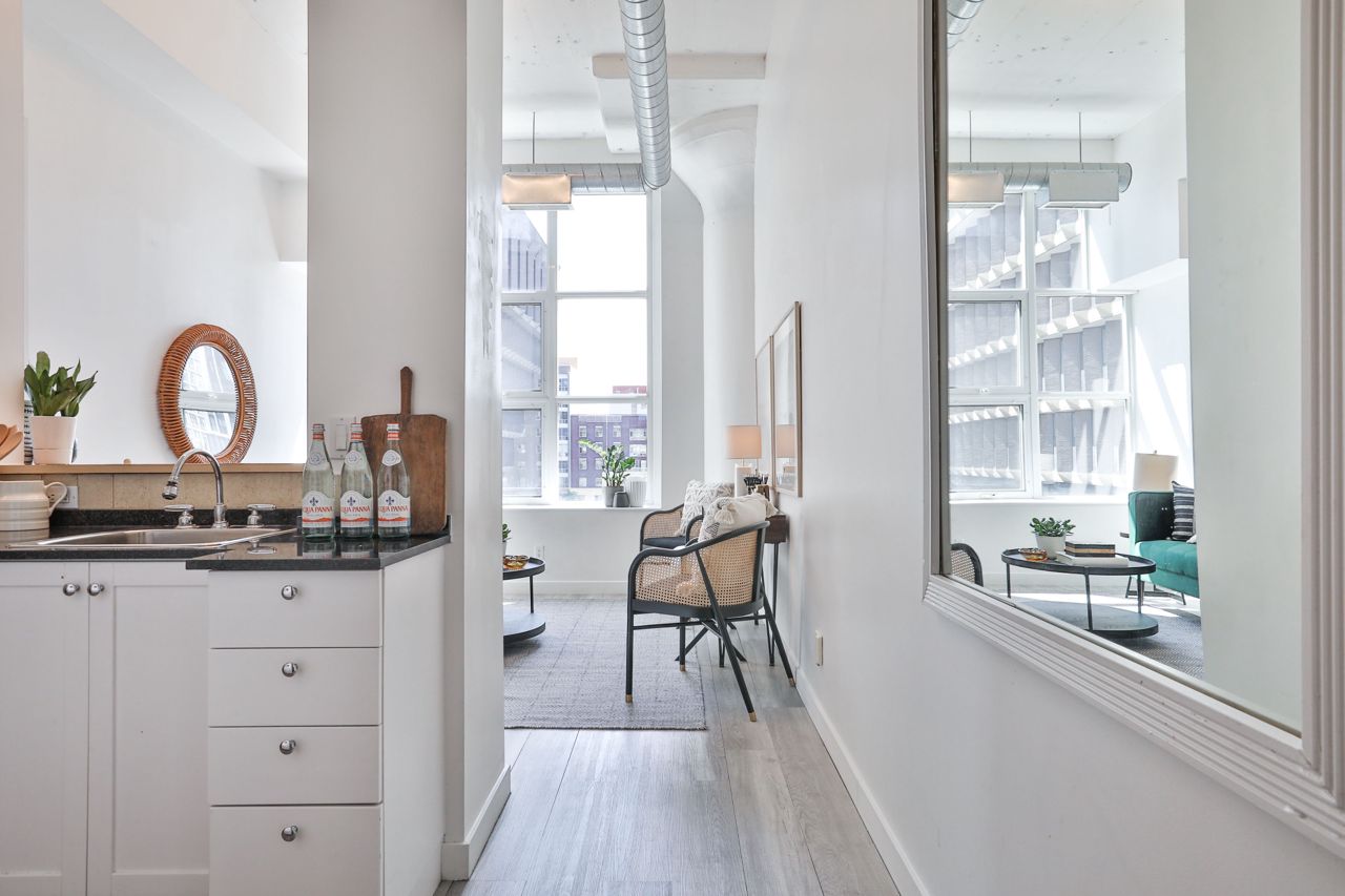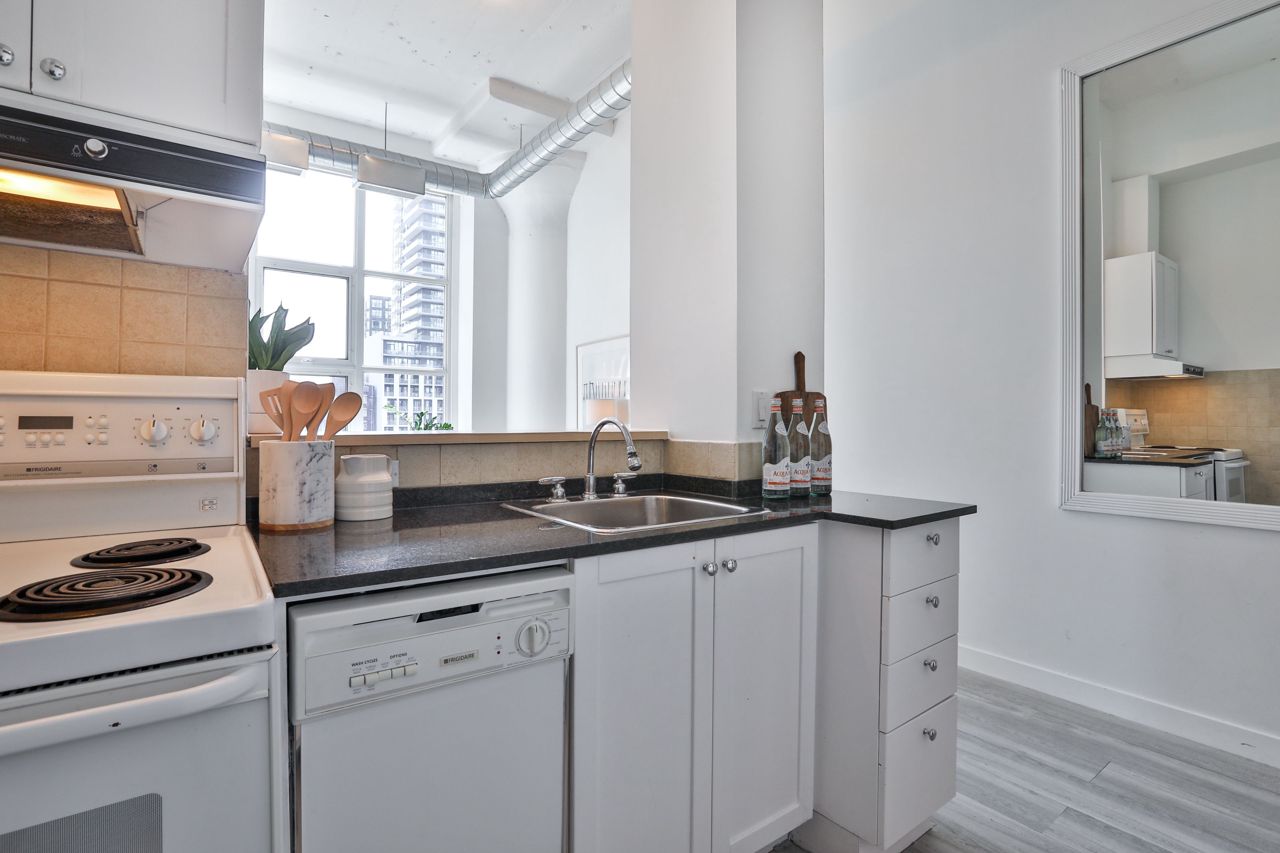 Welcome to this authentic 1 bedroom hard loft at the Merchandise Building Lofts! This landmark heritage building is superbly located in the "heart of the city", steps to shops, restaurants, TTC & Toronto Metropolitan University. Suite 444 is an exceptionally bright 1 bedroom, 1 bathroom suite featuring soaring 12ft ceilings, exposed ductwork & huge east-facing loft-style windows. The updated kitchen has a large pass- thru to the living room with a breakfast bar, stainless steel appliances & granite countertops. 8ft solid Maple sliding doors thru-out. Great bedroom with closet. 4-piece bathroom with built-in vanity & soaker tub. Separate laundry closet. Impressive building amenities include: 24hr concierge, indoor pool, rooftop deck/garden, excellent gym, indoor basketball court...and more! Owned storage locker.*Electric range & dishwasher shown in pictures have been upgraded to newer stainless steel models. Polished concrete floor underneath existing flooring (not glued down). Metro grocery store conveniently located in the building.