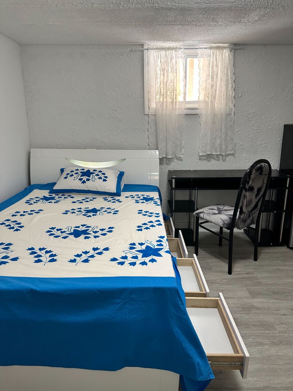 Partially Furnished, Legal Basement Apartment. Spacious Dining and Living Area. Separate Entrance, Added Safety Exit, Separate Laundry Room. Quartz Kitchen Countertop, Backsplash. All Above Grade Windows. Pot Lights allover. Central Ac. 24 Hr TTC-1 Min Walk. 5 min Walk to Shopping Plaza. Bell Internet and Laundry included.Partially Furnished. Can be made Fully Furnished. New Comers Welcome. 1 min Walk to 24 Hr Bus stop. 5 min Walk to Public School, Grocery and Place of worship. Safe Neighborhood.