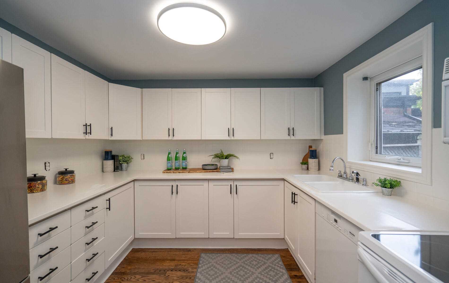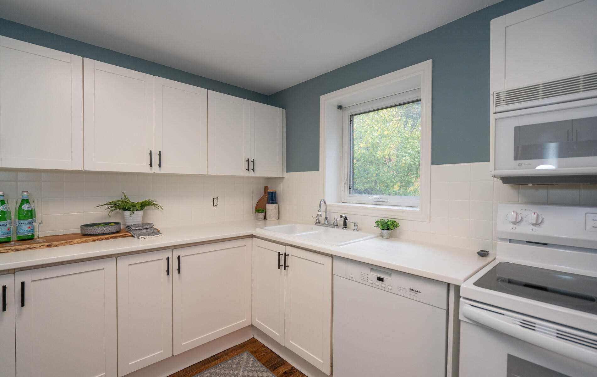 Hardwood Floor Modern Kitchen O/Looks Backyard