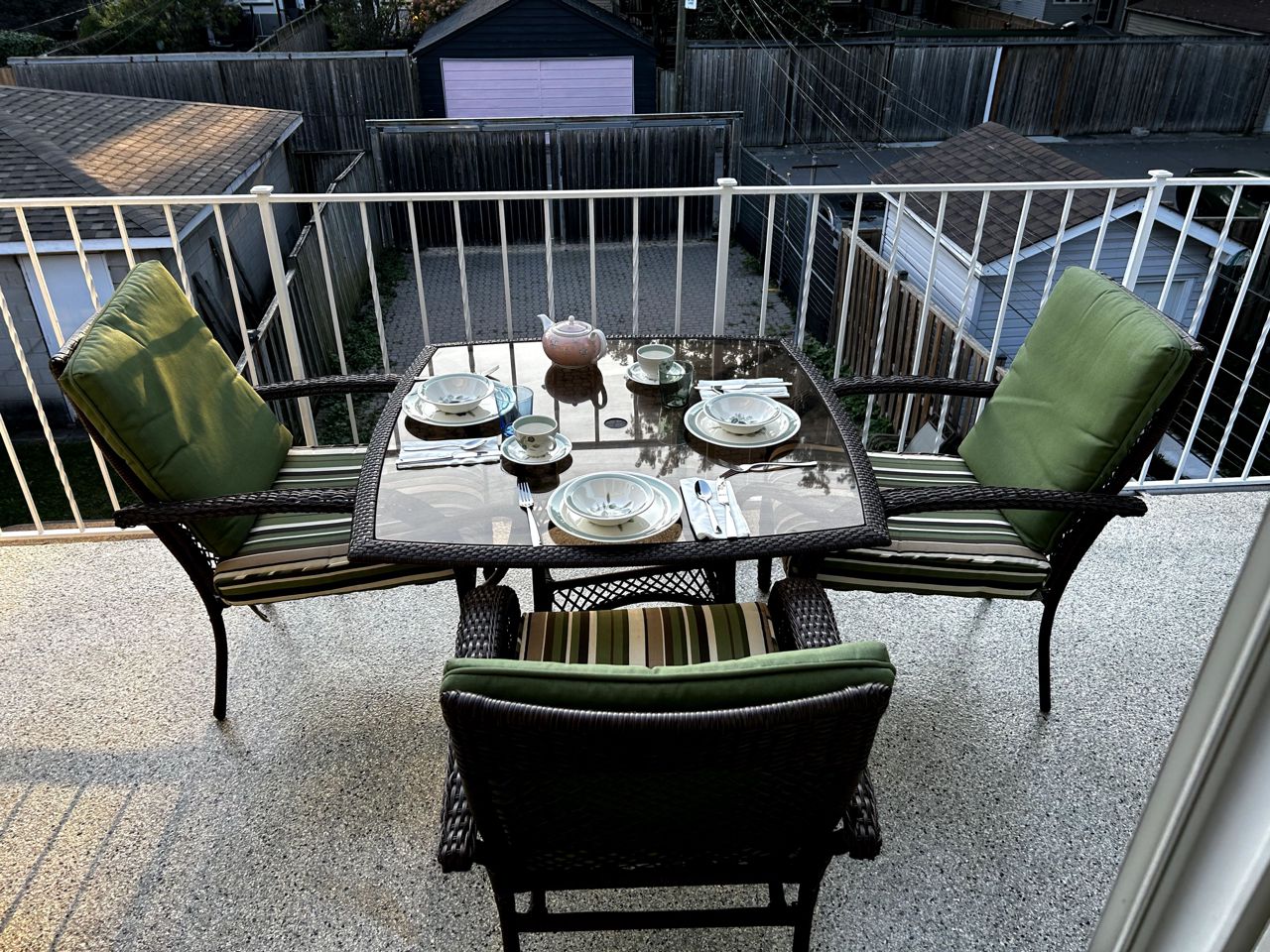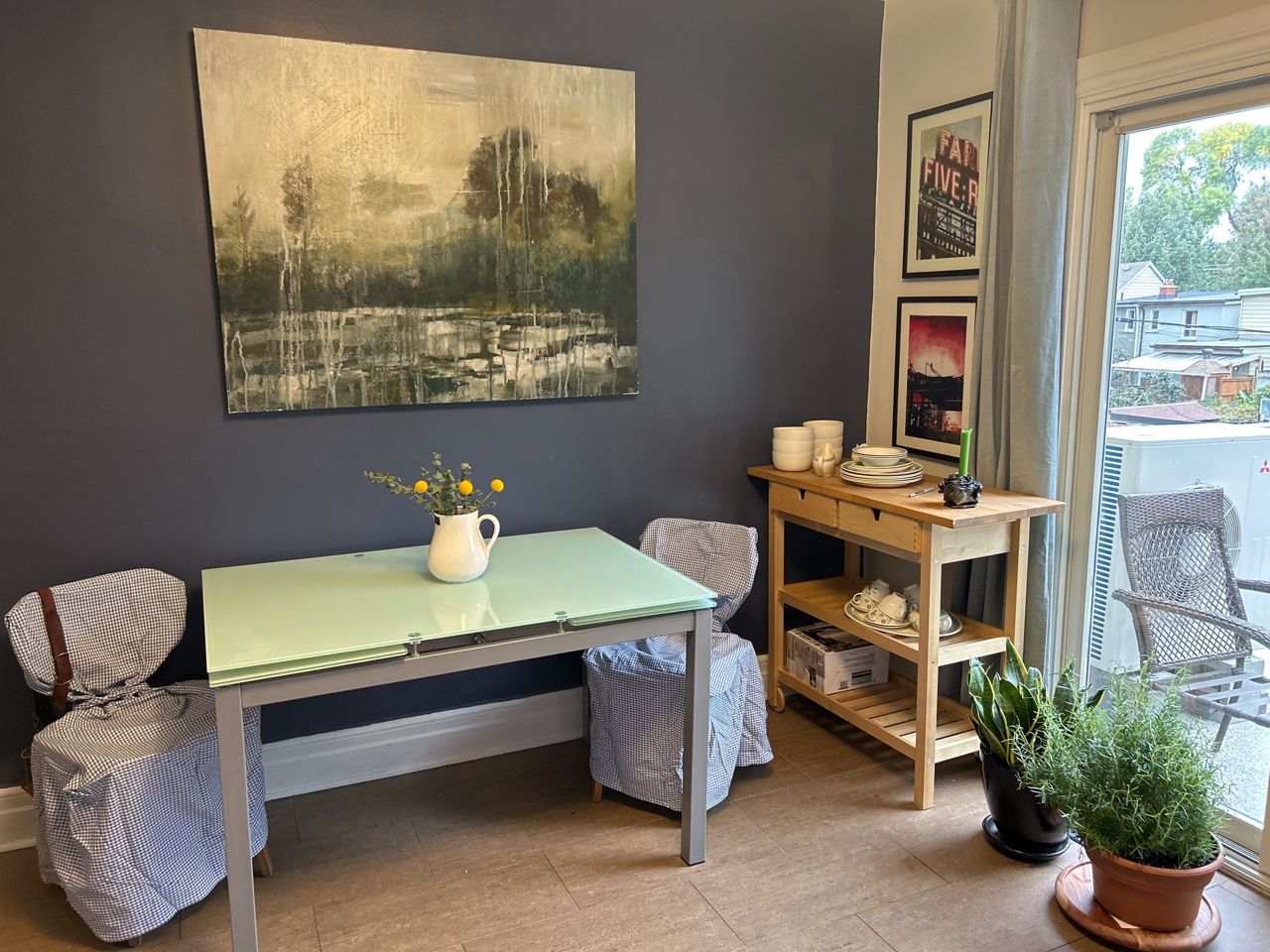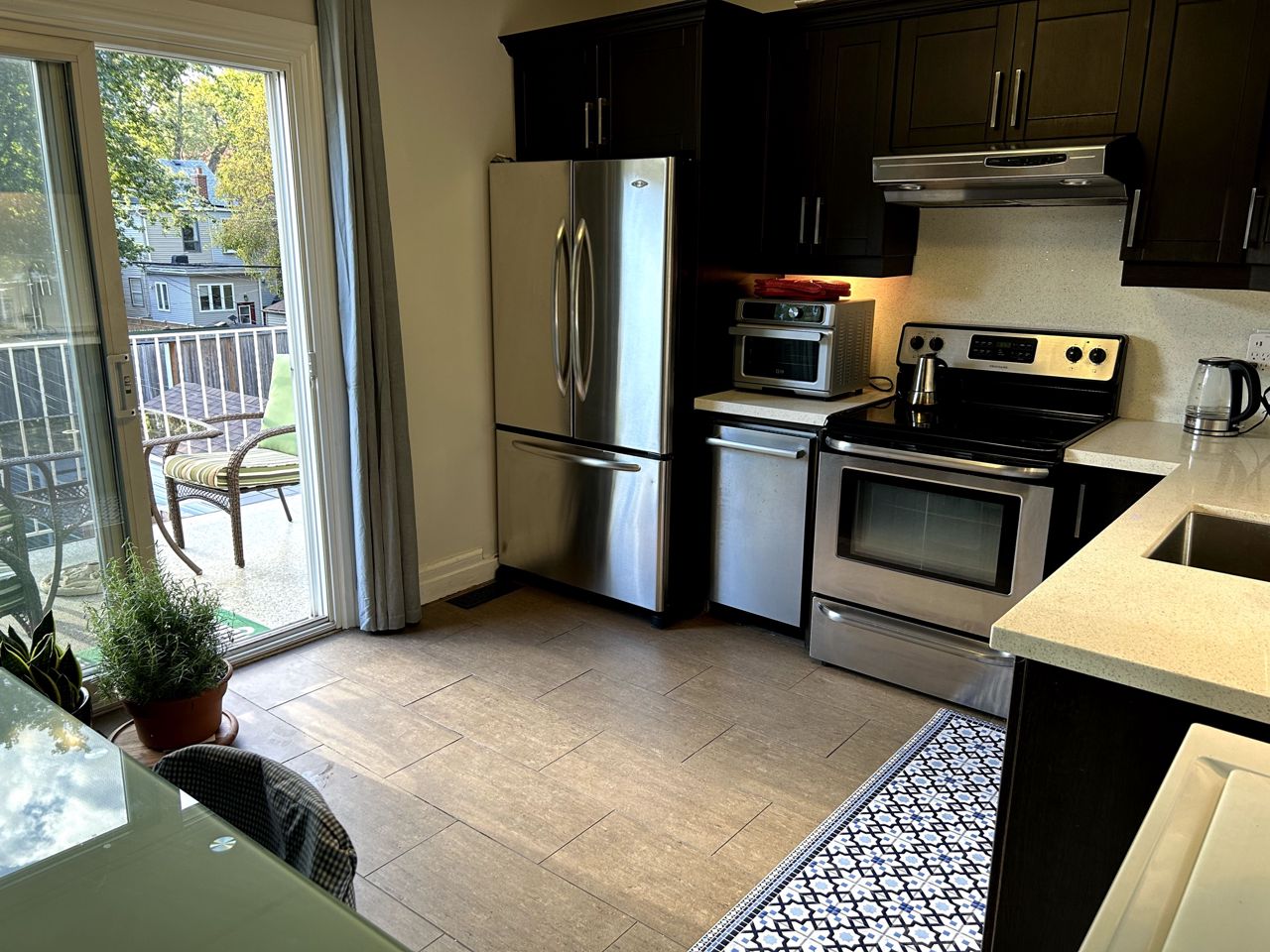 Many luxury furniture pieces, IE: Primary bdrm w/ Cal King bed & ultra delux mattress (feels like floating). Both bedrooms are very large. Primary has gas fireplace and double closets, area rug over hardwood. The 2nd bedroom (queen bed) + possible exercise room/games/work space is on 3rd fl, very bright with black out curtains. Front foyer is private and leads to 2nd floor open living room with 50" TV, pull out queen sofa for occasional guest. Fully stocked kitchen with all the pots, dishes etc you'll need and w/o to wrap around terrace with table and chairs and hibachi. The 4 piece bath is also stocked with white towels, soaps, shampoos etc. I can provide 2 car parking off the laneway. This includes all utilities and monthly cleaning and linen change. Ideal spot for film crews and family or executive rental. No long term leases. Also ideal if you are a local family amidst a renovation.3 door fridge, electric stove, bosch dshwher, air fryer, washer & dryer, coffee makers, kettle, beautiful linens for king & queen beds and sofa bed, TV, several area rugs, Many sundry items in kitc, bath, liv room and considerable art.