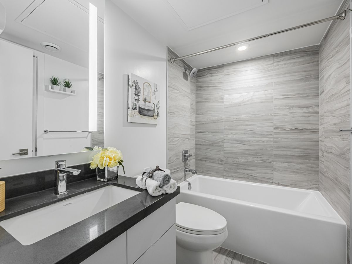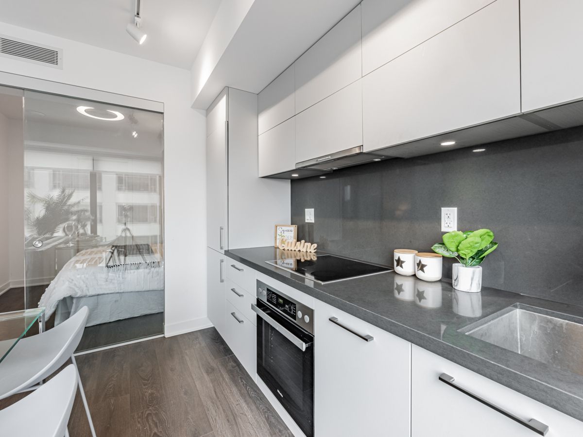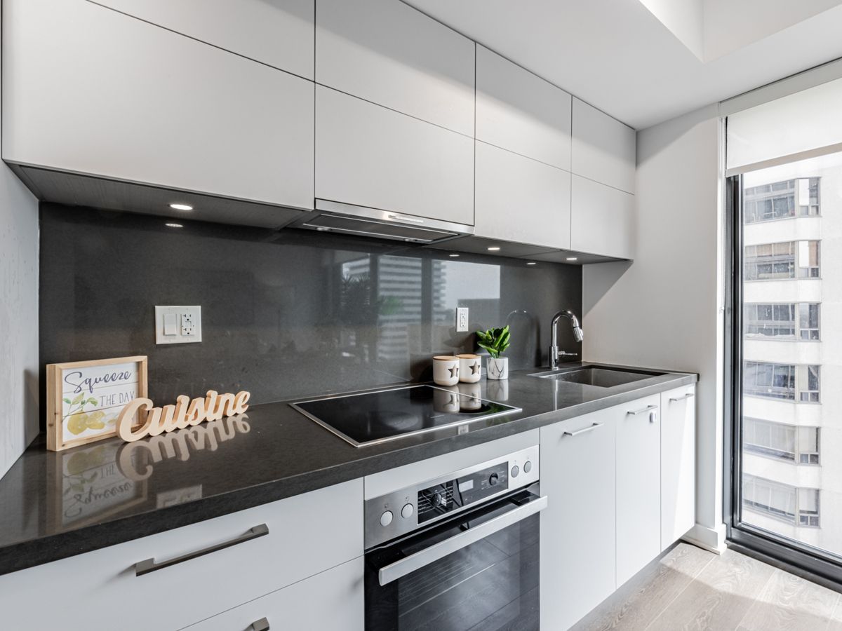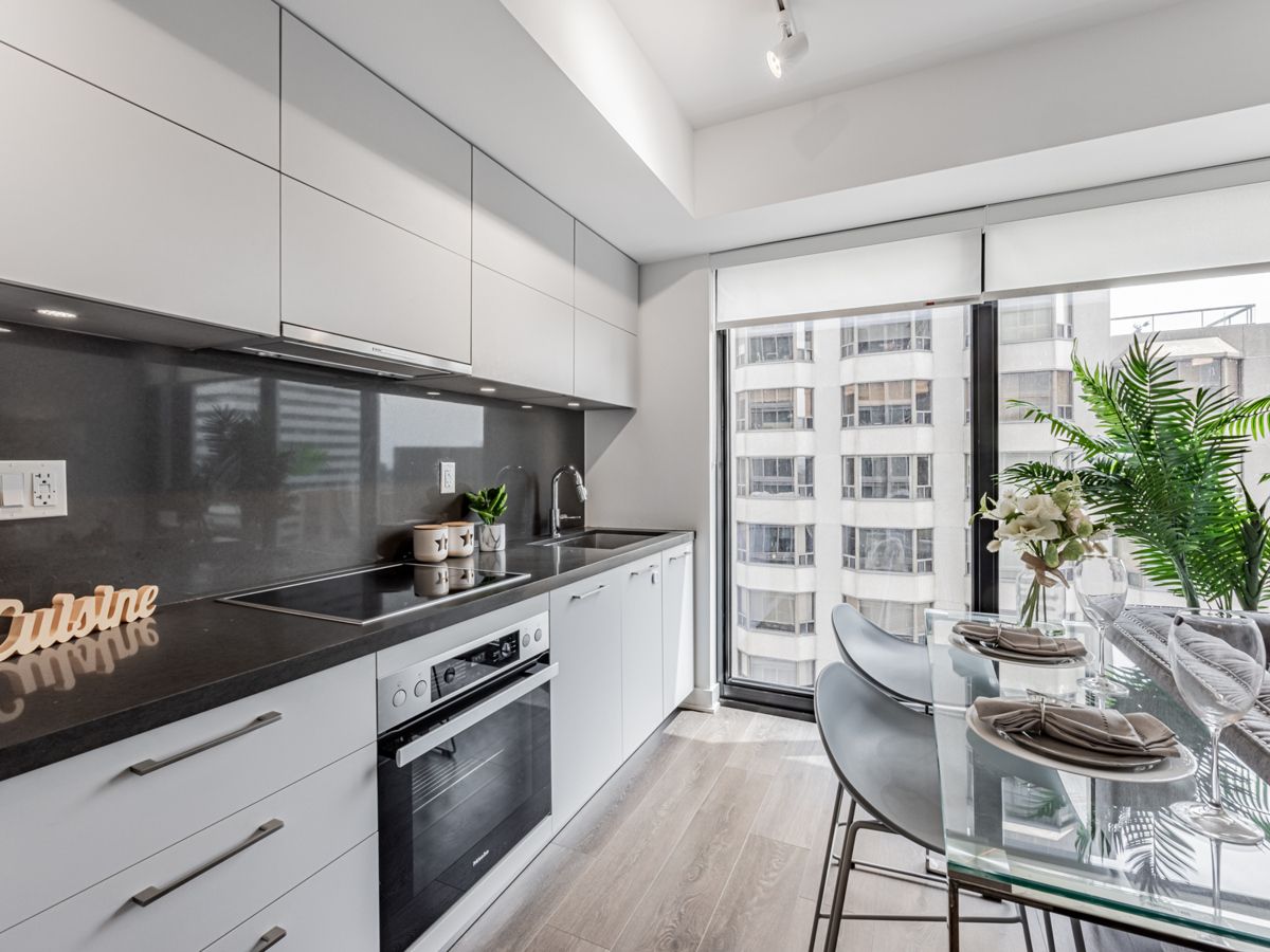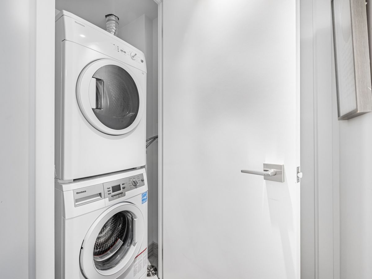 LOCATION LOCATION LOCATION! Right in the heart of Yorkville neighborhood offering residents a glamorous lifestyle hub of world class shopping, eateries and entertainment. This luxurious 1 bedroom has wall to wall and floor to ceiling windows, custom privacy and shaded pull out blinds, engineered laminate floor planks, custom design kitchen with built-in Miele integrated appliances and stone countertop. A must see!Integrated "Miele" stove, fridge, B/I dishwasher, hood fan, stacked washer/dryer, custom private pull out blinds, all ELFs.