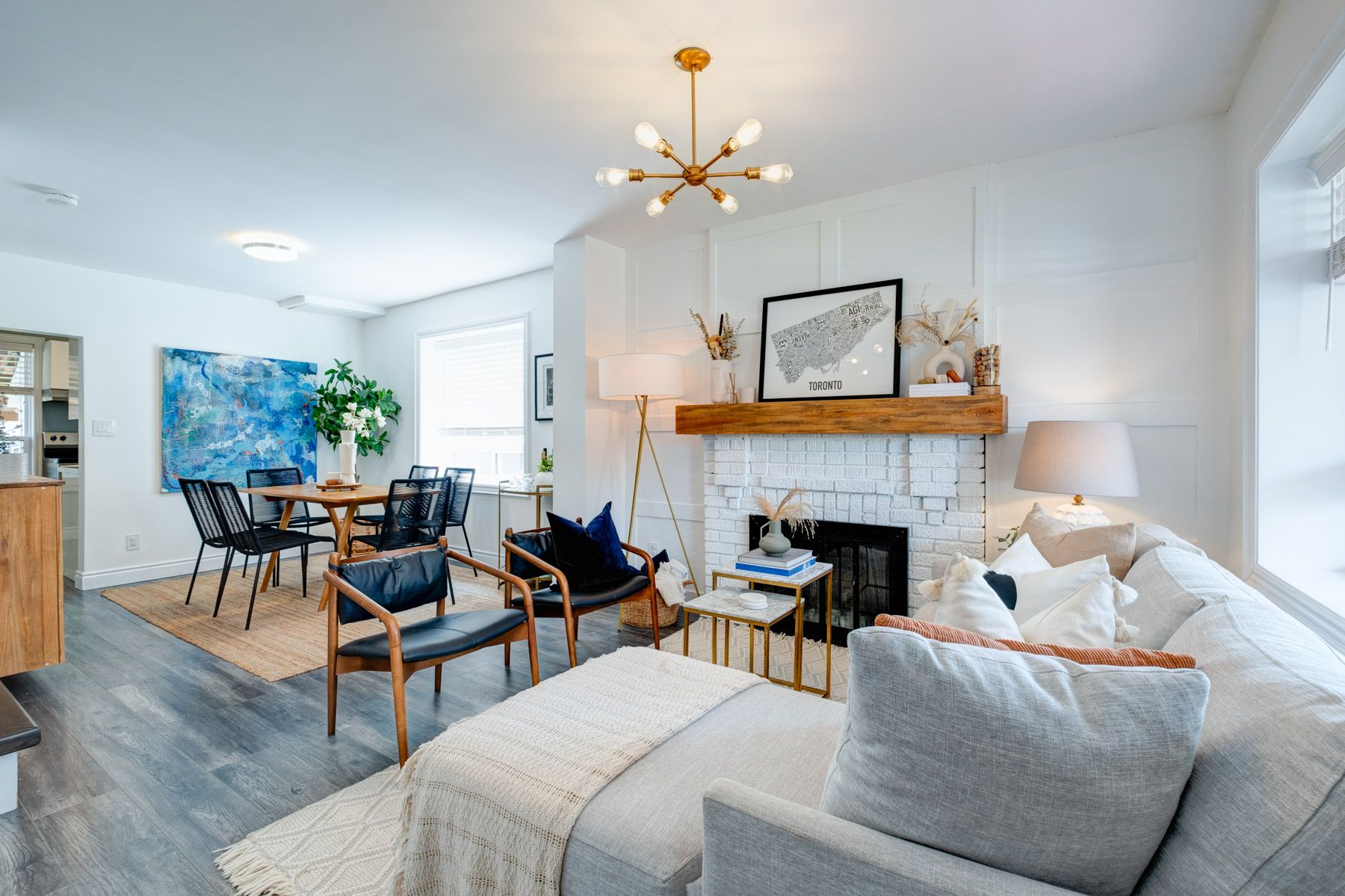 Open Concept Laminate Brick Fireplace