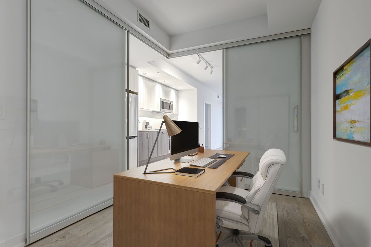 Like new unit in the Mirabella Condos 2bed + Den, 2Bath unit with parking. East facing sunrise views with balcony views of the lake, CN Tower and Humber River. 9ft ceilings, laminate floors, laundry, quartz in both baths, and a den for your office. Primary bed has en suite bath w/ glass shower doors and his/her closets. Full size kitchen with stainless steel appliances, B/I DW, glass cook top, oven, microwave range hood, quartz counters, and ample storage. 1 Parking and 1 Locker inc. Easy access to Lakeshore/Gardiner/427/QEW and Transit.New construction, Ammenaties may not all available at this time. 24/7 concierge, Outdoor Terrace, Party room, yoga studio, fitness room, indoor pool, bbq area, visitor parking. Photos are digitally staged.