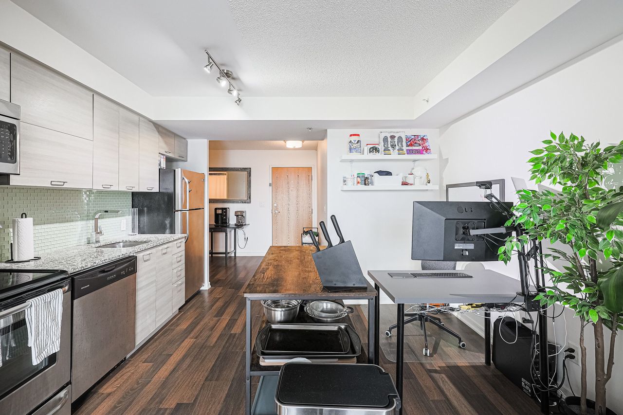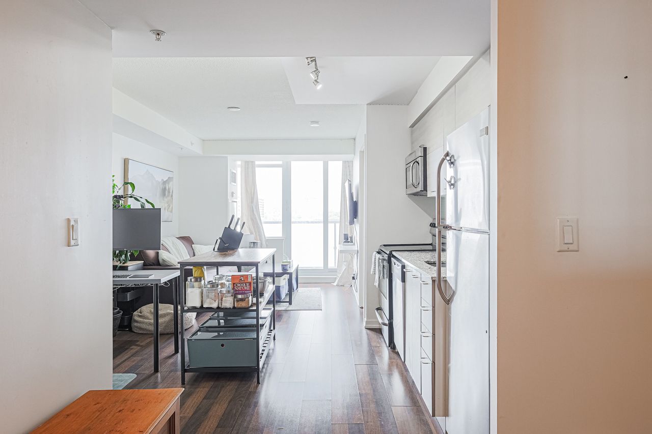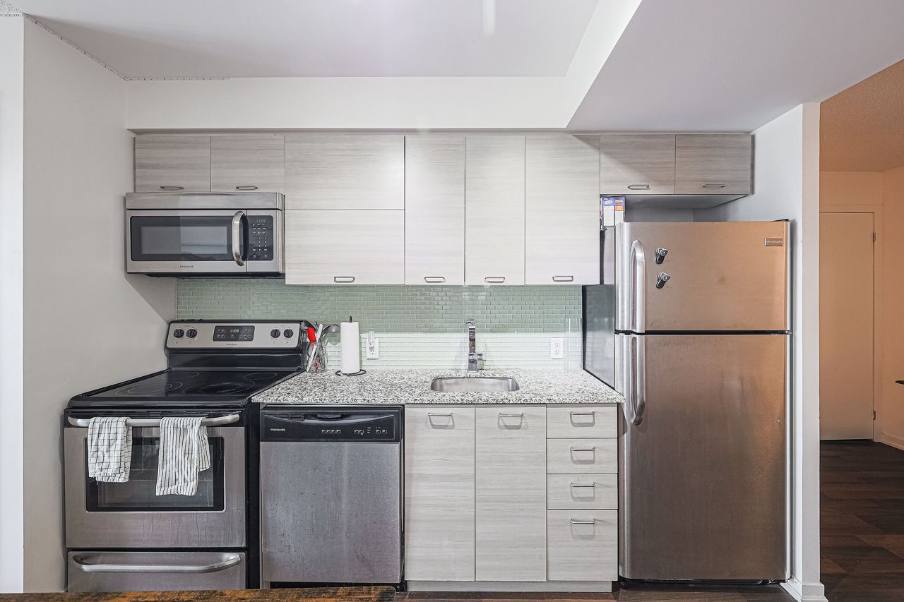 Throughout, Trendy Kitchen W Stainless Steel Appliances, Granite Countertops, Bright Western Exposure And A Locker. Includes Gym, Yoga Room, Locker Rooms, Party Room, 2 Guest Suites, Common Outdoor Terrace + Visitor Parking. Steps To Shops & Restaurants On Both King & Queen Street West As Well As Liberty Village.S/S Fridge,Stove,Microwave,Dshwshr,(New)White Stackable Washer/Dryer,All Existing Elf&Wndw